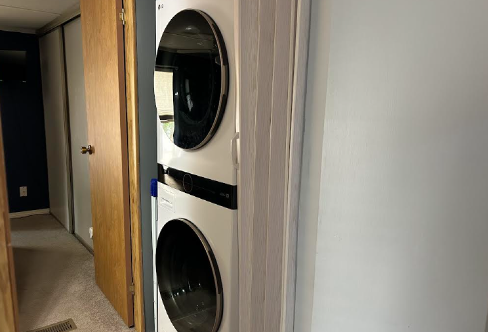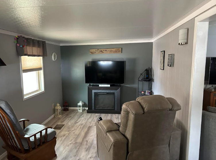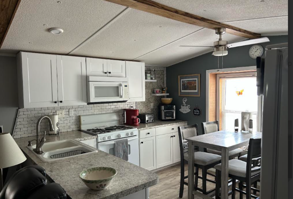 Inside, the home offers two bedrooms and one bathroom thoughtfully positioned on one end for privacy. The kitchen is located at the front of the home, highlighted by a large picture window, a gas stove, great counter space, custom backsplash, and a dedicated coffee bar. Neutral interior finishes provide a versatile backdrop for any décor style. The bathroom has been updated with a tiled walk-in shower, modern vanity, and high-rise toilet. This jewel also comes with a new A/C and heating unit, as well as a new hot water heater, making it energy efficient.