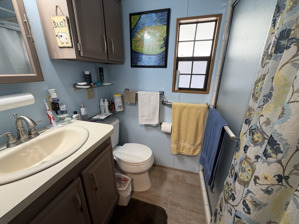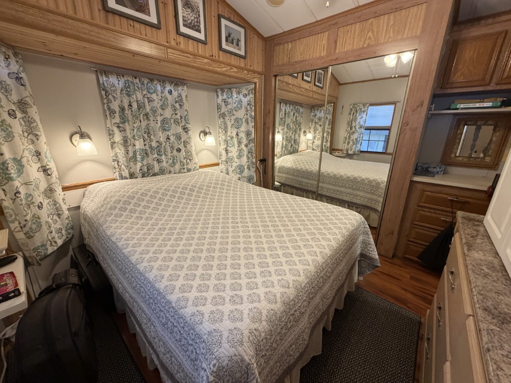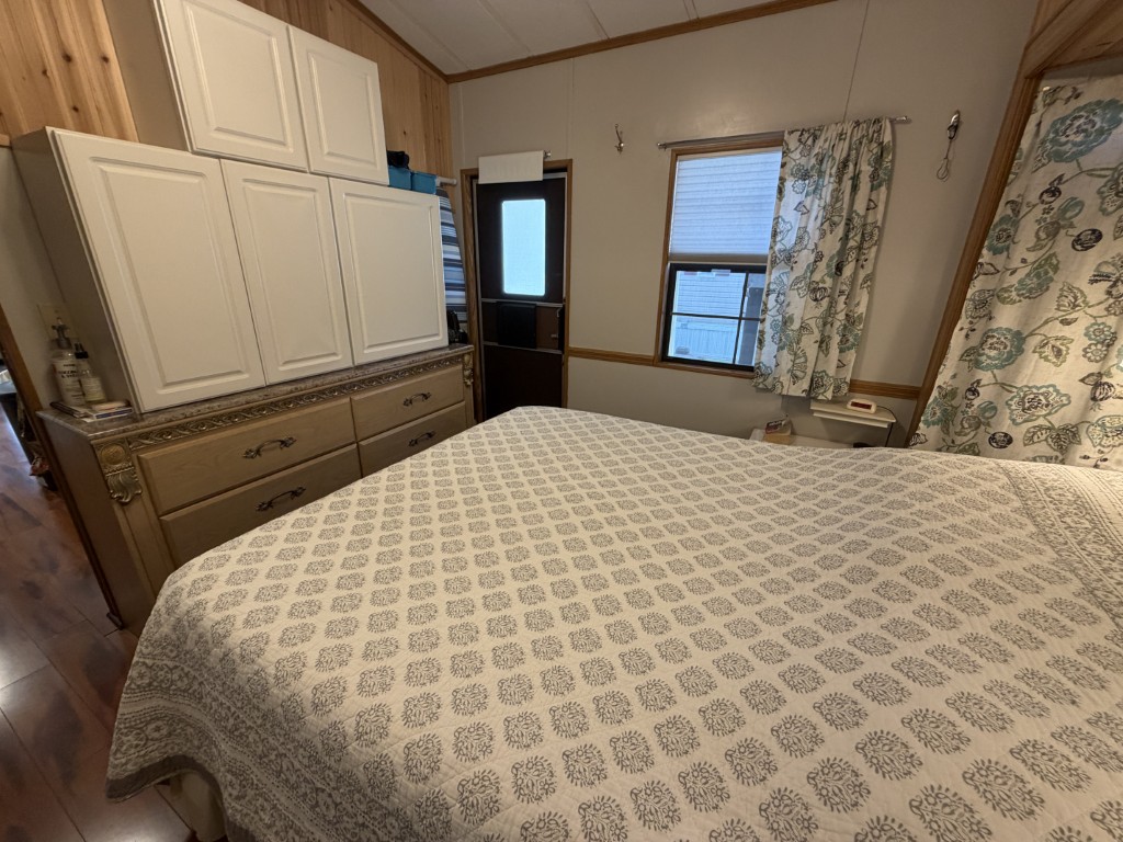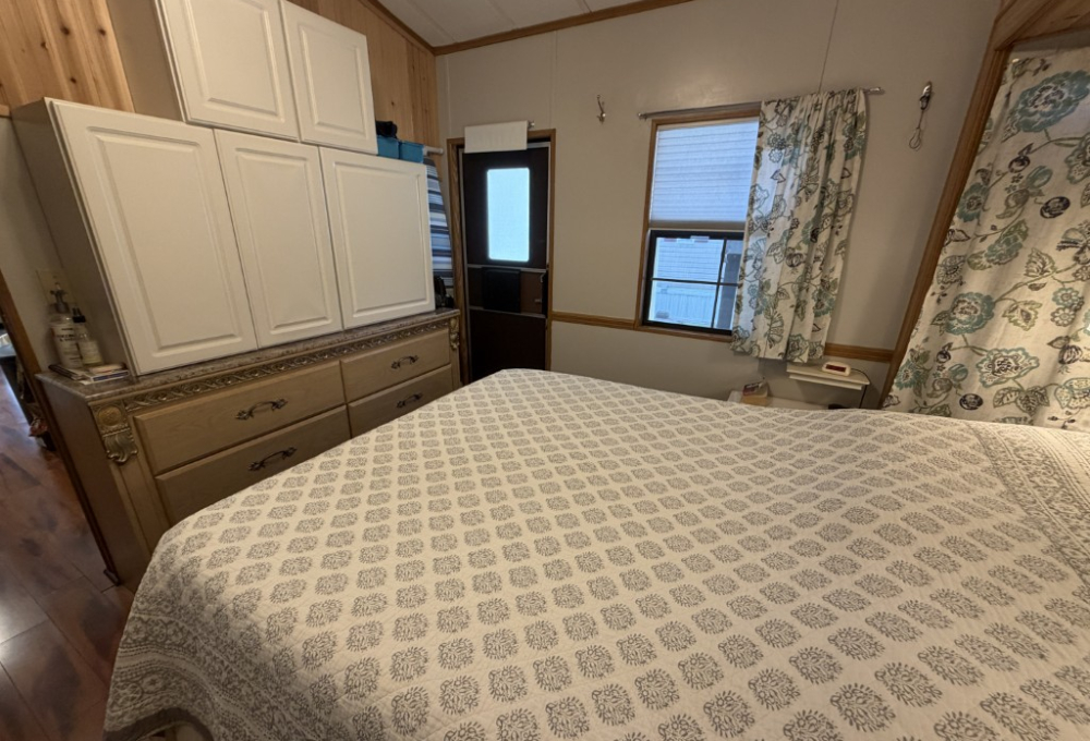 The spacious bedroom is located at the rear and offers a queen bed, dresser, mirrored closet, and newly finished woodwork. The bathroom is equipped with a walk-in shower.