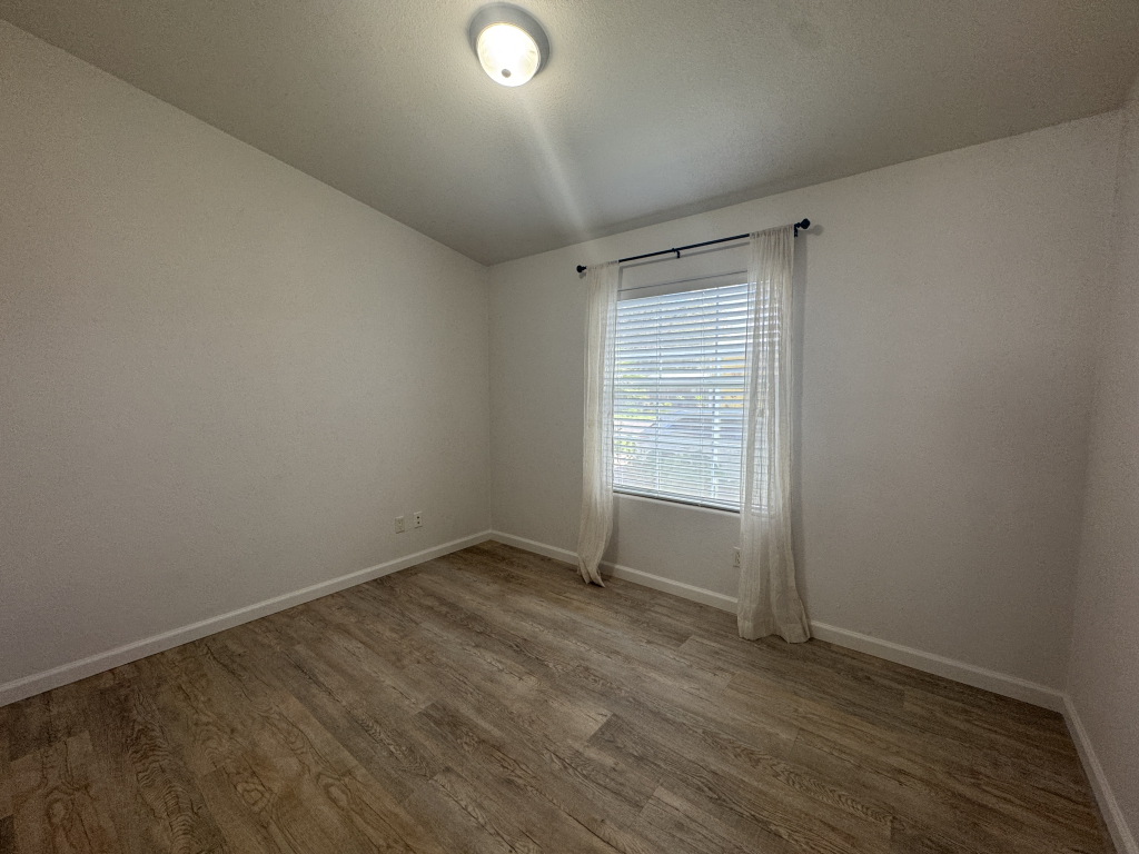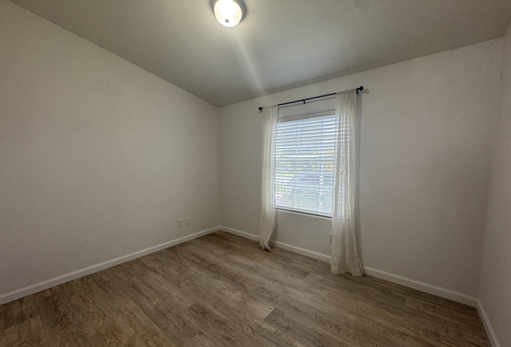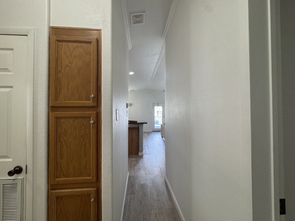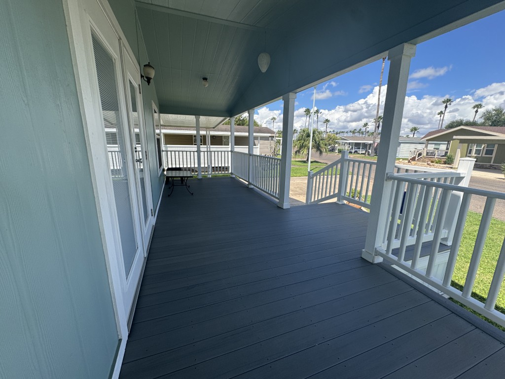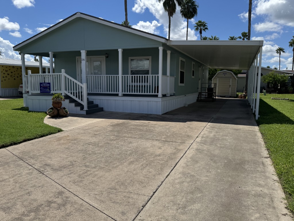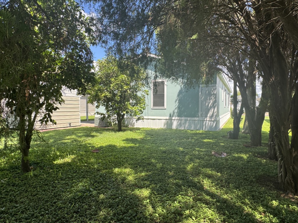 Additional features include: newer subfloor and vinyl flooring throughout, original air conditioning and heater, covered 7x24 Trek deck, 13x56 carport, 8x10 separate shed, reverse osmosis system with water conditioner, double hung windows, solar window screens on the right side, all sheetrock walls, and crown molding. The roof is four years old and has a 40-year guarantee. The backyard contains fruit and palm trees and shaded areas.