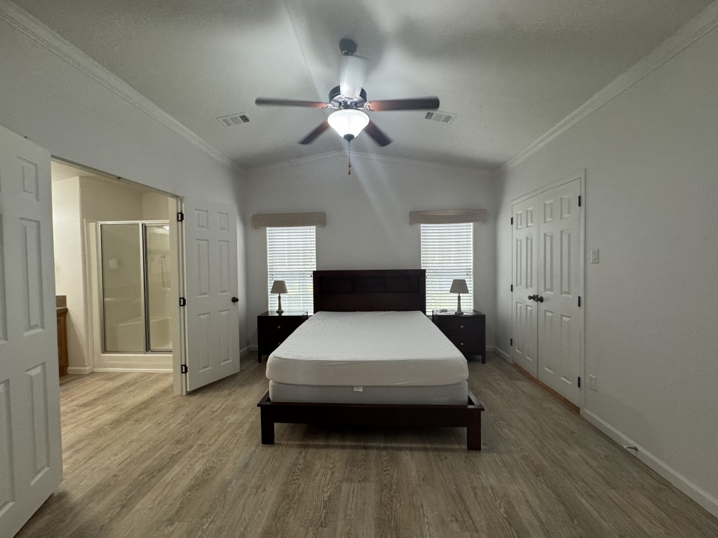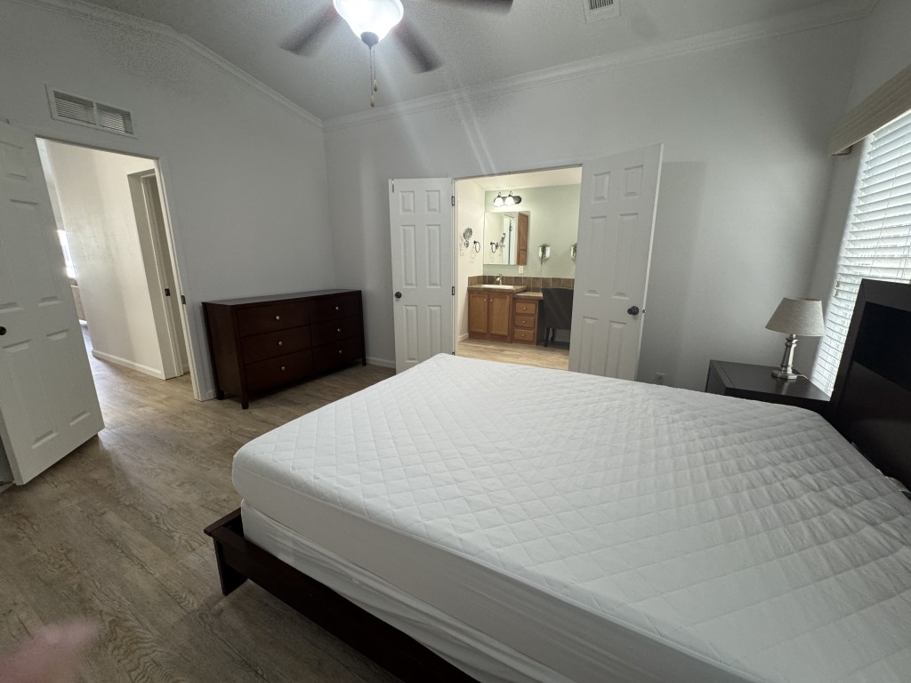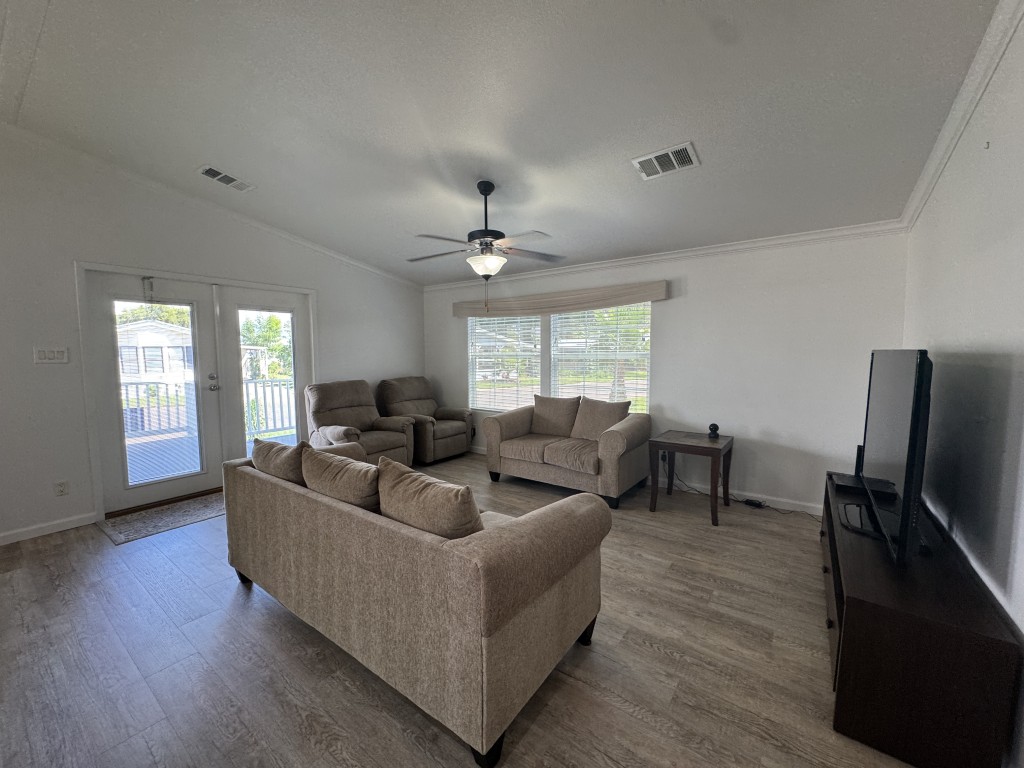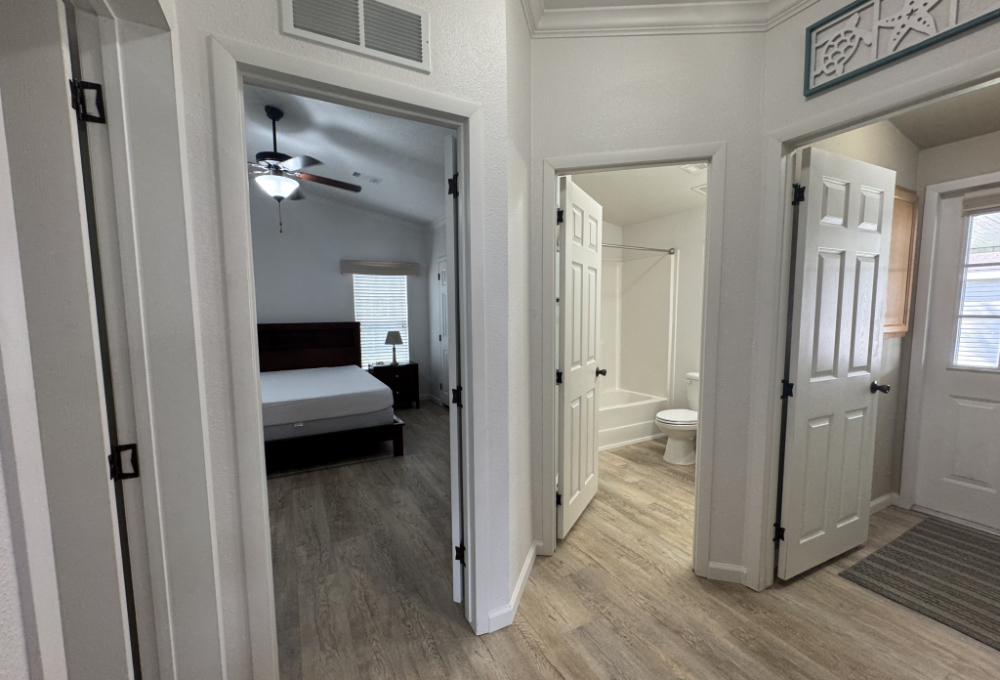 Double French Doors lead from the front deck into a remodeled living area with an open dining space and updated kitchen, featuring an island and newer appliances. The master bedroom, walk-in closet, and master en-suite with double sink vanities, walk-in shower, and separate water closet are located down the hall. The guest bedroom is situated outside the master, with another walk-in closet, and the guest bathroom is located across the hall. The laundry area includes a full-size washer/dryer and has a backdoor to the outside.