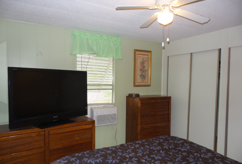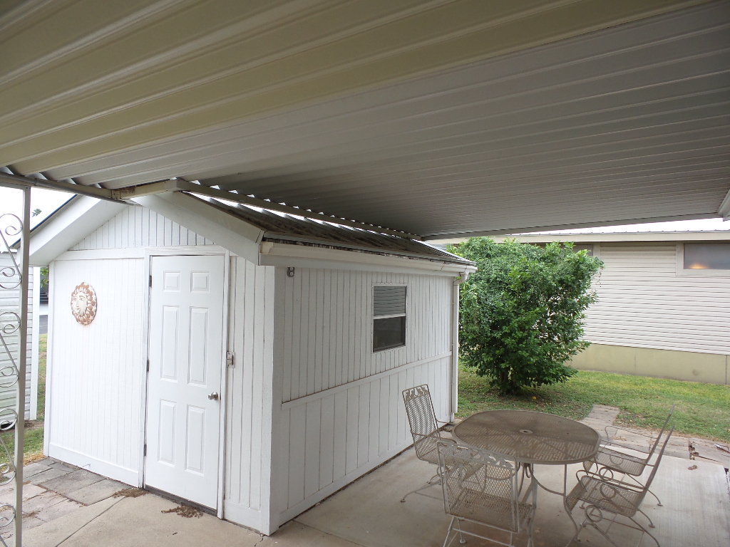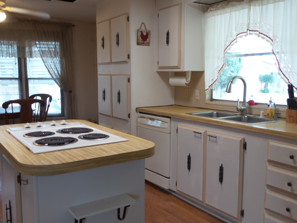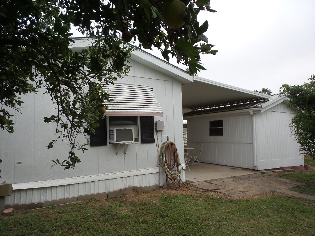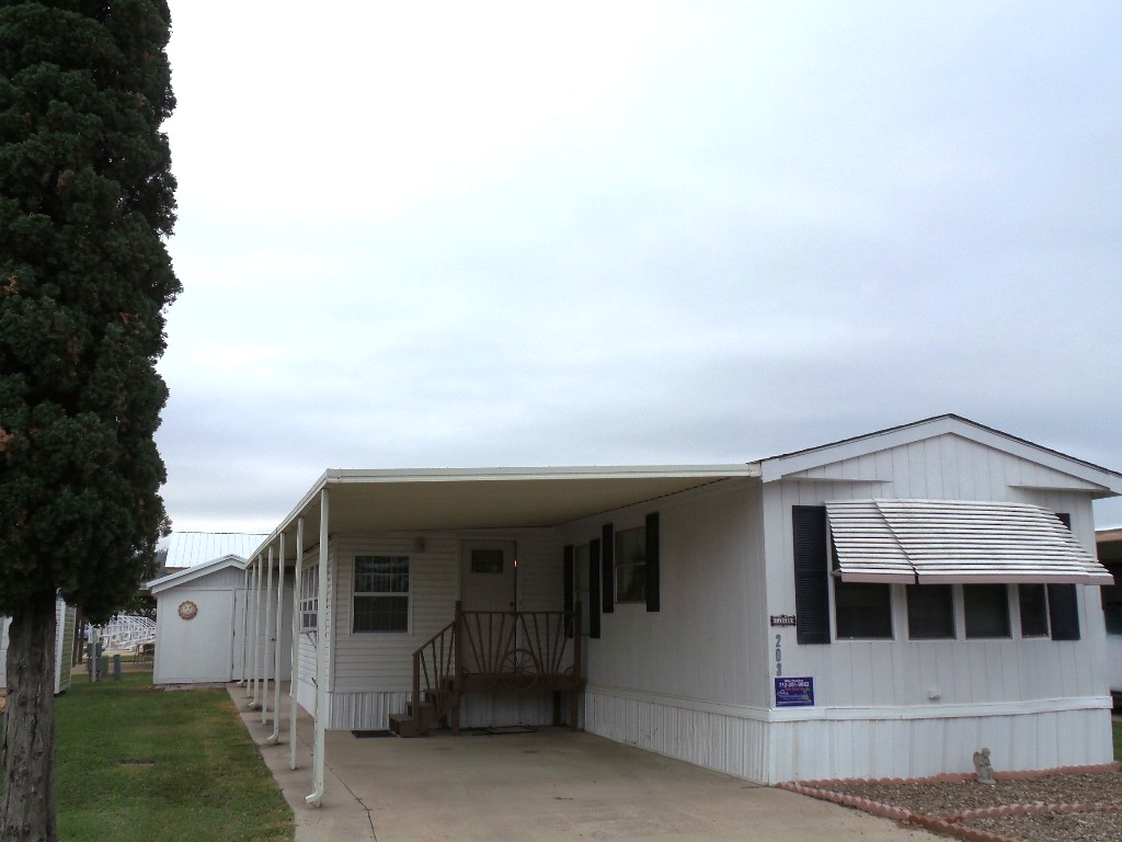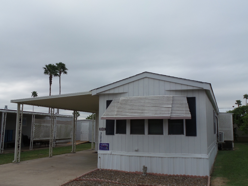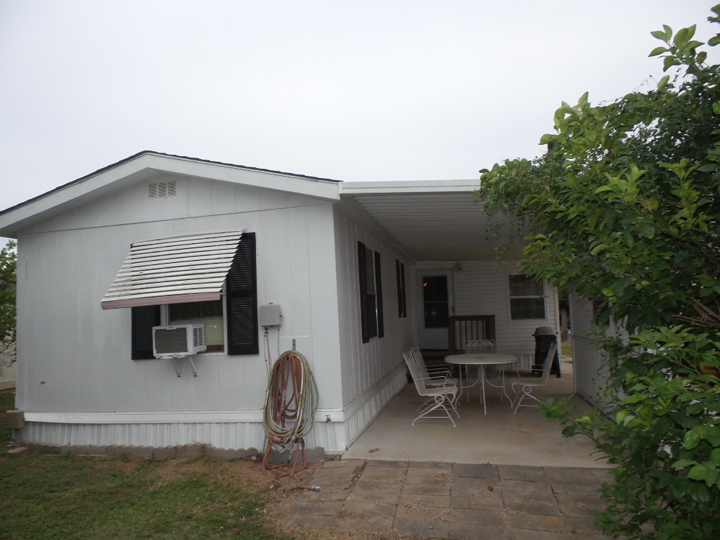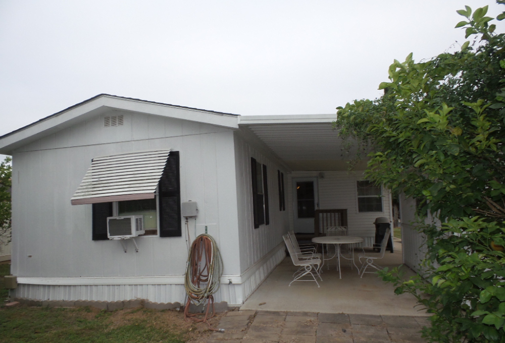 Austin American 14x66’ 2-bedroom, 1.5 bathroom Manufactured Home with Tx Rm, Patio, Deck & Carport. (924 sq ft plus Tx room adds another 220=1144 sq ft of living space.) Entering the TX Room, you are surrounded by natural light from the windows & a back door exit to the patio & shed. Also, a shortcut to the library & activities thru the backyard, beyond the Orange & grapefruit trees! An open archway leads to the Livingroom sporting a 75” TV with rattan furniture & a recliner. A front kitchen features a range top on the island, with an abundance of cabinets on both walls & a wall oven plus a microwave, in addition to the dishwasher & S/S fridge. The dining table is adjacent to the front windows with a view. Along the hallway is the dbl guest room with an en-suite ½ bathroom. Near the back door is the W/D set, across from the updated luxury bathroom, which includes a rain shower & wand, with perfect adjustable temperature shower with a barndoor style glass door. The marble top modern vanity & updated stool add elegance. The Q Master bedroom is to the back of the house with a dresser set, large closet & TV. A newer 30-year roof & W/H provides low maintenance. The yard is spacious & has citrus trees & a cypress/lawn. Cable & Wi-Fi inc with lot rent. Call Rita for a tour at 712-281-9862.