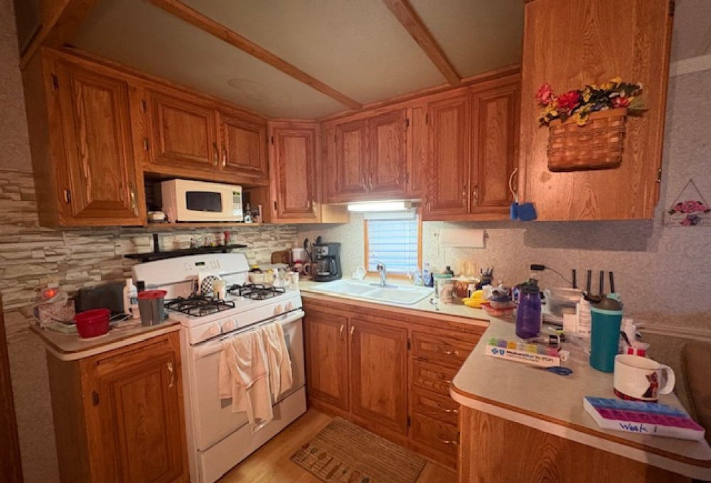 This 2000 Breckinridge park model with room addition is located in very friendly Winter Texan community of Chimney Park. You enter through the slider glass door into the living room which has sofa and chair seating plus an entertainment cabinet for TV. The kitchen has a newer full size gas stove, an abundance of cabinets, and a separate dining area with table and chairs.