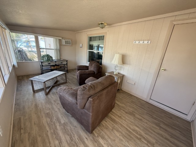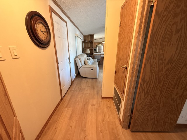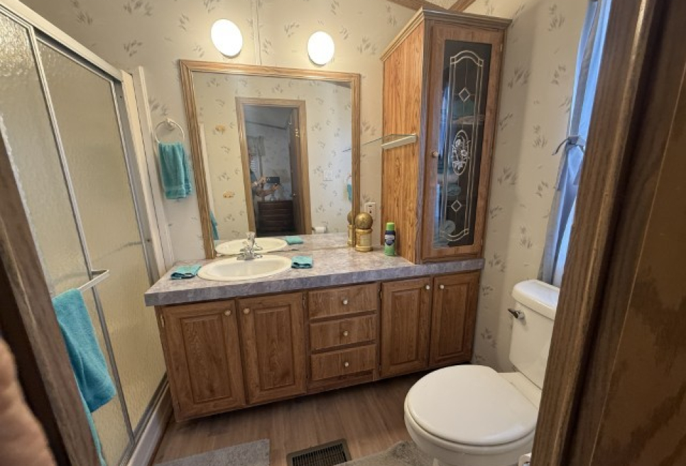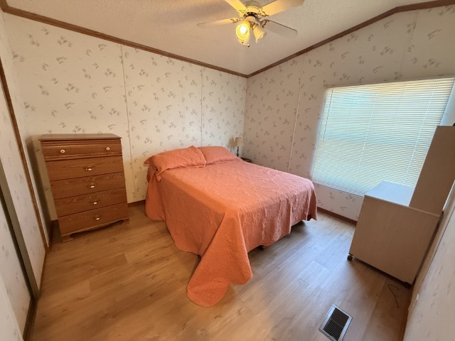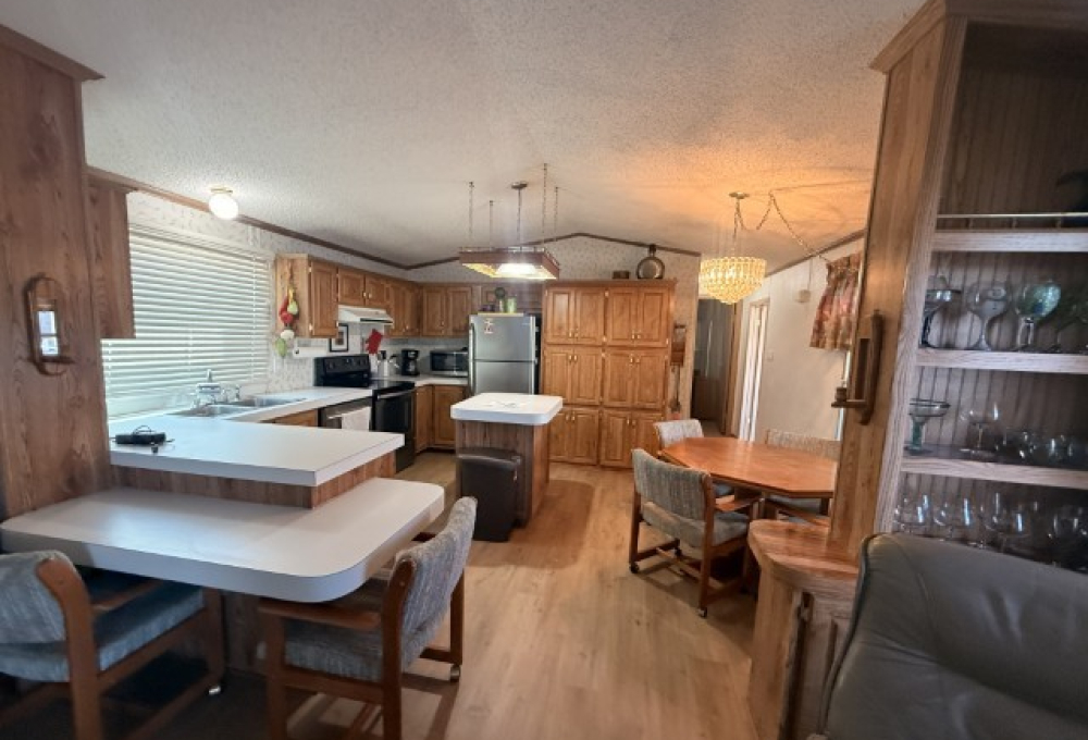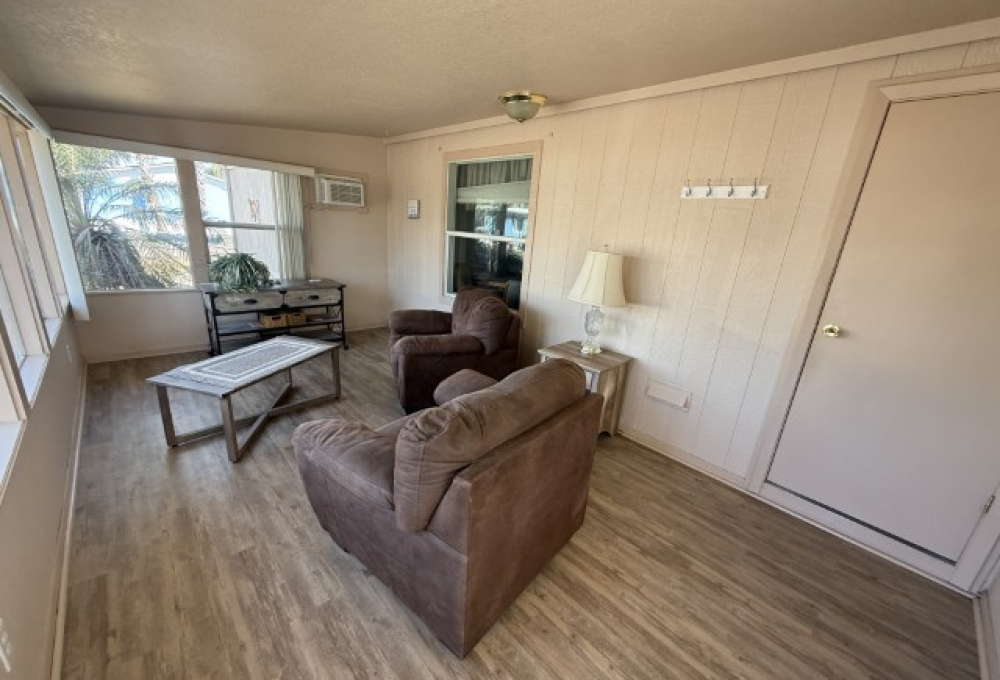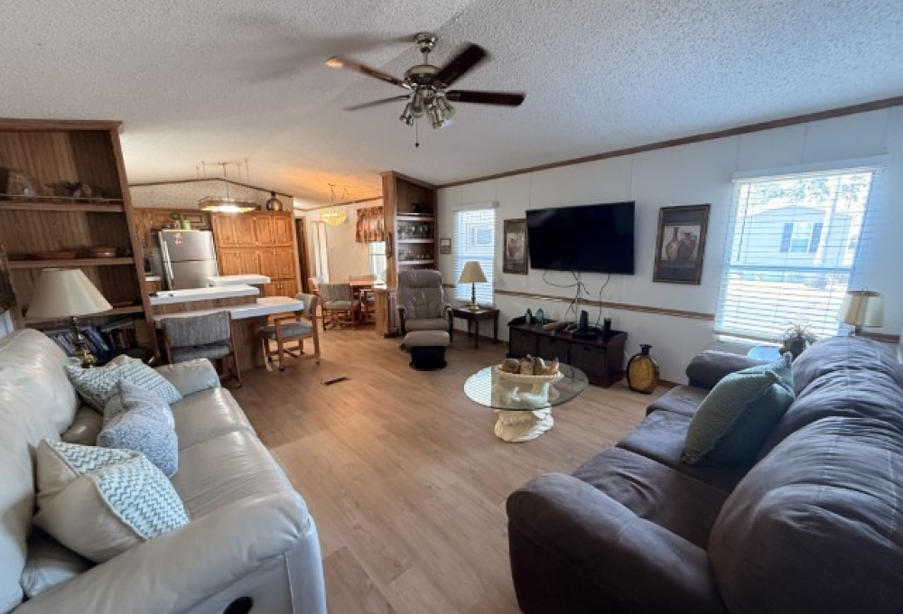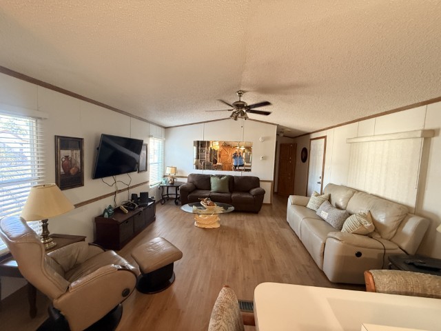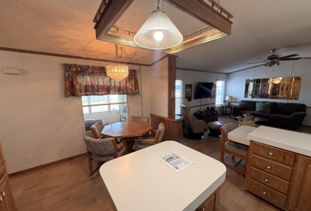 1996 Oak Creek manufactured home situated in Victoria Palms Resort. The main living area measures 16 x 60, equating to 960 square feet, with an additional 9 x 17 = 153 square feet, totaling 1,113 square feet of indoor living space. Upon entering the home, you are welcomed by the Texas Room, which is spacious with abundant natural light and features a view of a beautiful palm tree. This room leads to the main part of the home.