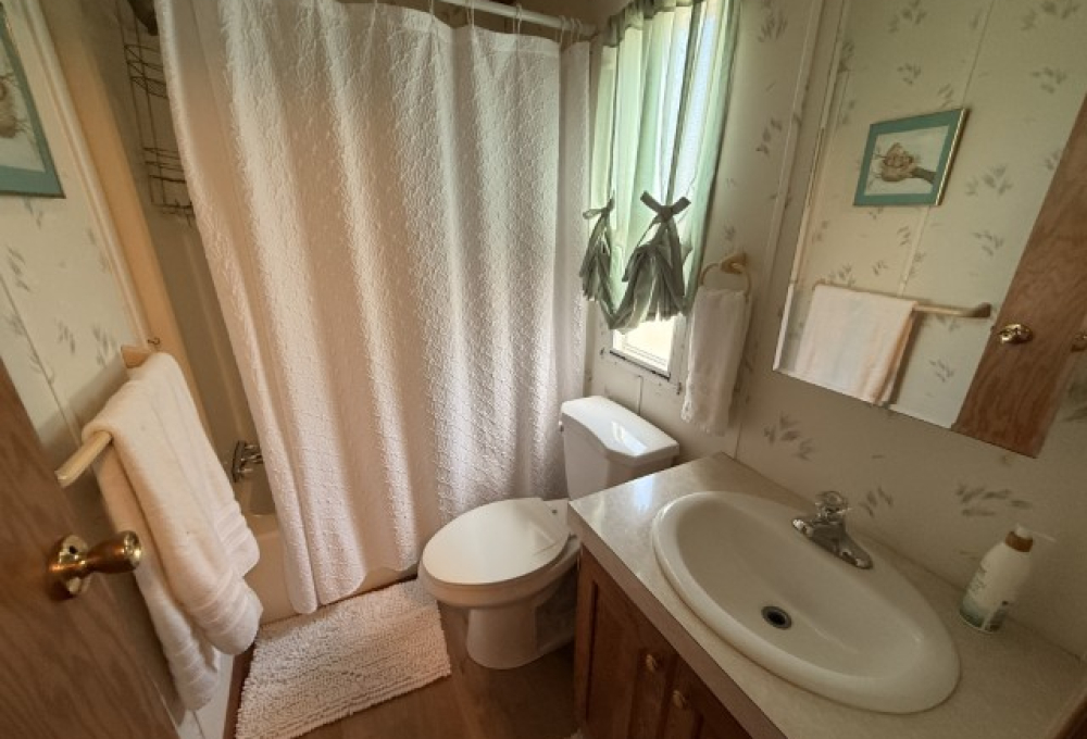 The bedrooms are positioned at opposite ends of the house, both offering ample space. The primary bedroom features an ensuite bathroom equipped with a walk-in shower, single sink vanity, commode, and considerable storage space. The guest bedroom, equally spacious, is located at the rear of the home adjacent to the guest bathroom, which includes a tub/shower combo, commode, storage, and single sink vanity. The laundry area, hidden behind bi-fold doors, is also situated at the rear of the home.