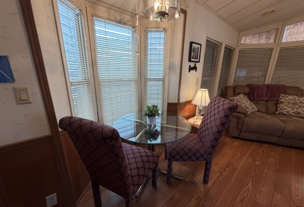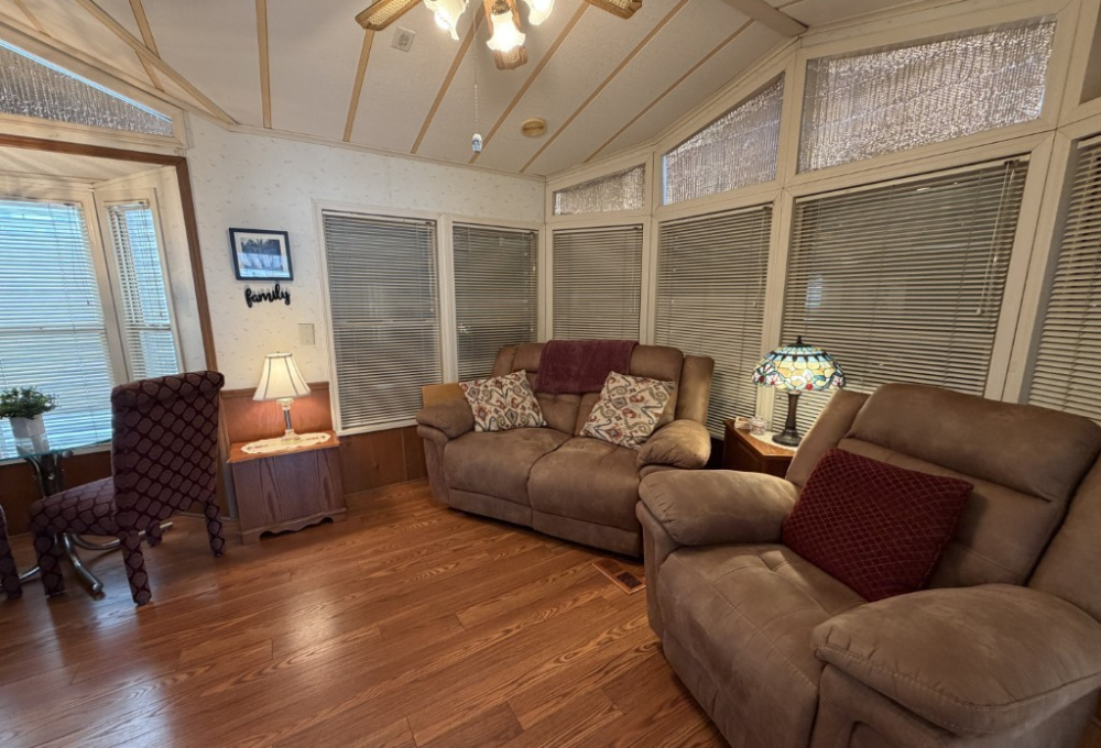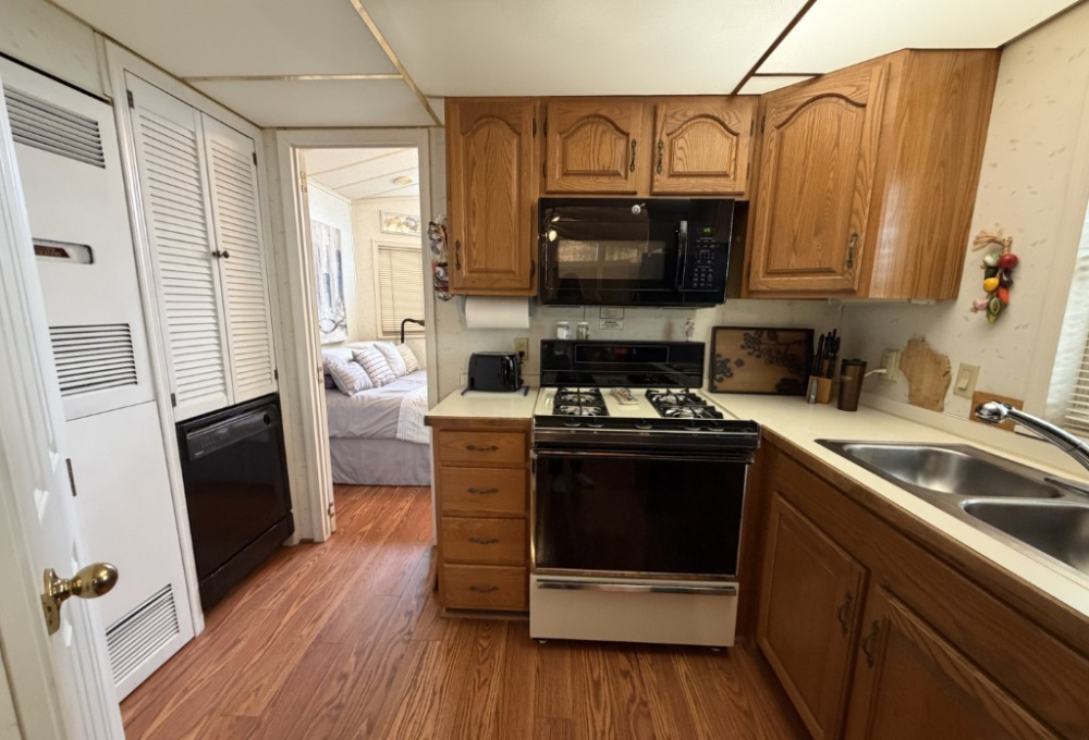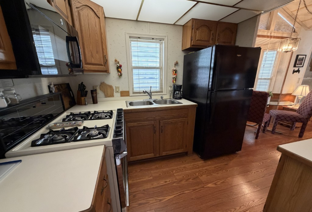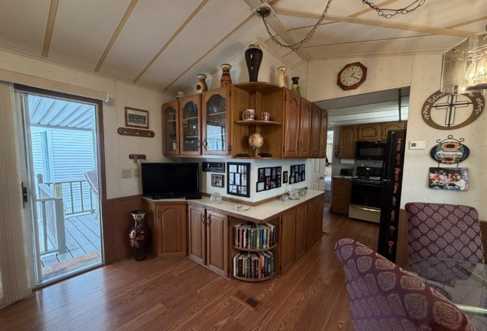 This well-maintained 1992 Sentinel Park Model offers 396 sq ft of living space with 1 bedroom and 1 bathroom. It comes fully furnished, featuring a cozy front living area with a dining space and built-in buffet. The kitchen is equipped with a gas stove, microwave, dishwasher, and a refrigerator that is only one year old. The bedroom includes a queen-size bed, a large closet, and a vanity with drawers, while the bathroom across the hall features a walk-in shower.