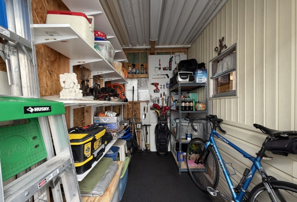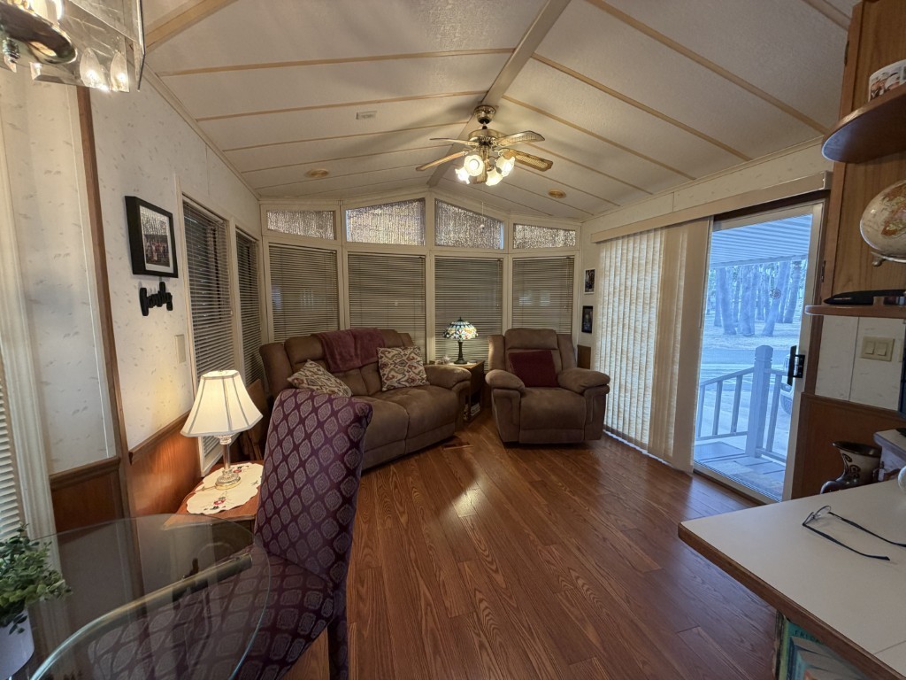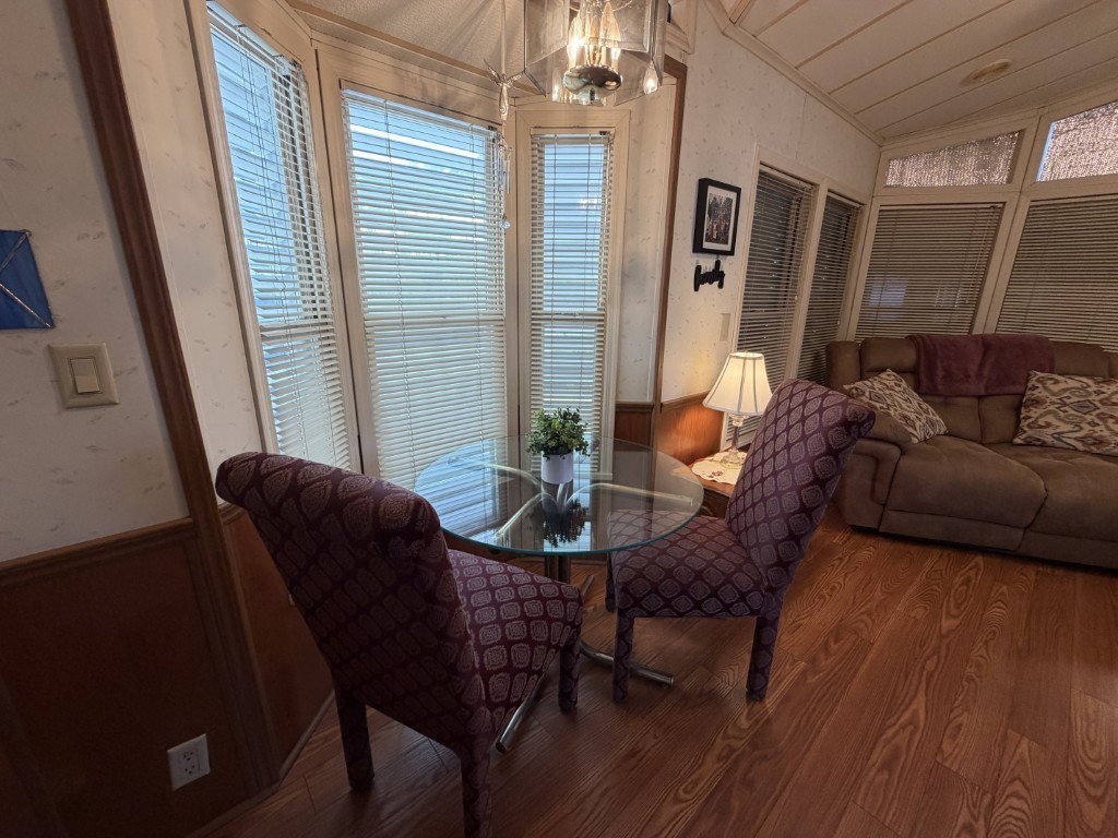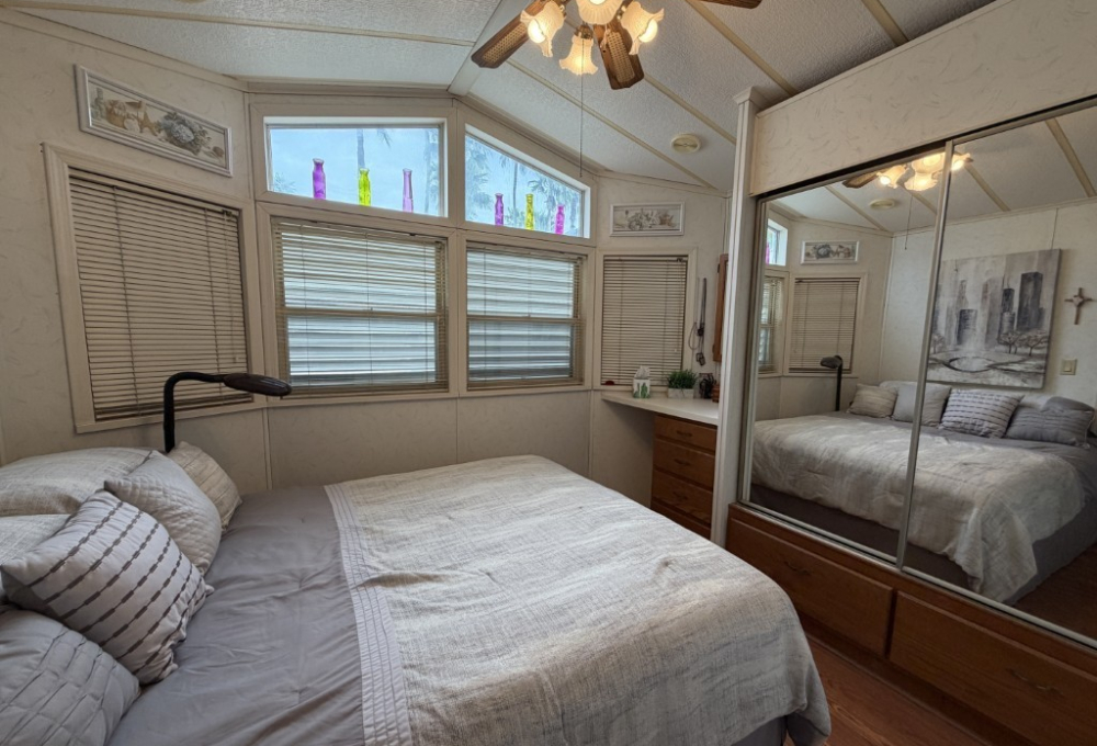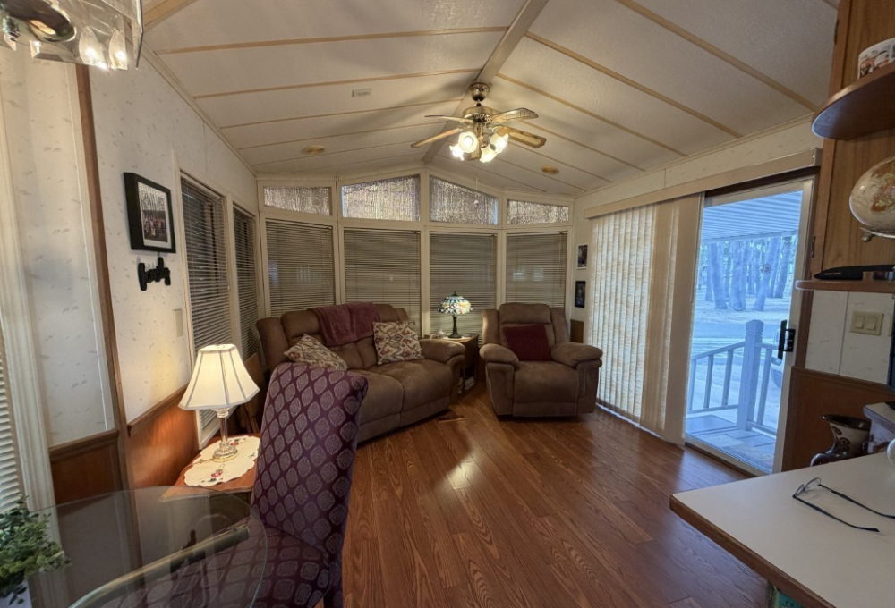 This well-maintained 1992 Sentinel Park Model offers 396 sq ft of living space with 1 bedroom and 1 bathroom. It comes fully furnished, featuring a cozy front living area with a dining space and built-in buffet. The kitchen is equipped with a gas stove, microwave, dishwasher, and a refrigerator that is only one year old. The bedroom includes a queen-size bed, a large closet, and a vanity with drawers, while the bathroom across the hall features a walk-in shower.