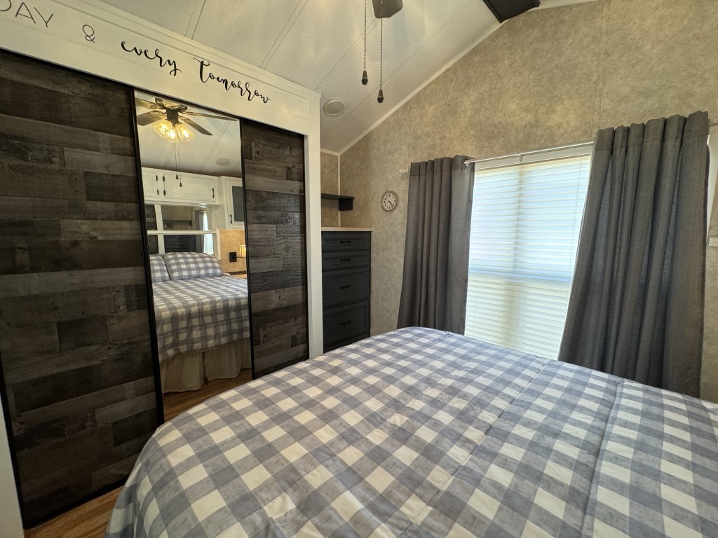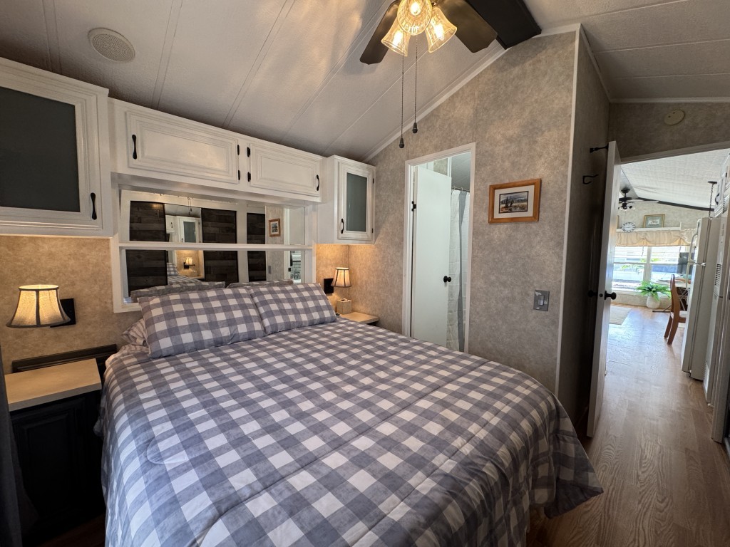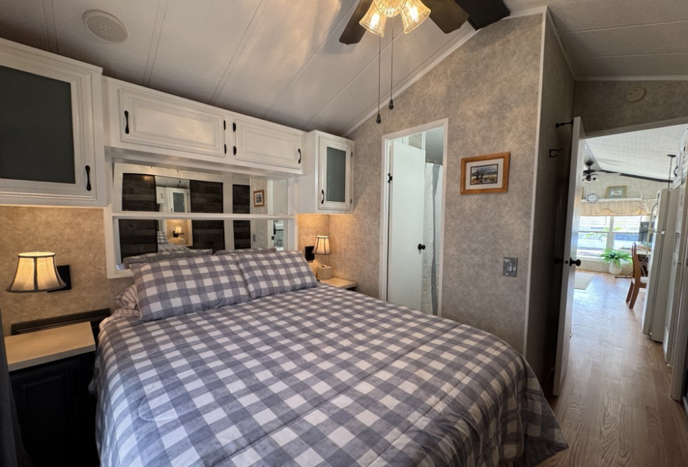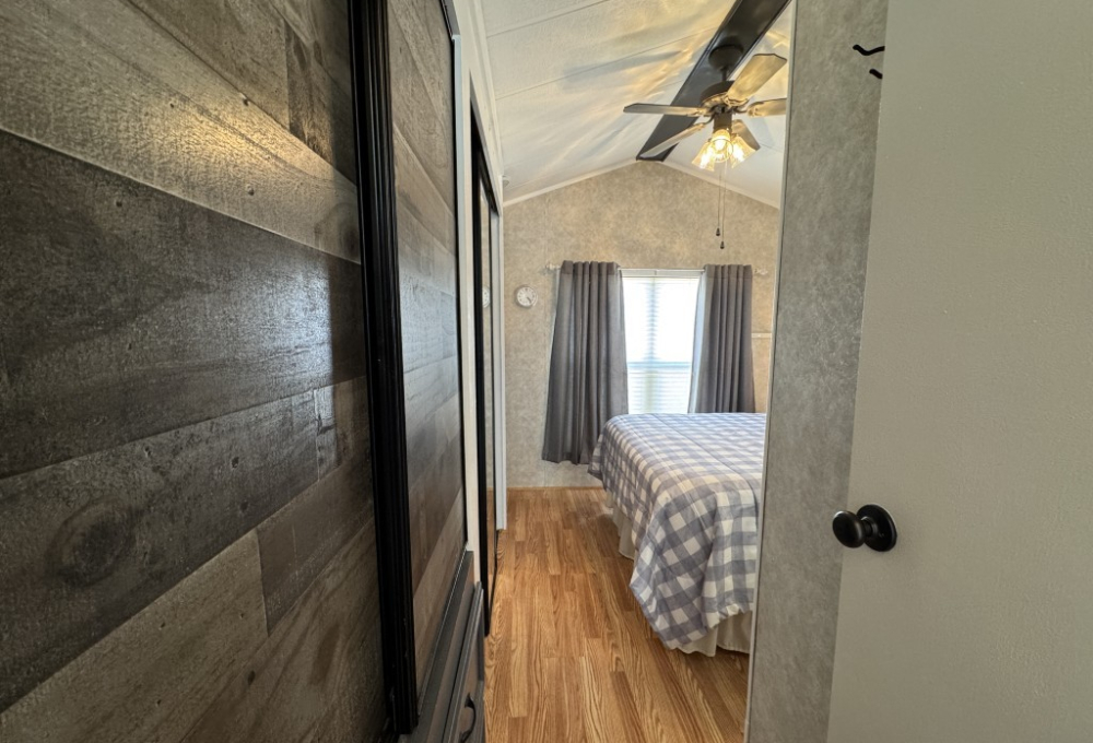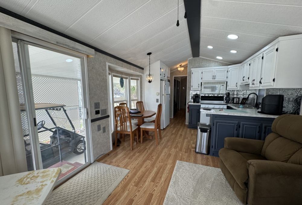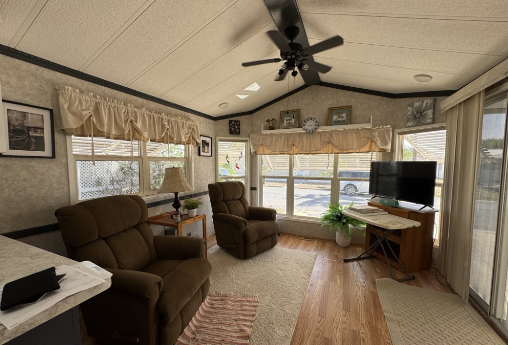 This fully furnished 1999 Breckenridge Park Model offers 396 square feet of comfortable living space, featuring one bedroom and one bathroom. The home is situated on a full slab and includes a covered carport and patio for convenient outdoor living. Inside, you’ll find a queen bed in the bedroom, cathedral ceilings, and thermal windows for added comfort. The property comes equipped with vinyl floors throughout, a washer and dryer, an electric hot water heater, and a gas stove. Additional kitchen appliances include a microwave and refrigerator.