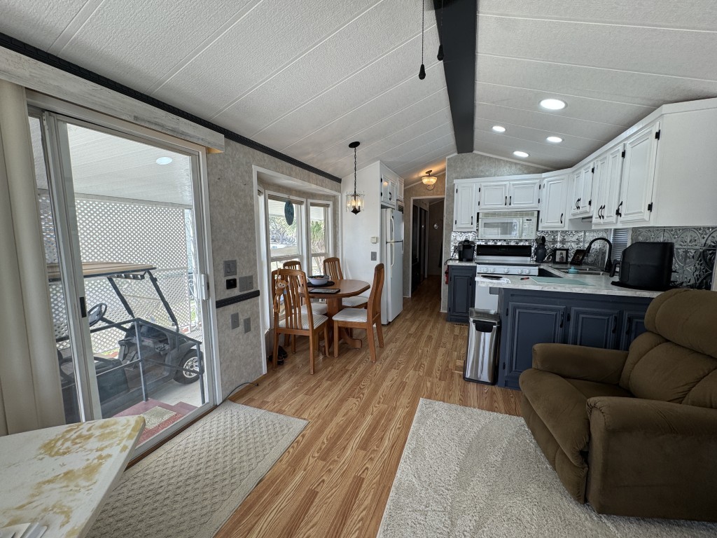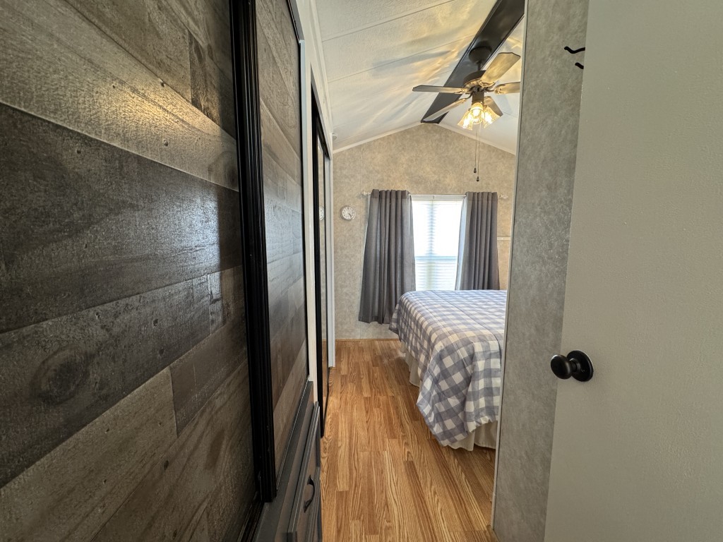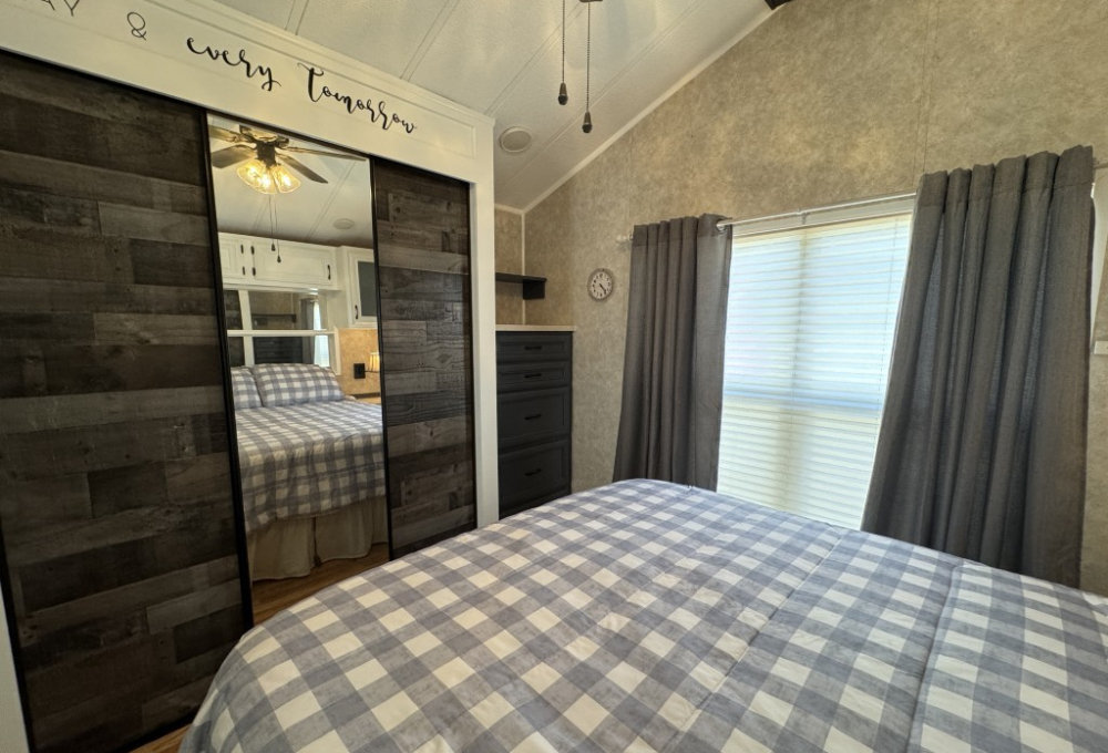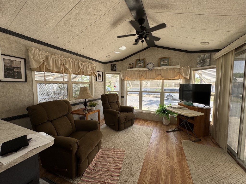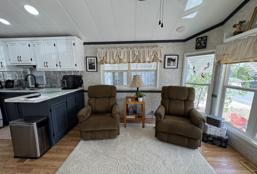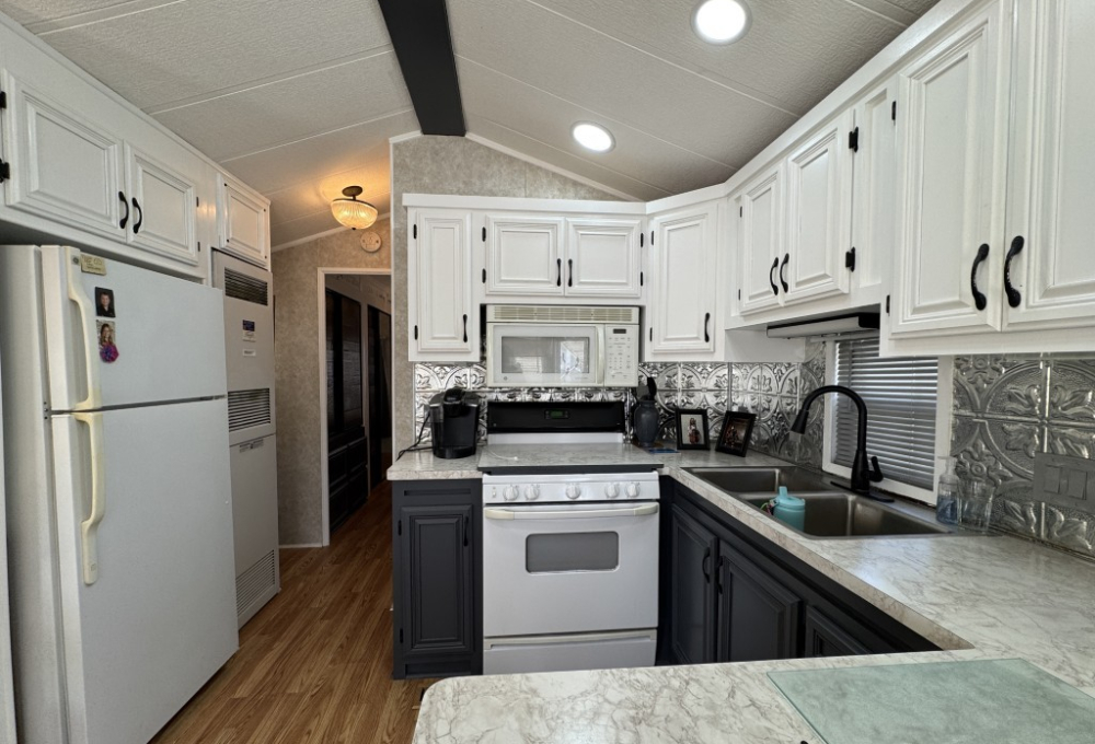 This fully furnished 1999 Breckenridge Park Model offers 396 square feet of comfortable living space, featuring one bedroom and one bathroom. The home is situated on a full slab and includes a covered carport and patio for convenient outdoor living. Inside, you’ll find a queen bed in the bedroom, cathedral ceilings, and thermal windows for added comfort. The property comes equipped with vinyl floors throughout, a washer and dryer, an electric hot water heater, and a gas stove. Additional kitchen appliances include a microwave and refrigerator.