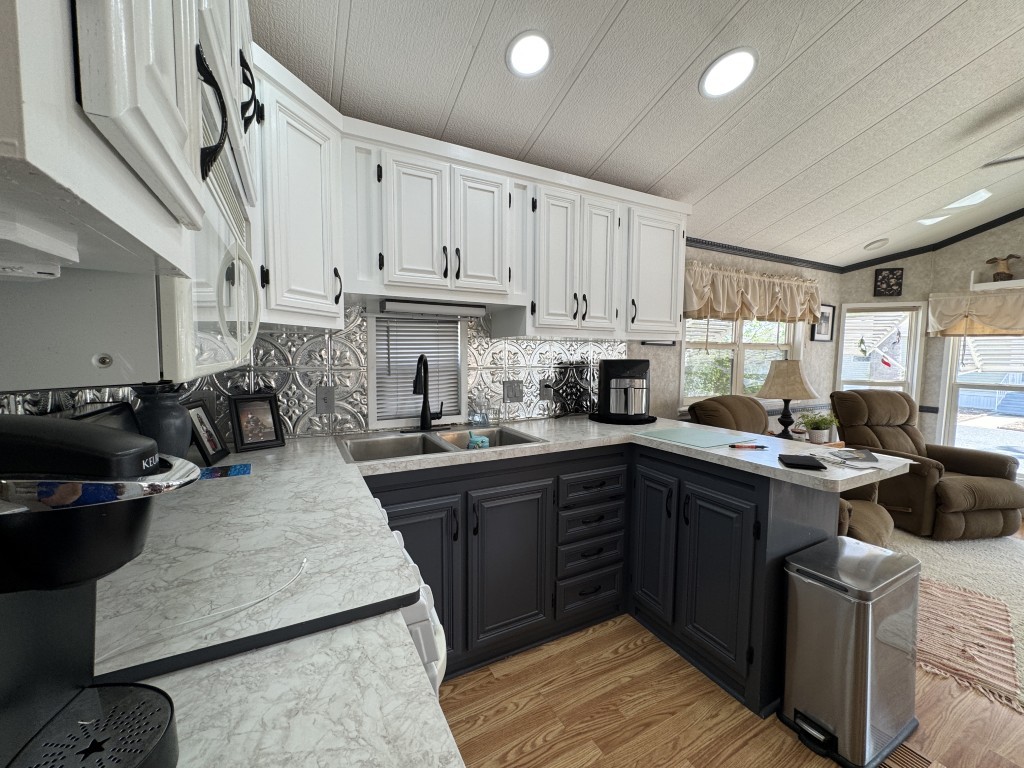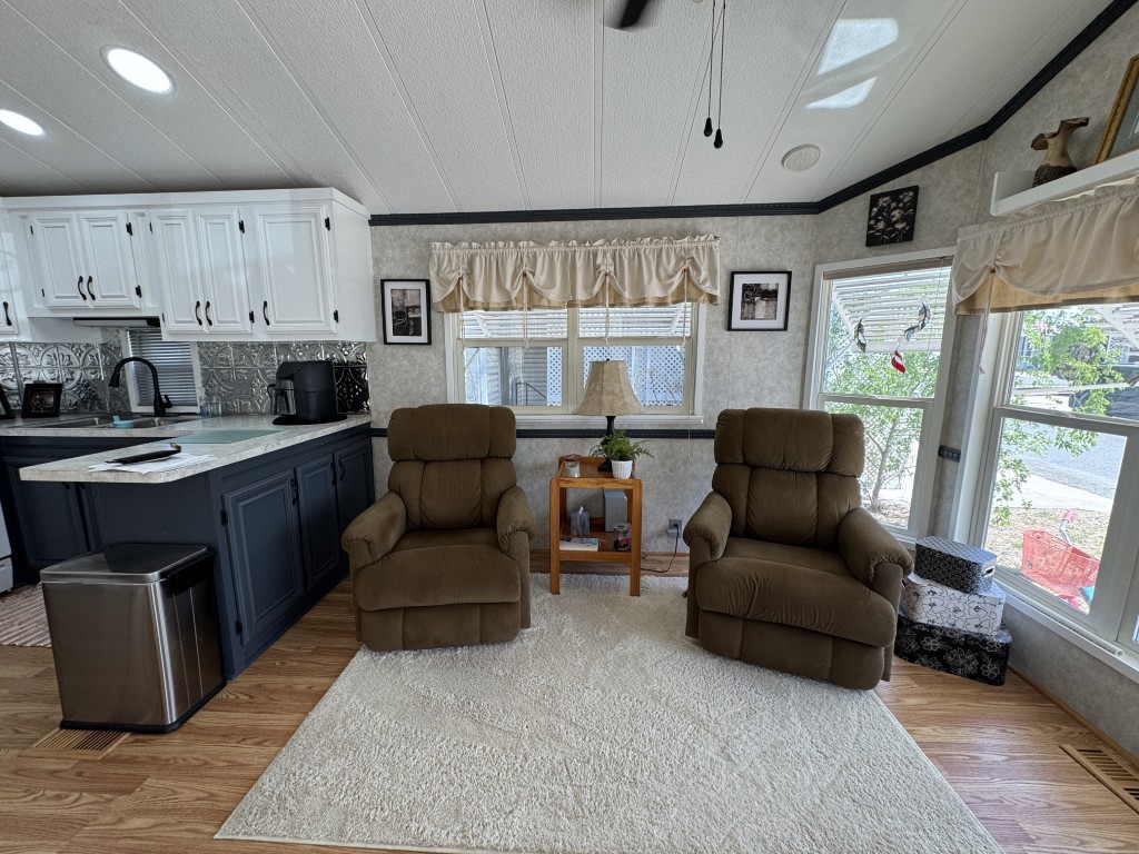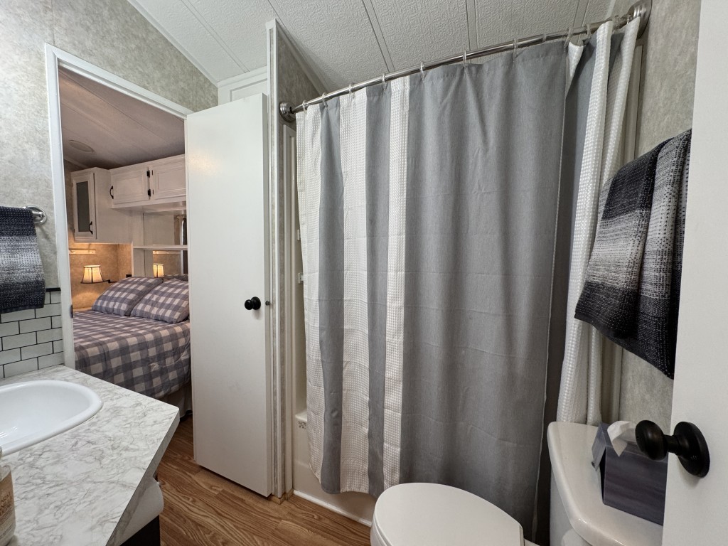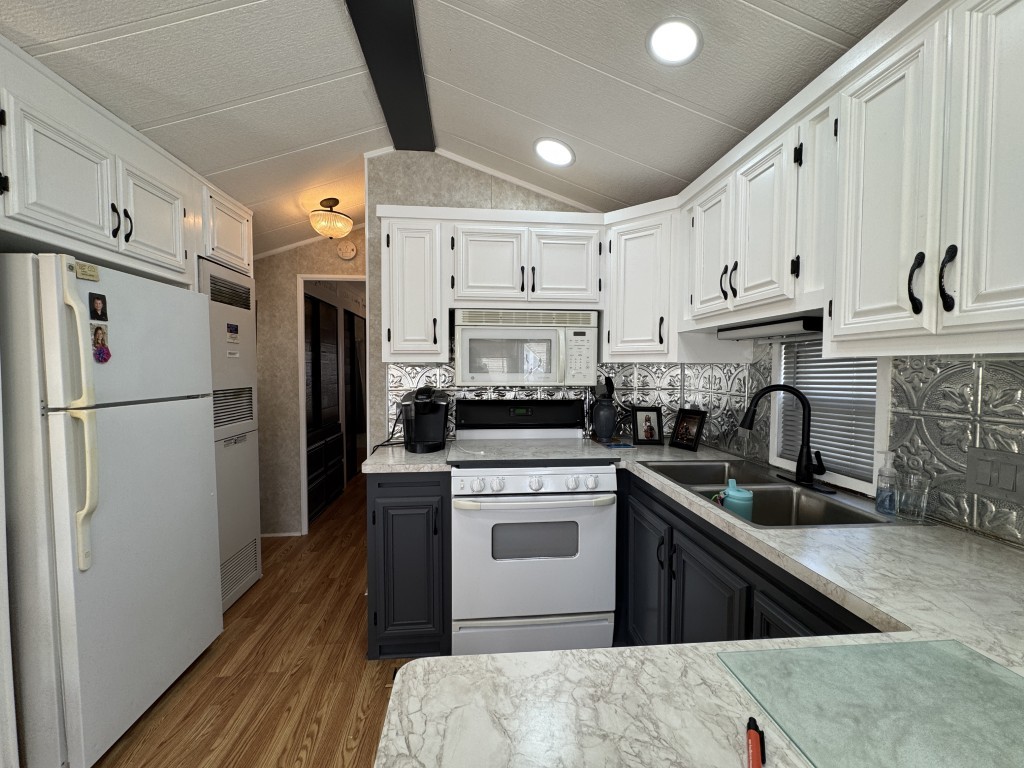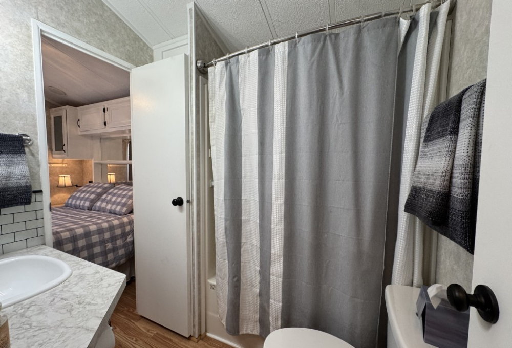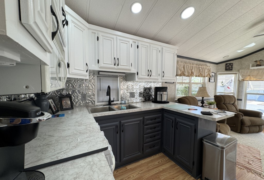 This fully furnished 1999 Breckenridge Park Model offers 396 square feet of comfortable living space, featuring one bedroom and one bathroom. The home is situated on a full slab and includes a covered carport and patio for convenient outdoor living. Inside, you’ll find a queen bed in the bedroom, cathedral ceilings, and thermal windows for added comfort. The property comes equipped with vinyl floors throughout, a washer and dryer, an electric hot water heater, and a gas stove. Additional kitchen appliances include a microwave and refrigerator.