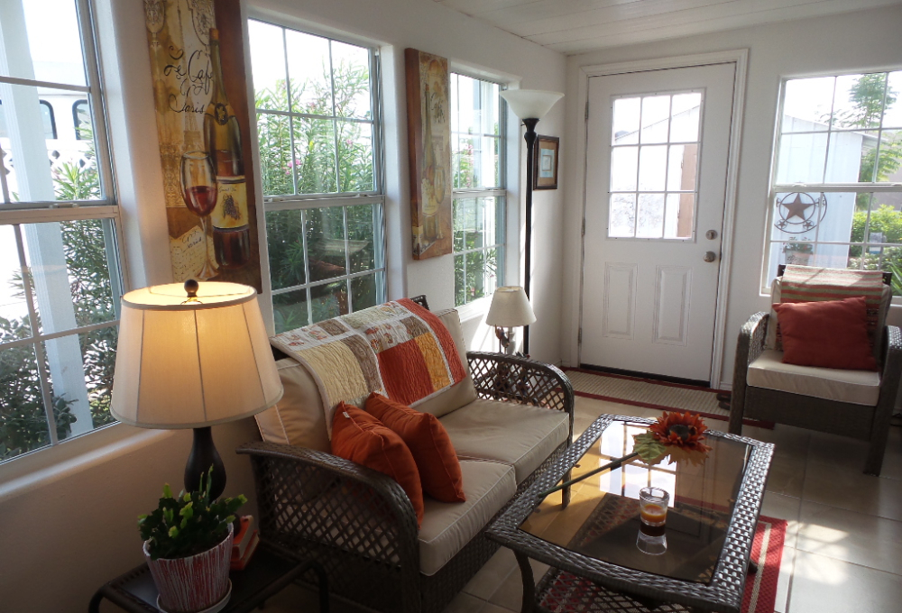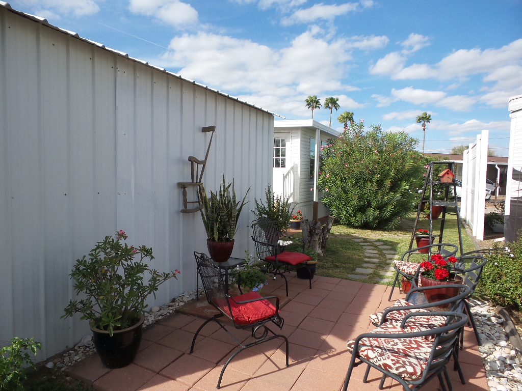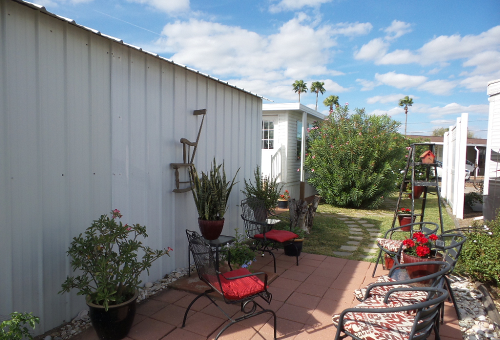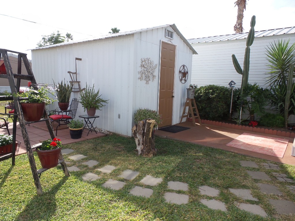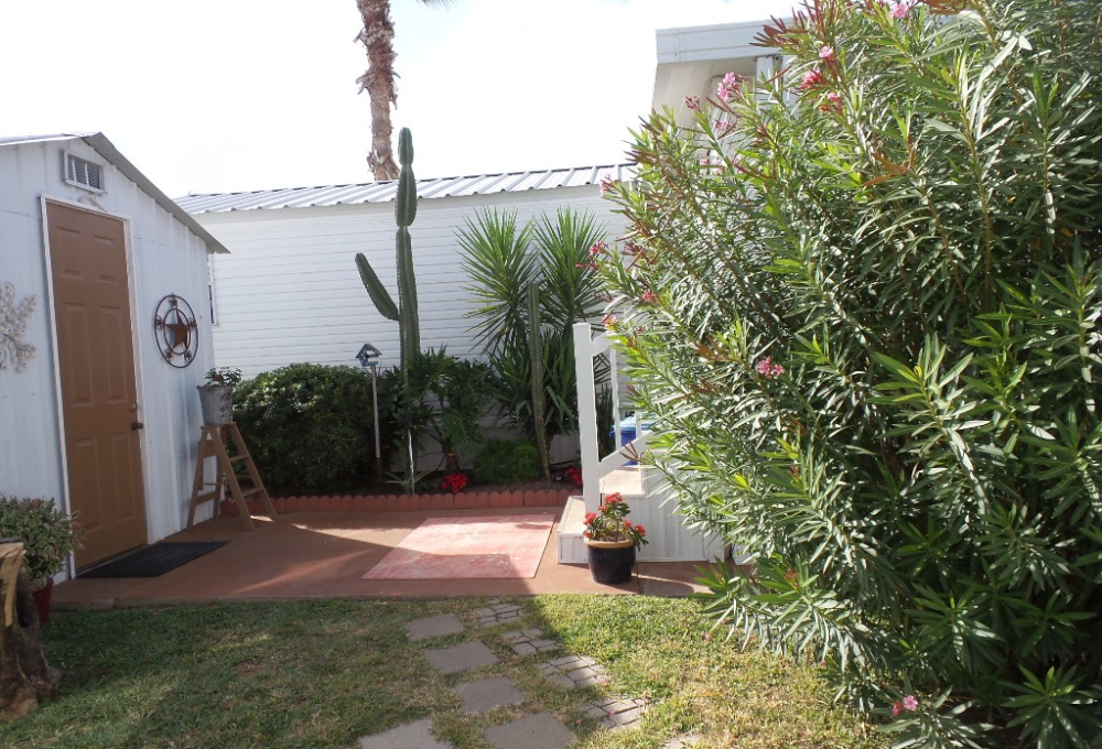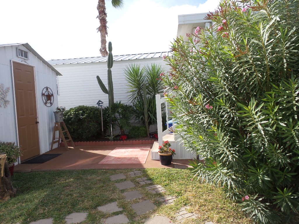American Homestar 2-bedroom, 2-bathroom, Manufactured home 2007 16x60’ +12x16’ Tx room=1127 sq ft of living space. Driving up to this tropical oasis you see an inviting deck to enjoy the TX weather outside, or inside this lovely TX room! Entering the Livingroom you note matched reclining leather furniture upon LVP flooring, with bar stools towards the front kitchen. It has an abundance of oak cabinets featuring tiled countertops & backsplash with ceramic tiled floors. Updated newer appliances include the dishwasher & flat-top stove an overhead microwave, with a side/side fridge near the table, adjacent to the panoramic front windows. Along the hallway is access to the TX room with surrounding thermal windows & relaxing patio furniture with great views of the outdoor plants. An exit door goes to the quaint back patio area & shed, as well. The main T/S bathroom is between the guest & master bedroom, near the new W & D. The Q master ensuite bedroom/set is at the back of the home with XL mirrored closet/drawers. The M bathroom has a walk-in shower & dual sinks with extra cabinets. This lovely home has textured & pristine painted walls, & is energy efficient/low maintenance with sunscreens, steel roof, new/updated appliances & brand-new W/H. A must see for all the great outdoor/indoor spaces! Call Rita>712-281-9862 Tour.