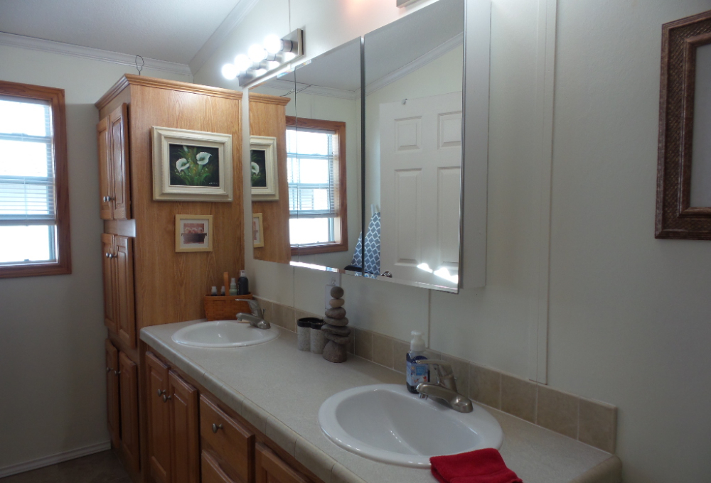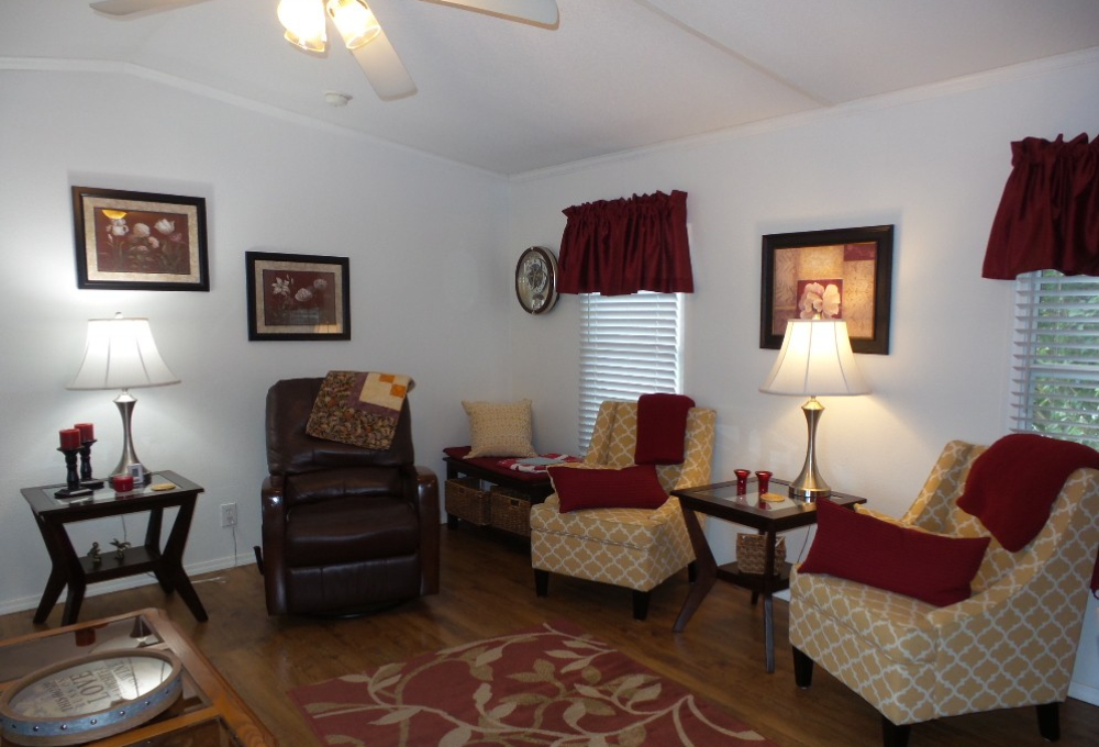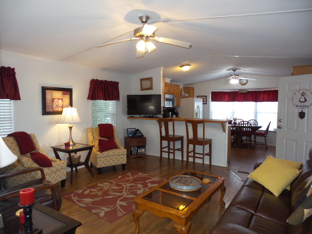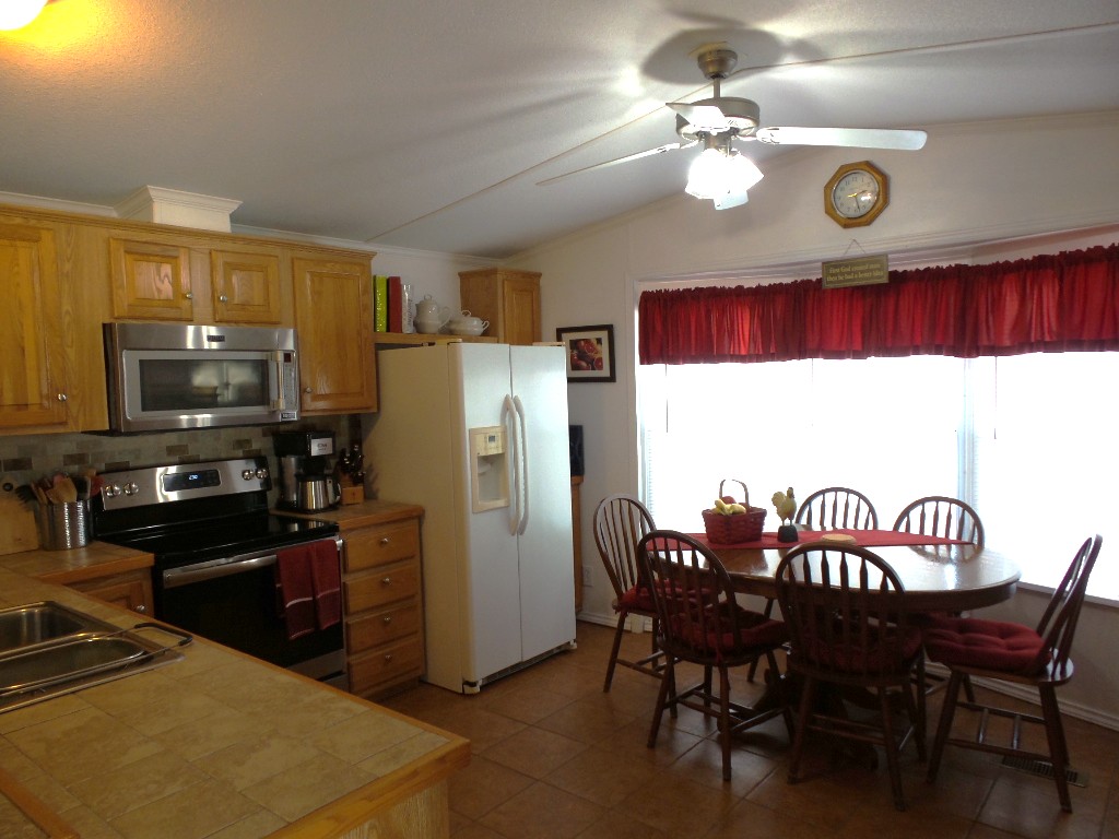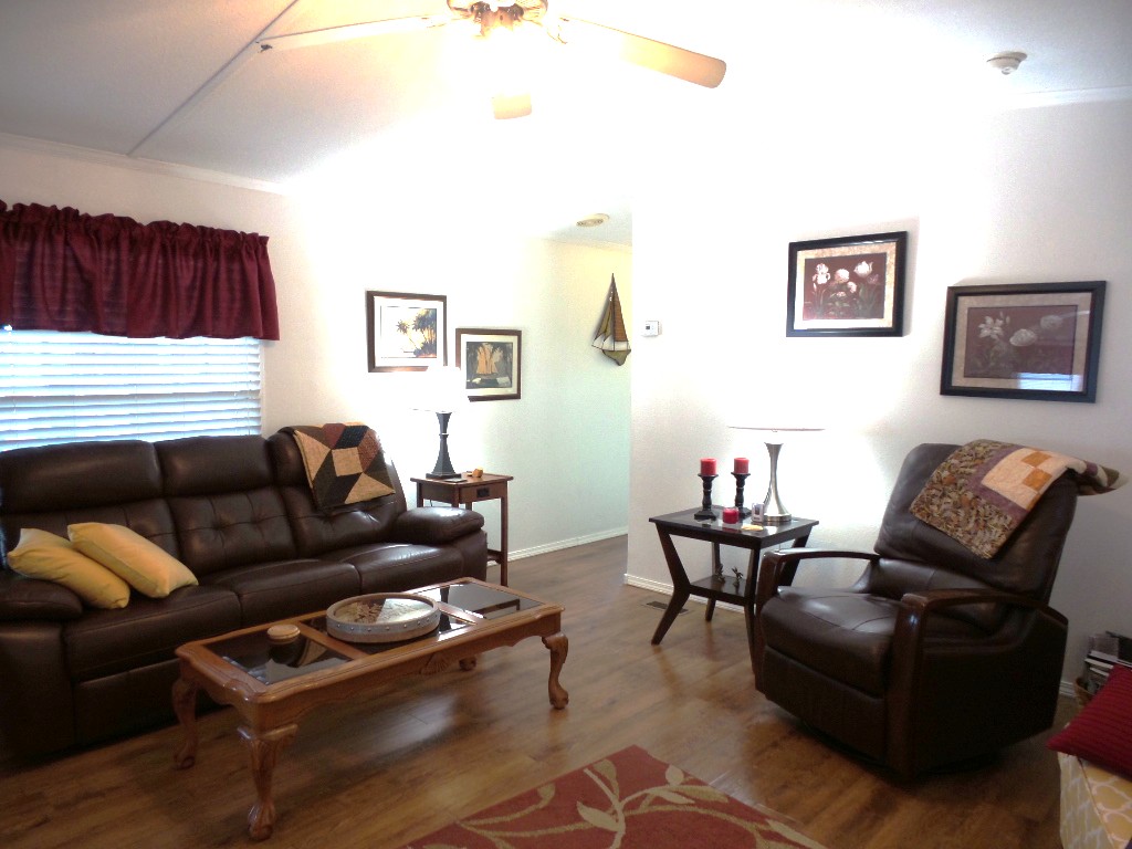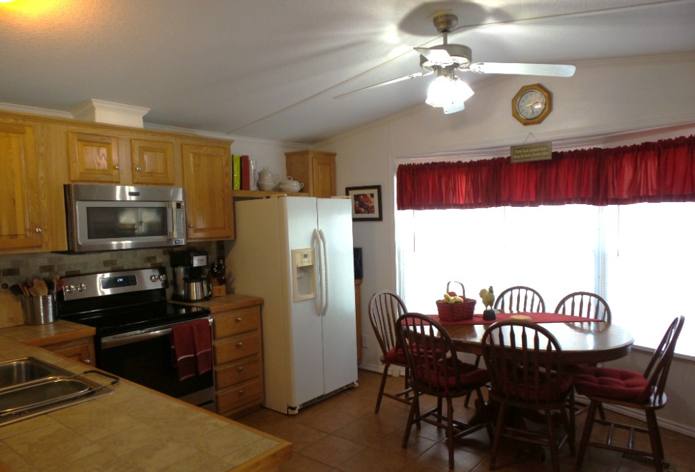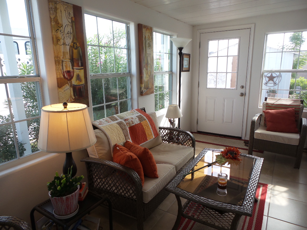 American Homestar 2-bedroom, 2-bathroom, Manufactured home 2007 16x60’ +12x16’ Tx room=1127 sq ft of living space. Driving up to this tropical oasis you see an inviting deck to enjoy the TX weather outside, or inside this lovely TX room! Entering the Livingroom you note matched reclining leather furniture upon LVP flooring, with bar stools towards the front kitchen. It has an abundance of oak cabinets featuring tiled countertops & backsplash with ceramic tiled floors. Updated newer appliances include the dishwasher & flat-top stove an overhead microwave, with a side/side fridge near the table, adjacent to the panoramic front windows. Along the hallway is access to the TX room with surrounding thermal windows & relaxing patio furniture with great views of the outdoor plants. An exit door goes to the quaint back patio area & shed, as well. The main T/S bathroom is between the guest & master bedroom, near the new W & D. The Q master ensuite bedroom/set is at the back of the home with XL mirrored closet/drawers. The M bathroom has a walk-in shower & dual sinks with extra cabinets. This lovely home has textured & pristine painted walls, & is energy efficient/low maintenance with sunscreens, steel roof, new/updated appliances & brand-new W/H. A must see for all the great outdoor/indoor spaces! Call Rita>712-281-9862 Tour.