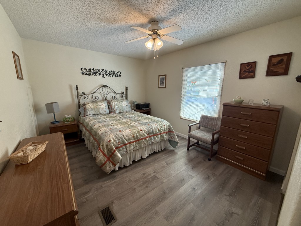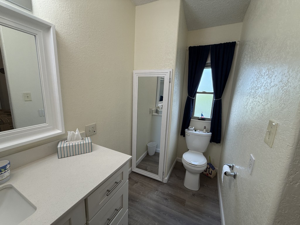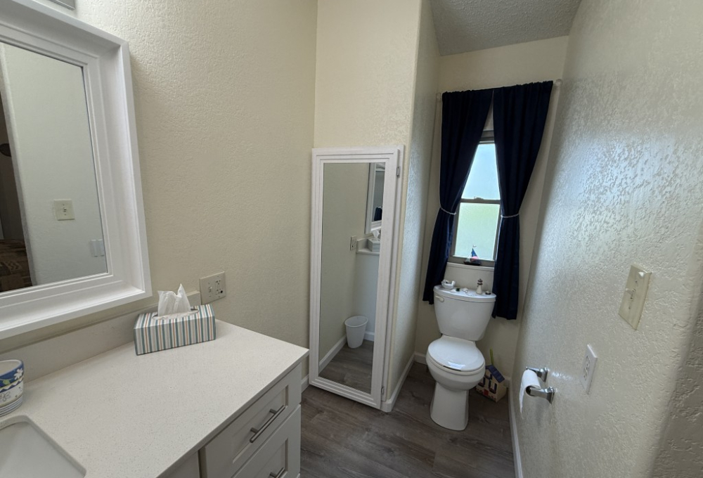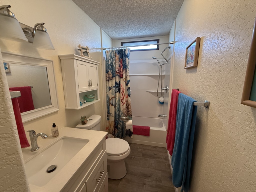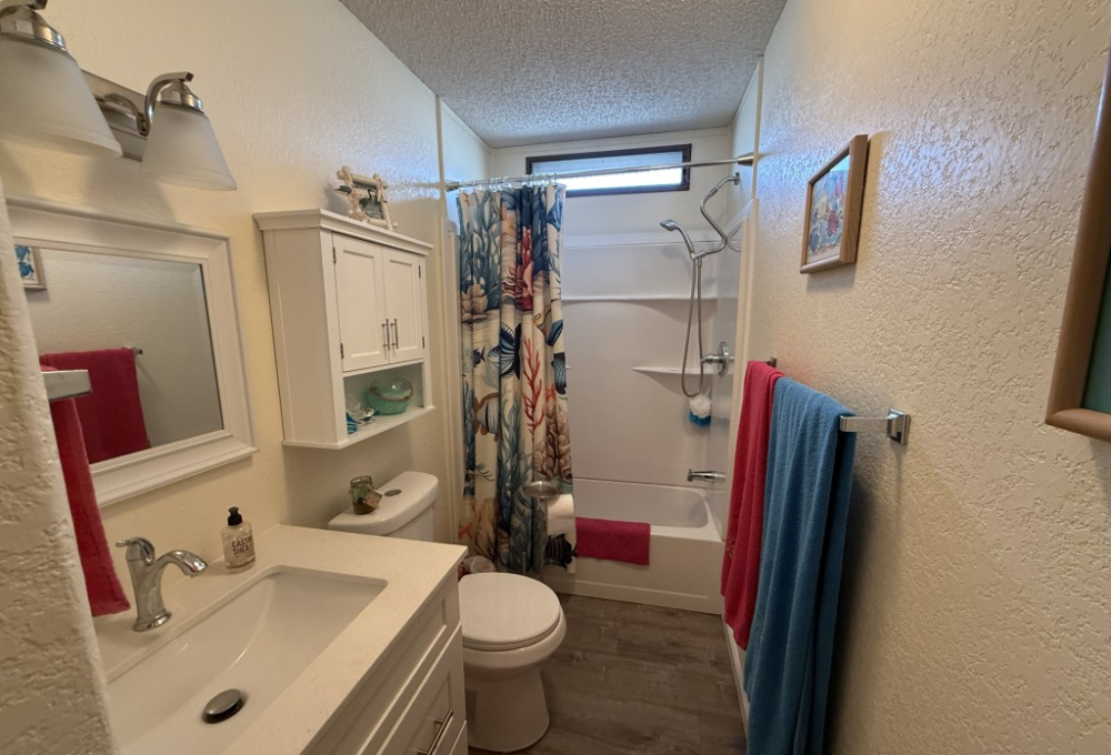 At the other end of the home, the guest bathroom has been completely remodeled with a new bathtub, toilet, vanity with quartz top, mirror, and lights. The home also features new subflooring and vinyl plank flooring throughout, installed in 2024. The double-hung, double-pane windows open from the top or bottom, providing excellent ventilation. The A/C unit was installed in 2017.