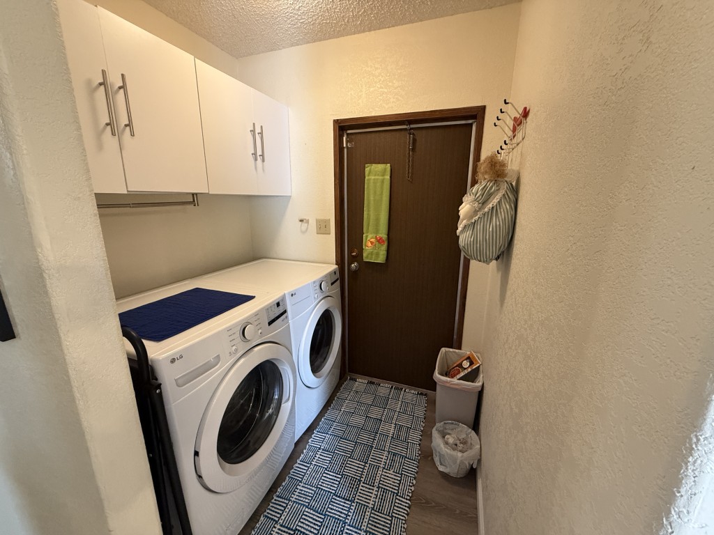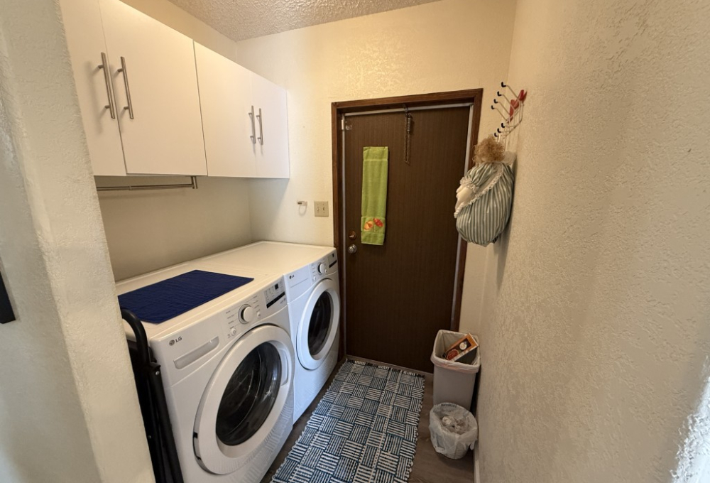 Down the hall, you will find the laundry room, which boasts a 2024 LG washer and dryer, along with new cabinets above them. The master suite, located at the rear of the home, is spacious and includes a walk-in closet. The master en-suite bathroom features a new vanity, lighting, mirror, and a full-length mirror.