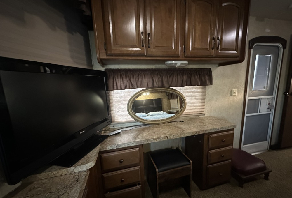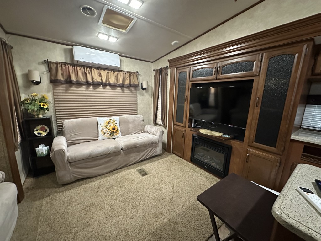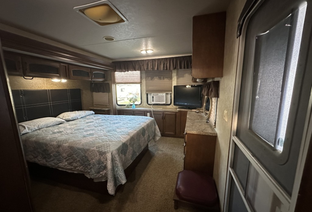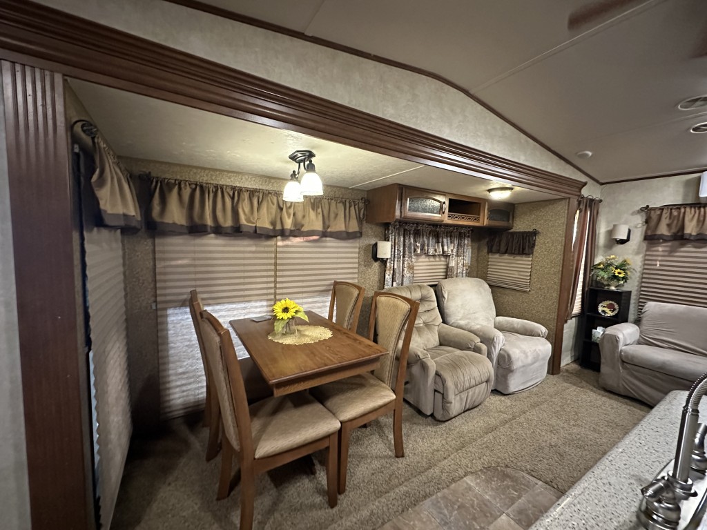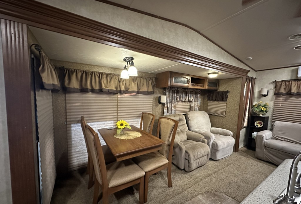 The bedroom is equipped with a vanity, TV, ample storage, and a convenient walk-out door. The open concept living area includes an island sink, a table for four, two recliners, and a love seat, along with a TV so you can relax and enjoy your favorite shows.