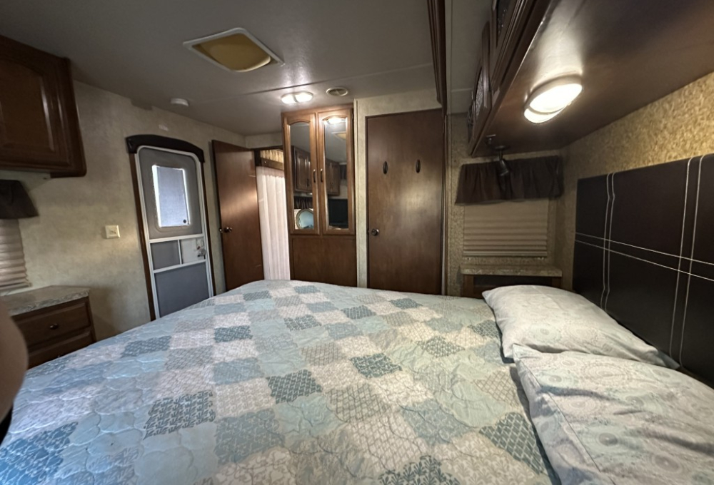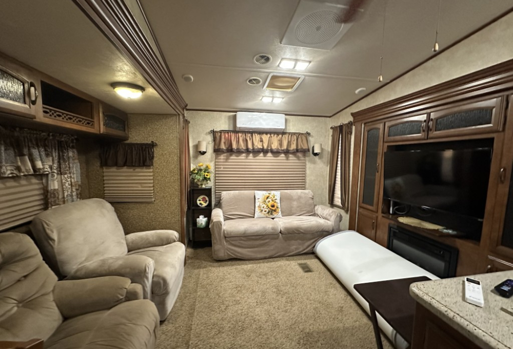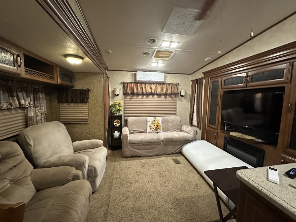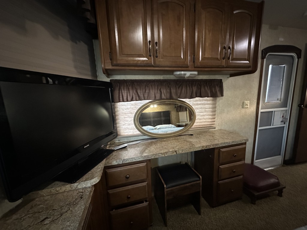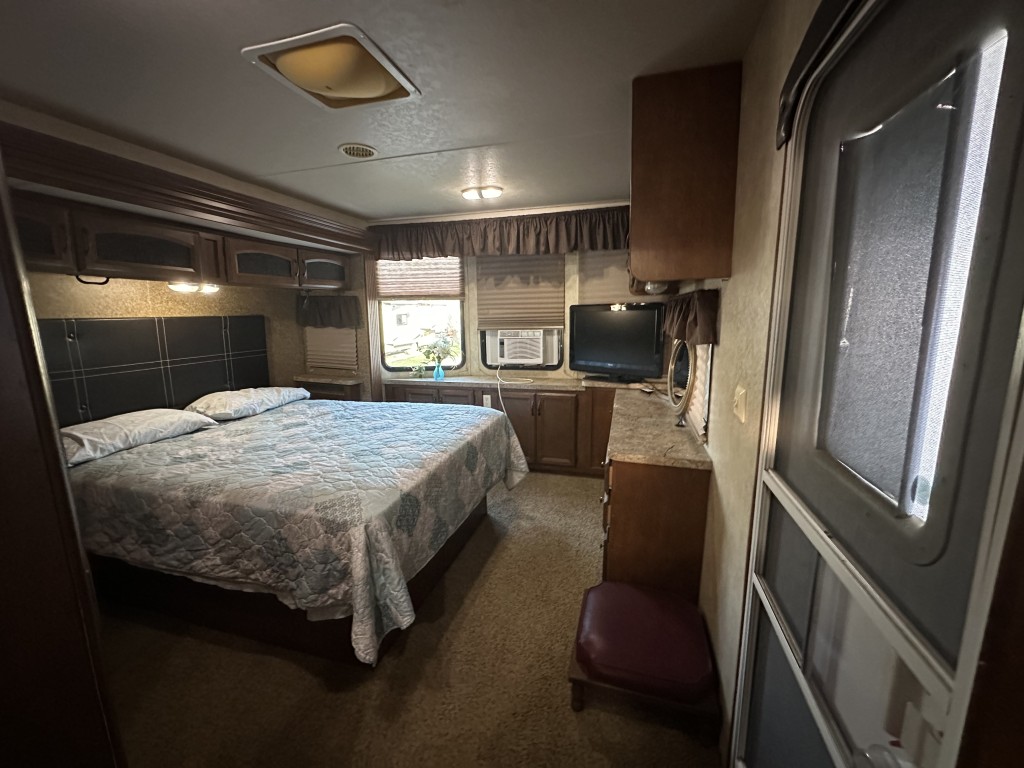The bedroom is equipped with a vanity, TV, ample storage, and a convenient walk-out door. The open concept living area includes an island sink, a table for four, two recliners, and a love seat, along with a TV so you can relax and enjoy your favorite shows.