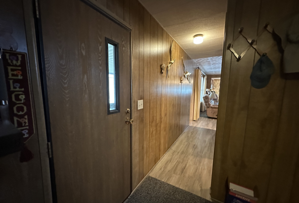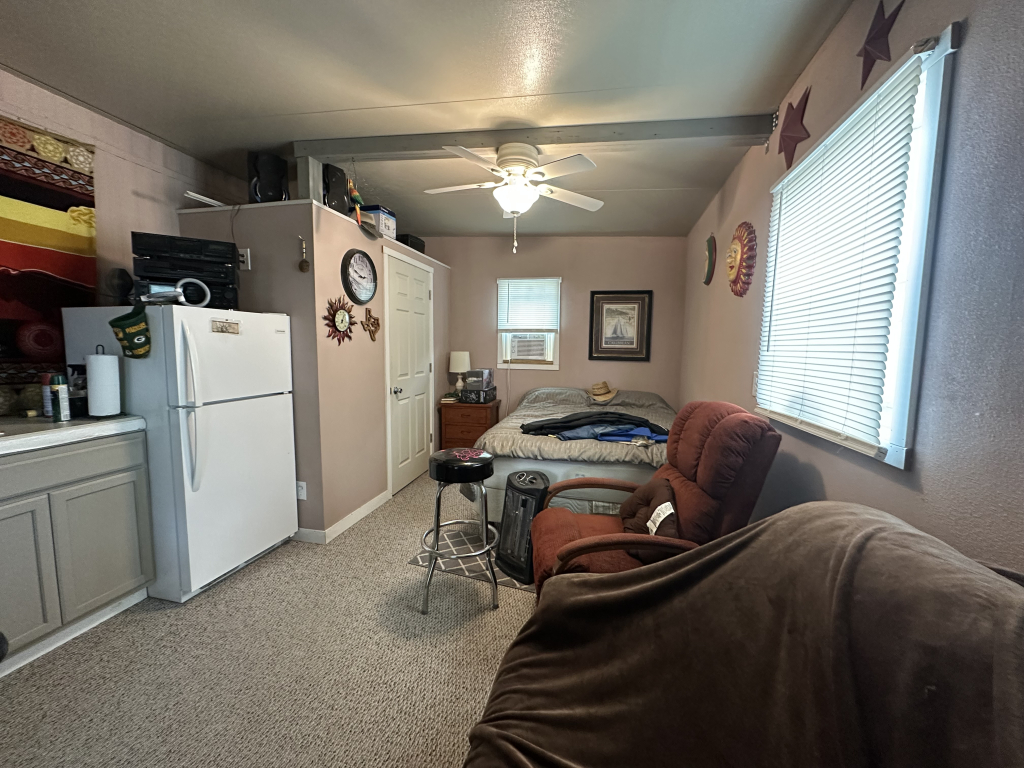 Added features include a large propane tank rented through Pico (with refills available), a front porch for parking your golf cart, and a low-maintenance front yard covered in pebbles. There are two storage units in the back beyond the front porch, a grandfather fence for pets, and fruit trees.