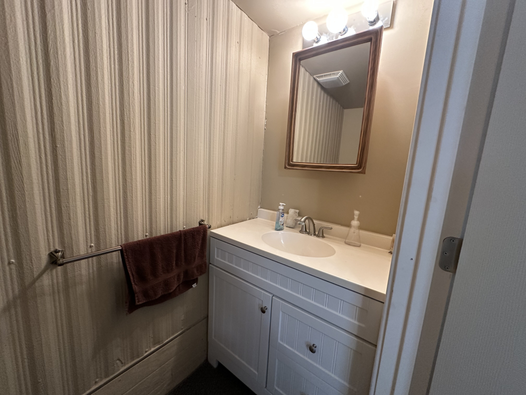 The bedrooms are carpeted, while the rest of the home boasts attractive laminate flooring. An open-air plan welcomes you: to the right is the front kitchen with street views and a versatile side area, perfect for a desk or serving space. The kitchen island, surrounded by three bar stools, is ideal for enjoying meals. To the left, the living area features an accent wall and abundant lighting for relaxing or entertaining guests.