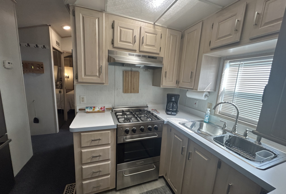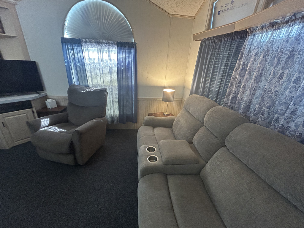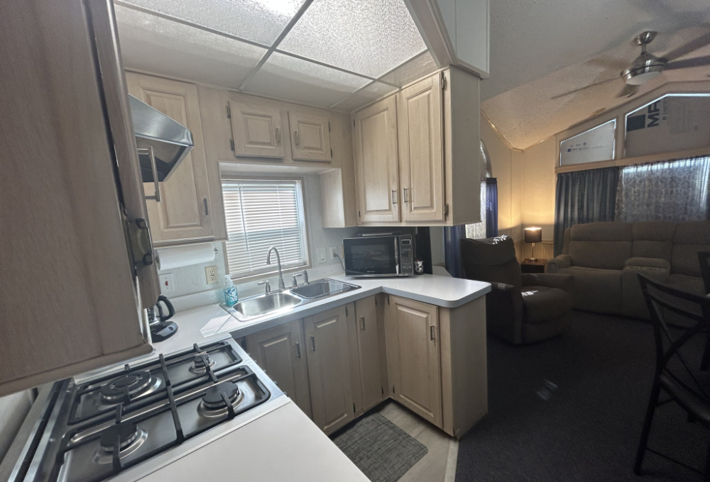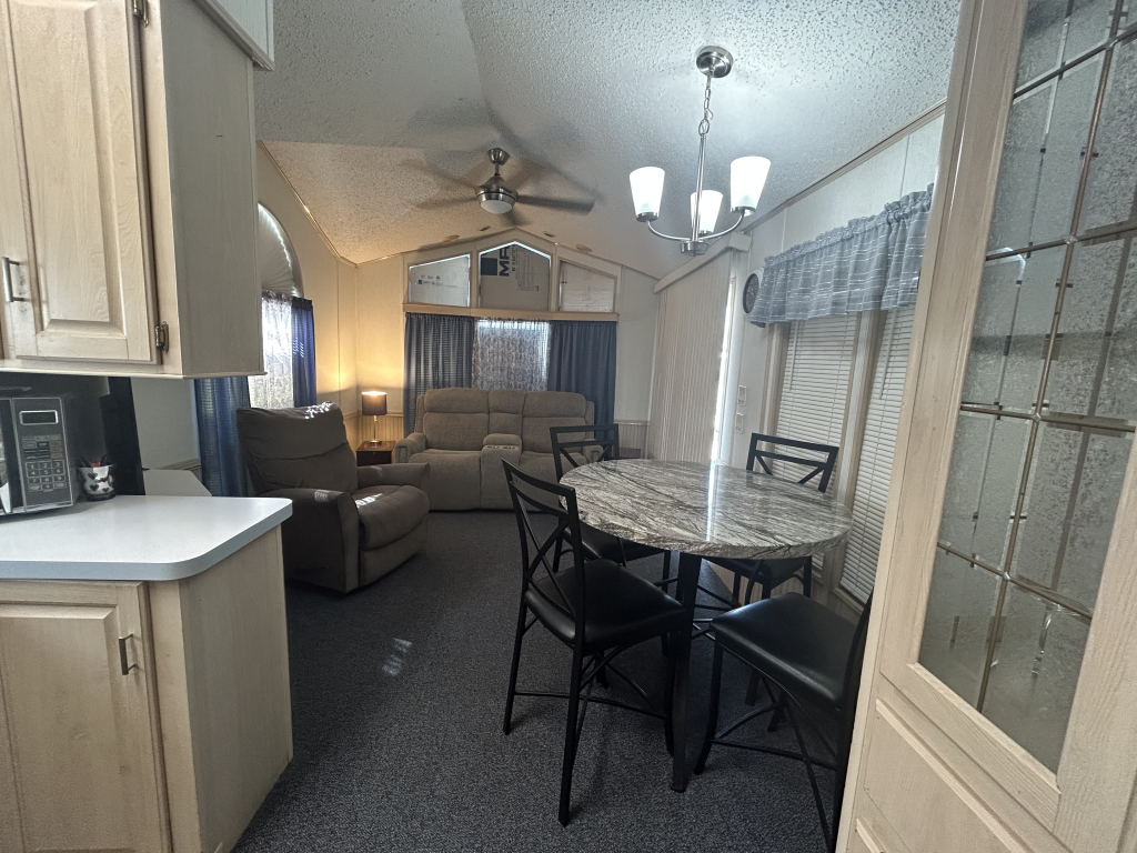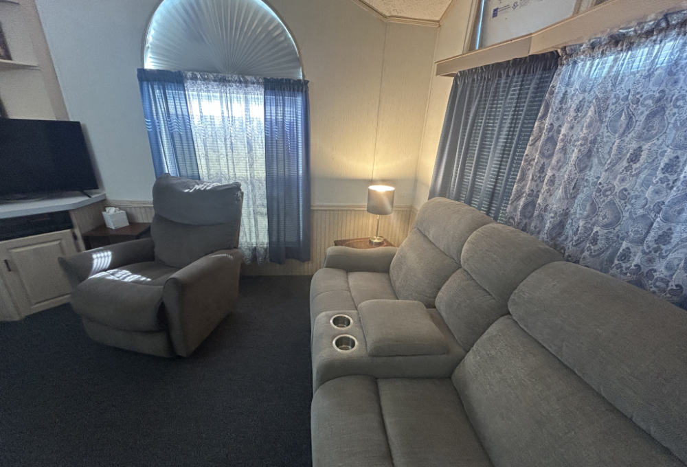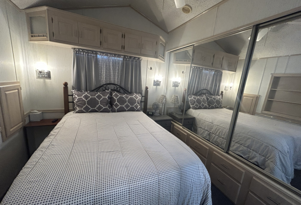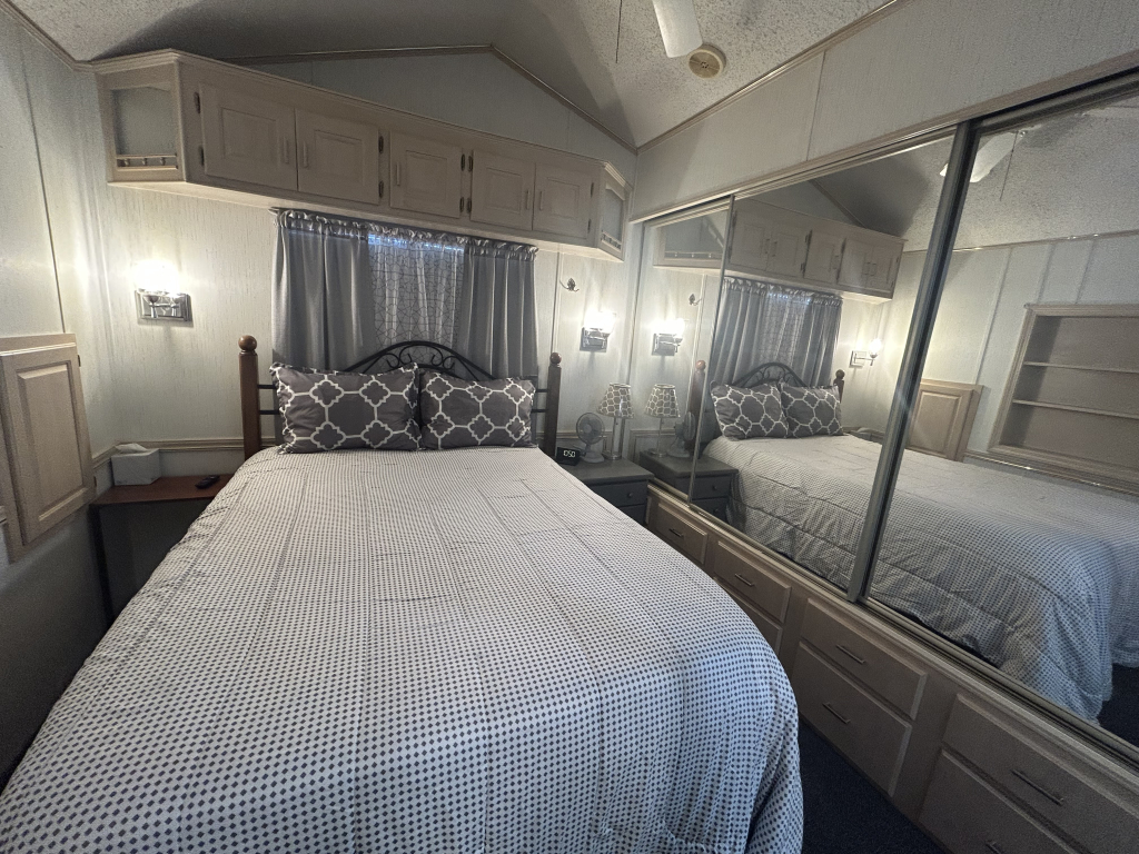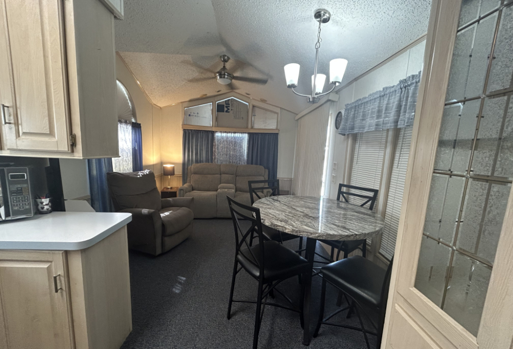 This well-maintained 1993 CAST 1-bedroom, 1-bathroom (1B/1Ba) 12x33 park model offers comfortable living with the added benefit of an attached 10x13 spare bedroom. The spare room includes a closet and a full bathroom, providing extra space for guests or family.