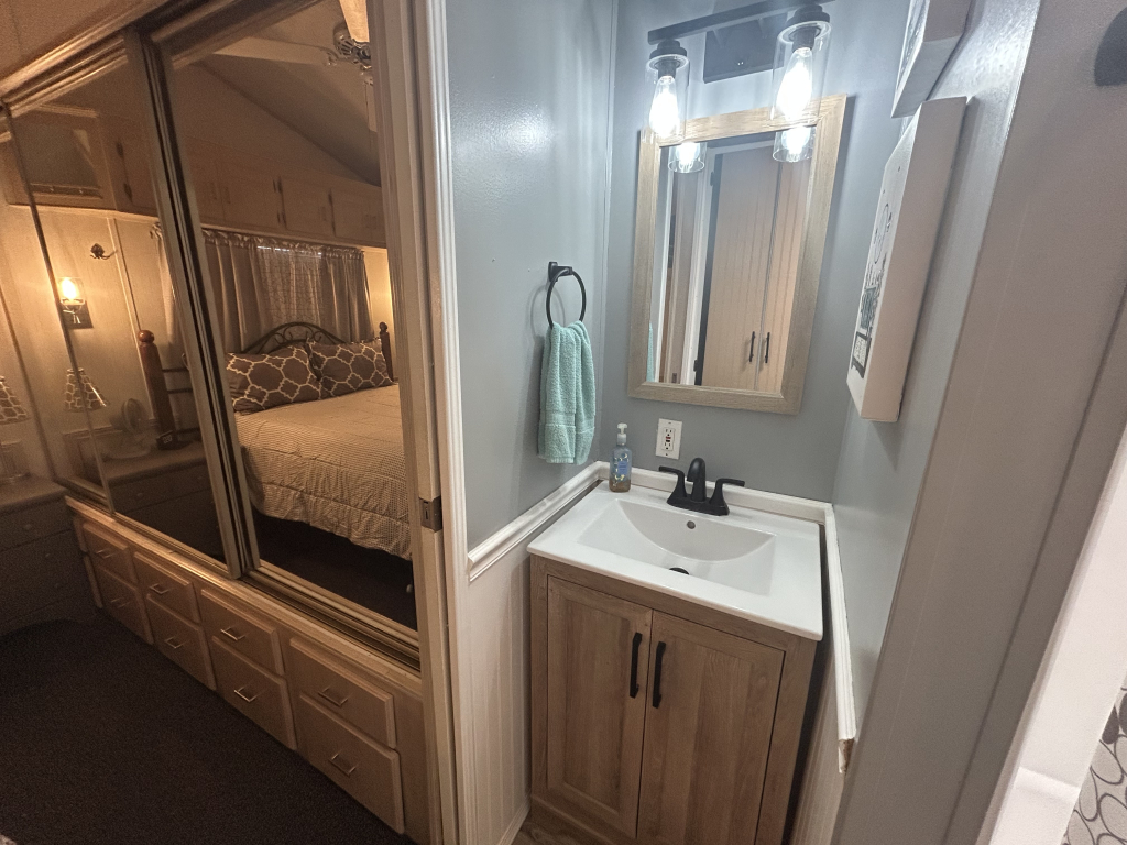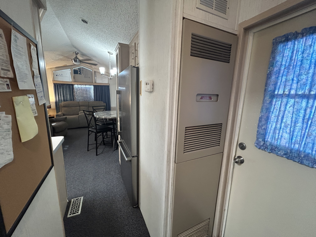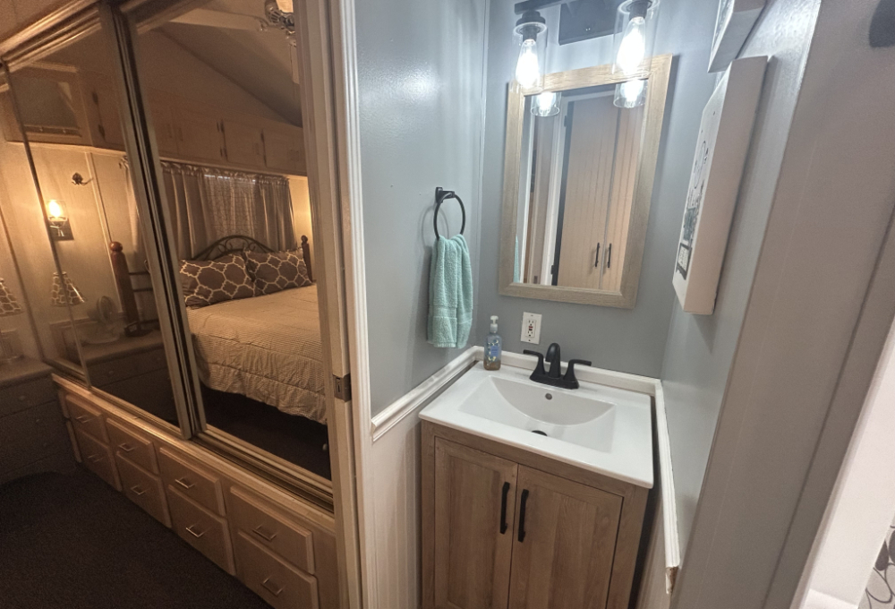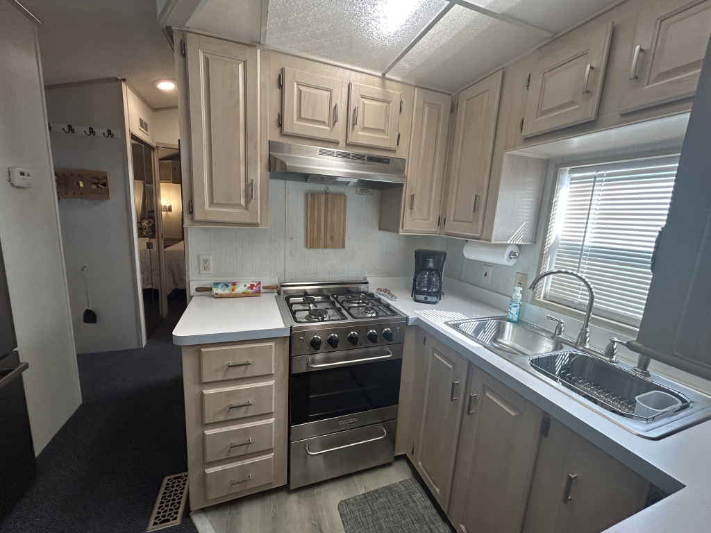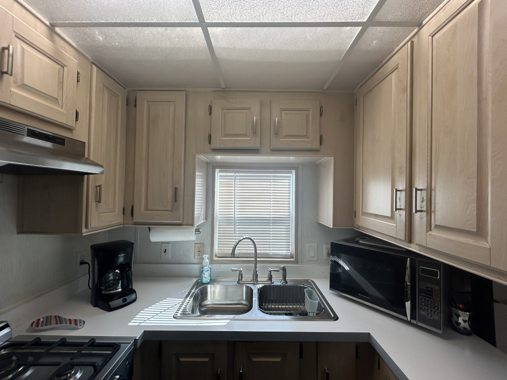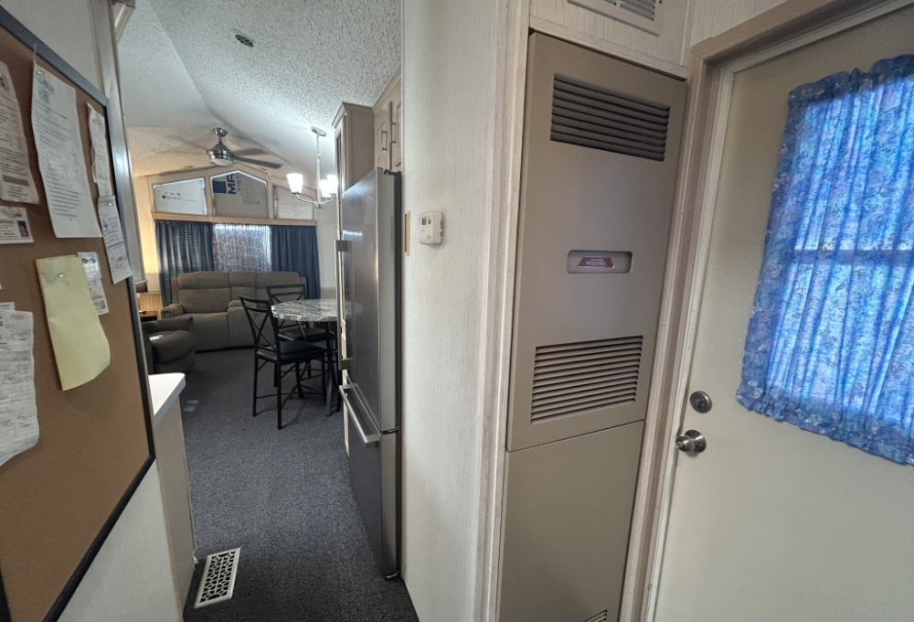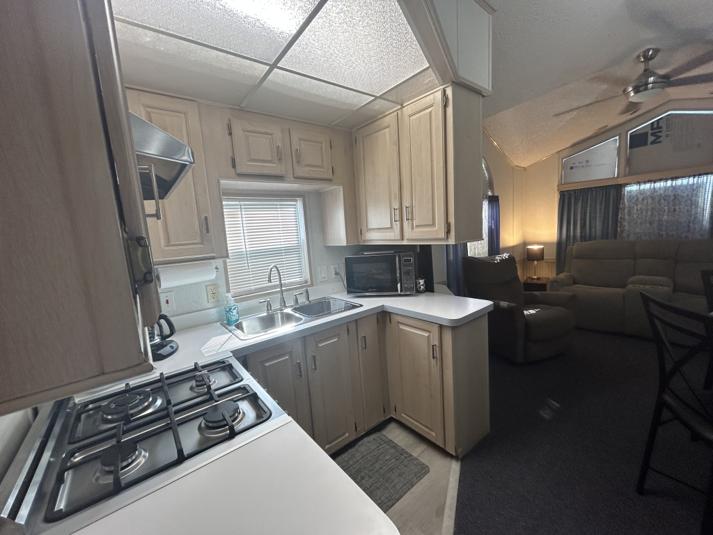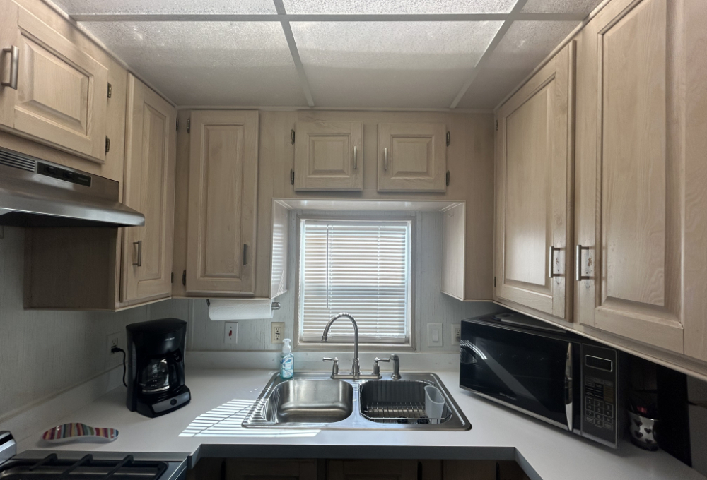 This well-maintained 1993 CAST 1-bedroom, 1-bathroom (1B/1Ba) 12x33 park model offers comfortable living with the added benefit of an attached 10x13 spare bedroom. The spare room includes a closet and a full bathroom, providing extra space for guests or family.