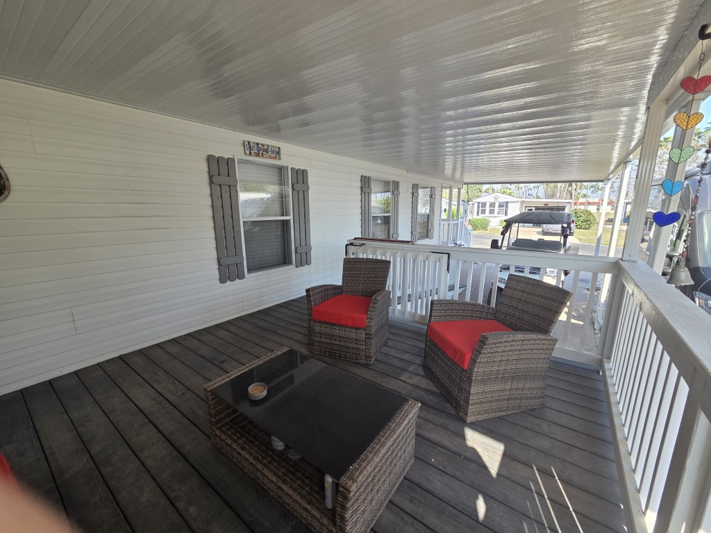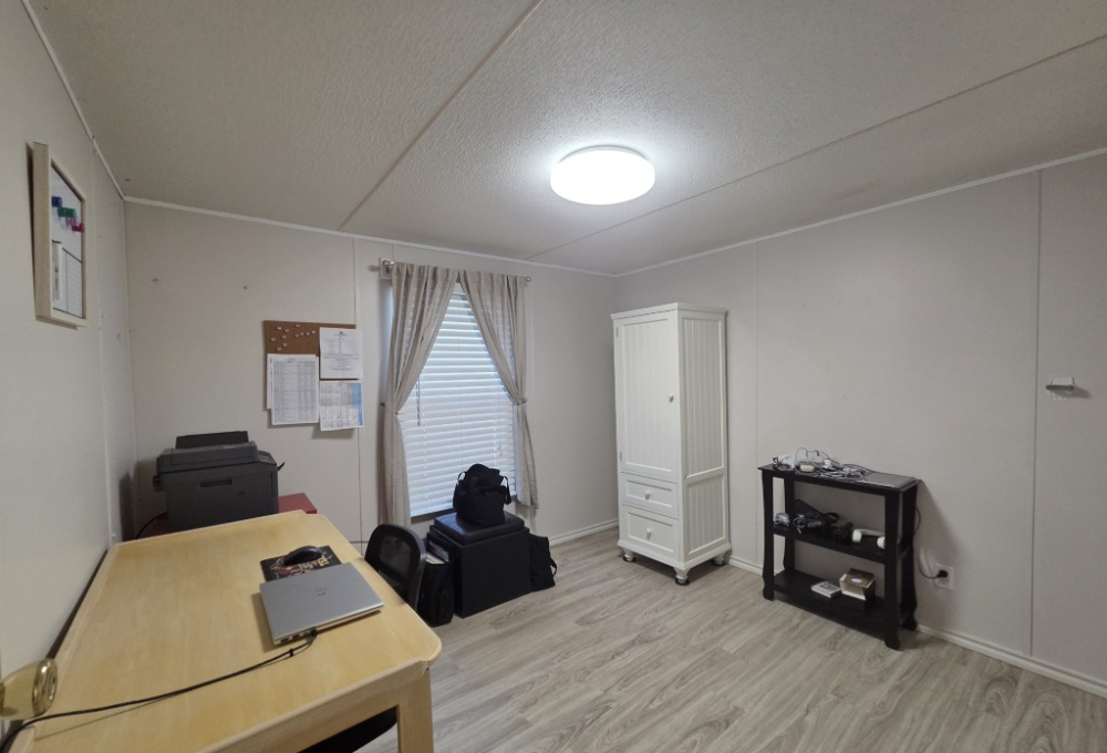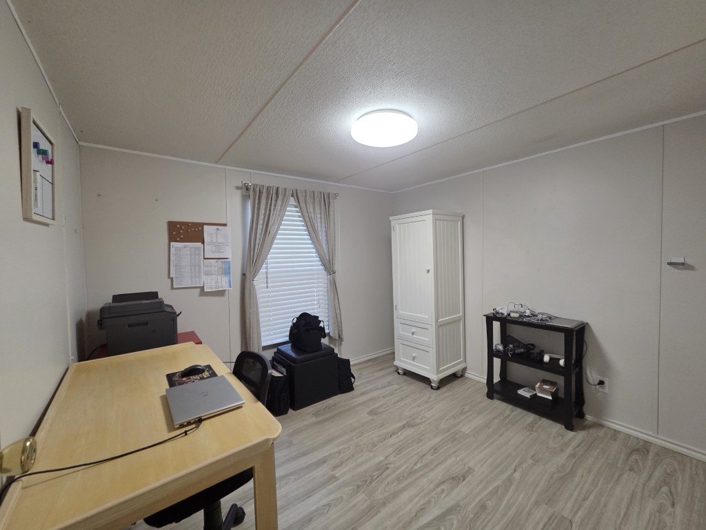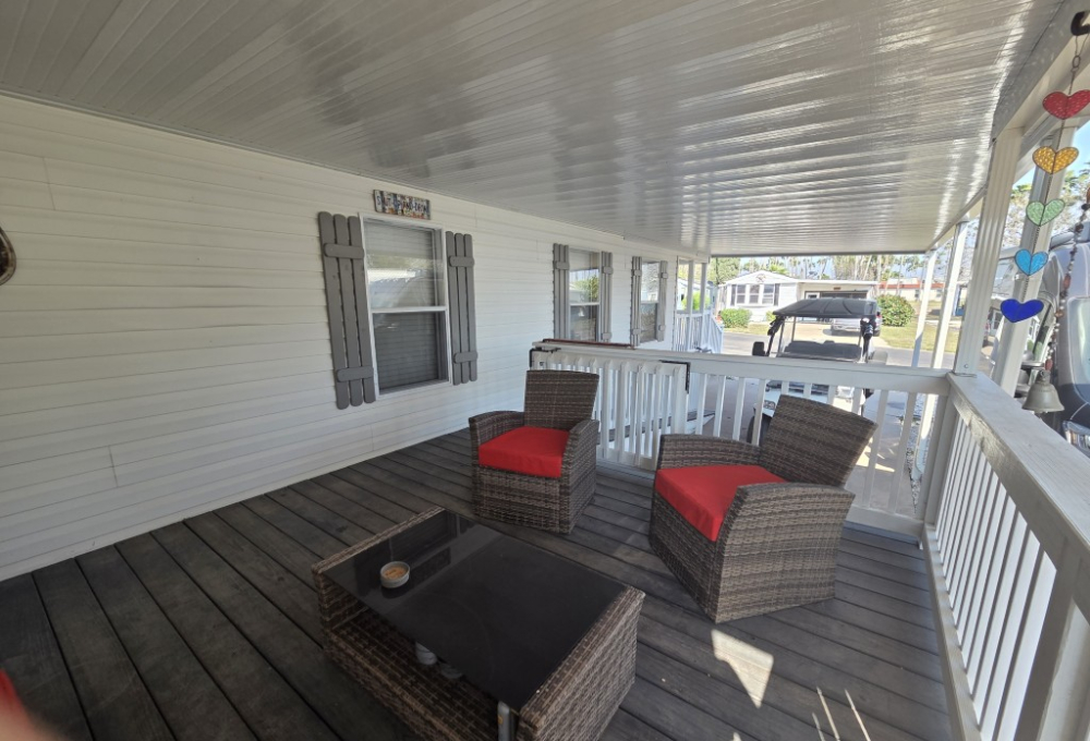 The home features a ramp leading to the covered side porch, offering easy access for those with mobility challenges. The addition to the home houses a spacious bedroom with a closet and its own private exit to the back porch. The back porch is equipped with a pull-out awning for added shade, creating the perfect spot to relax and enjoy the outdoors.