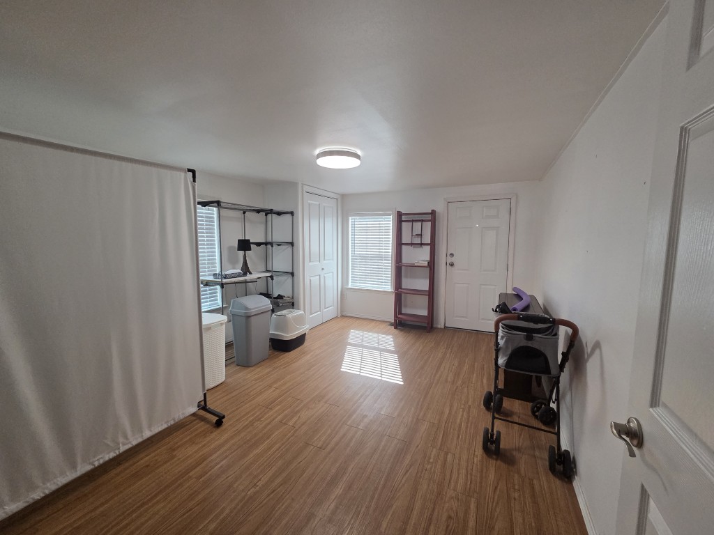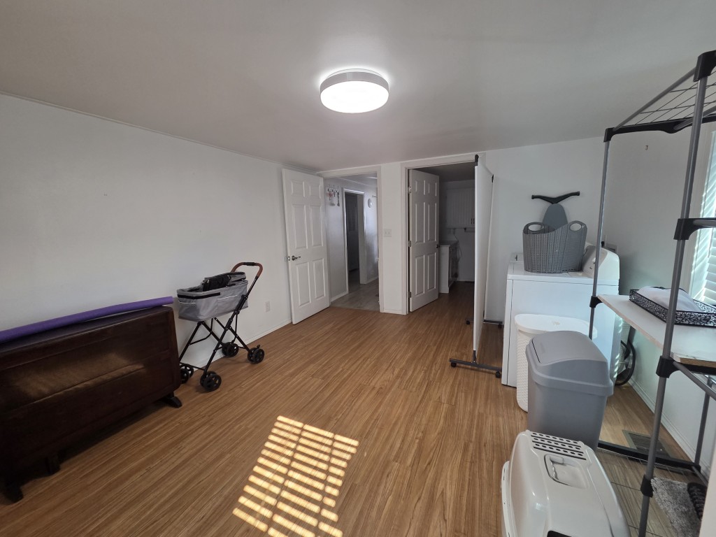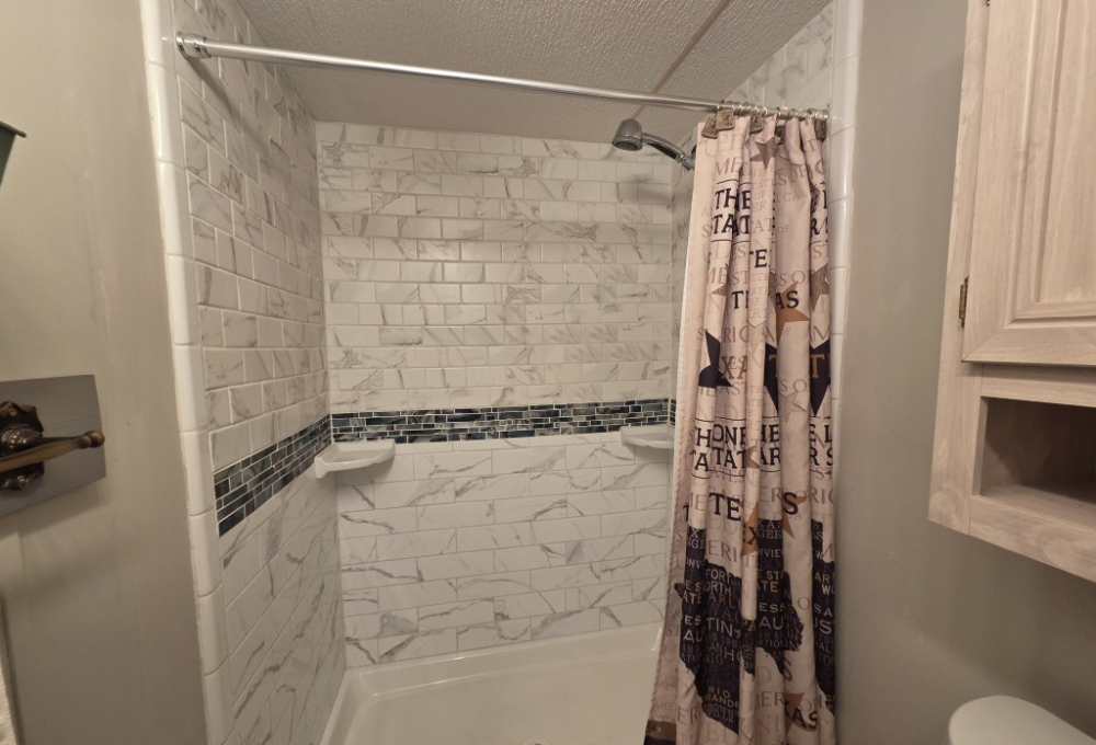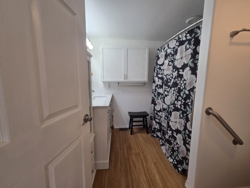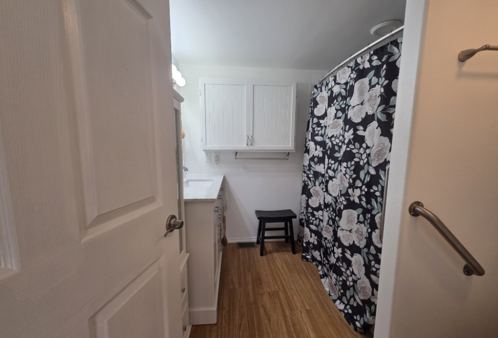 The large bathroom in the addition is fully accessible, featuring a wide door, a large walk-in shower, and grab bars, offering safety and ease of use for all.