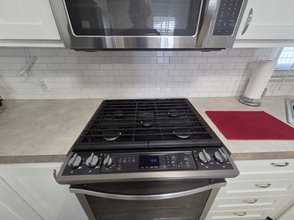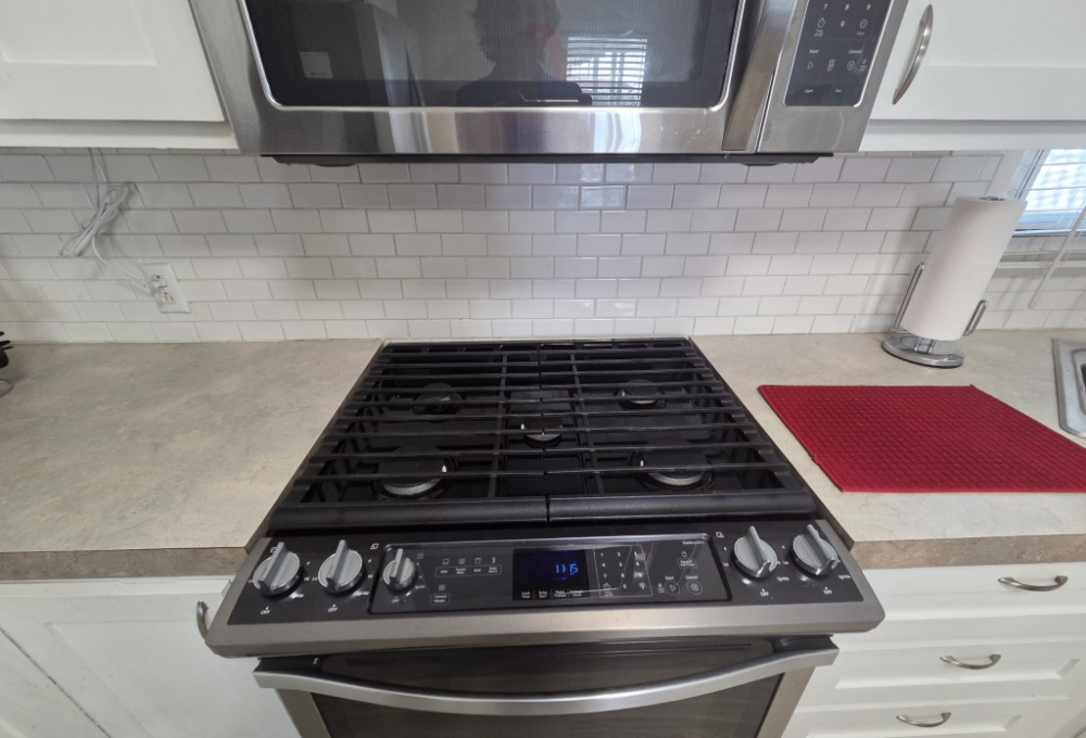 The kitchen is a true highlight, featuring a stove that would impress any gourmet chef, with plenty of counter space to spread out and prepare meals with ease.
