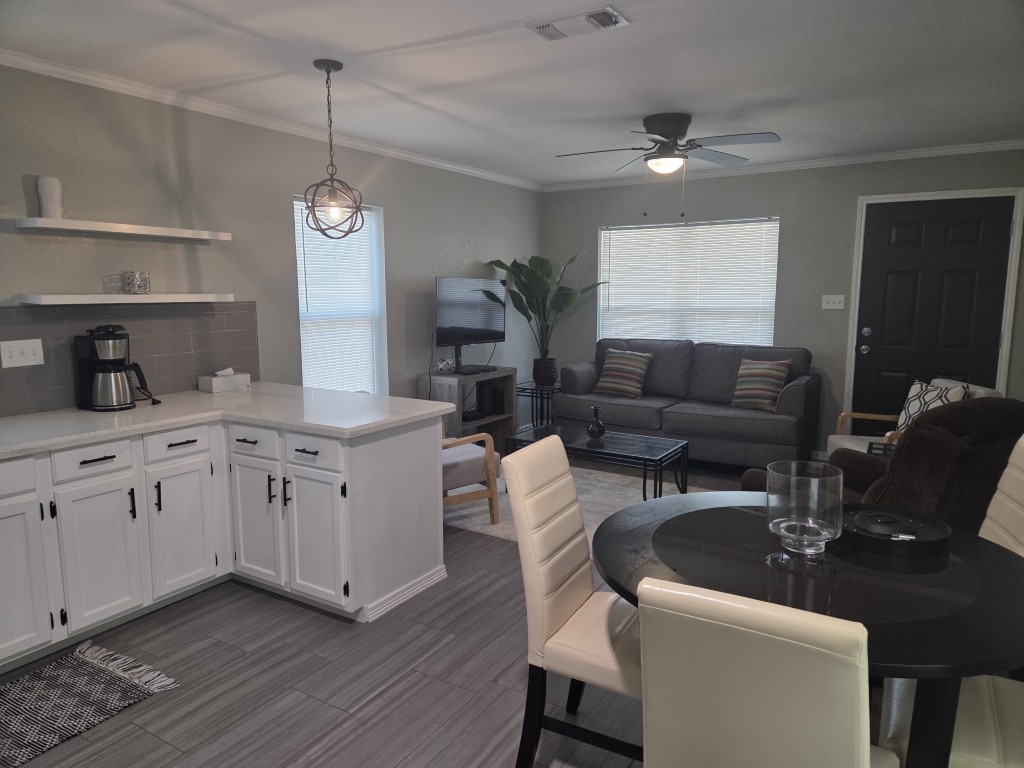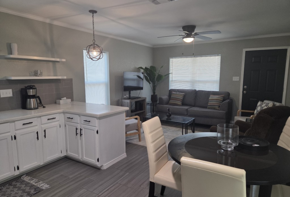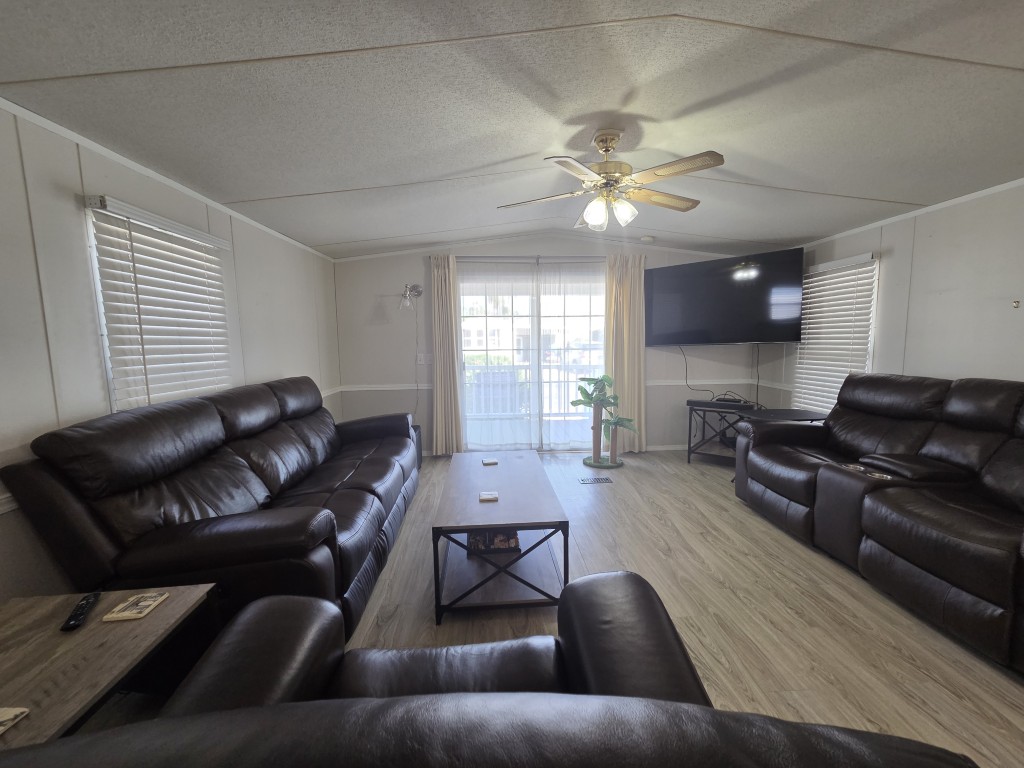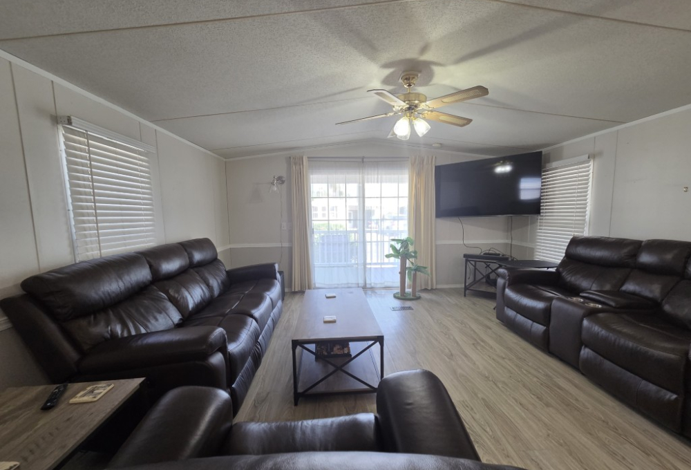Inside, the main part of the home boasts an open concept floor plan with sliding glass doors that lead to the front porch. The living room offers a serene view of the tops of palm trees swaying in the sunny breeze, creating a peaceful and calming atmosphere throughout the home.