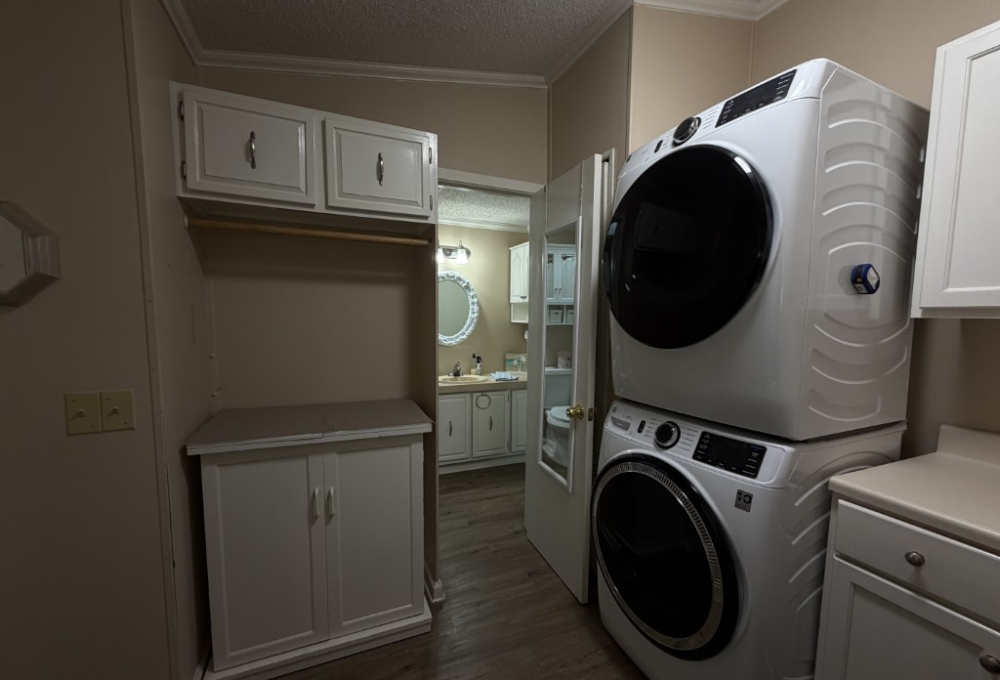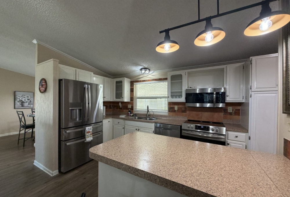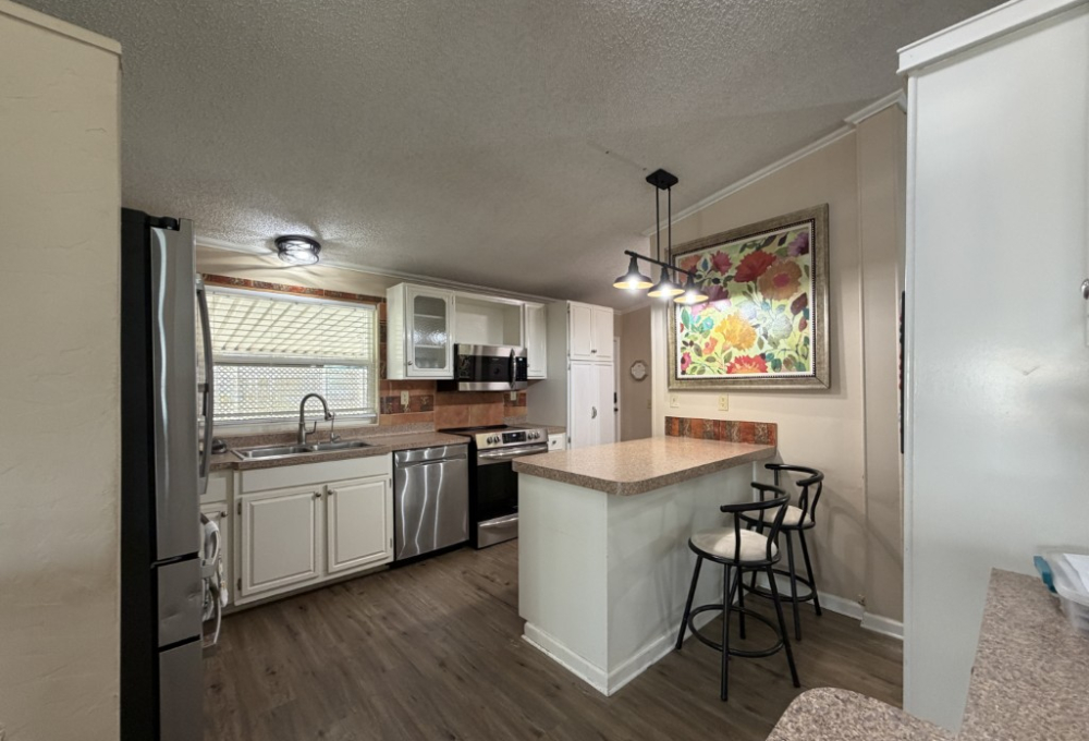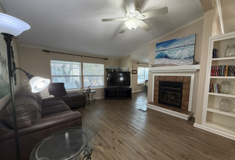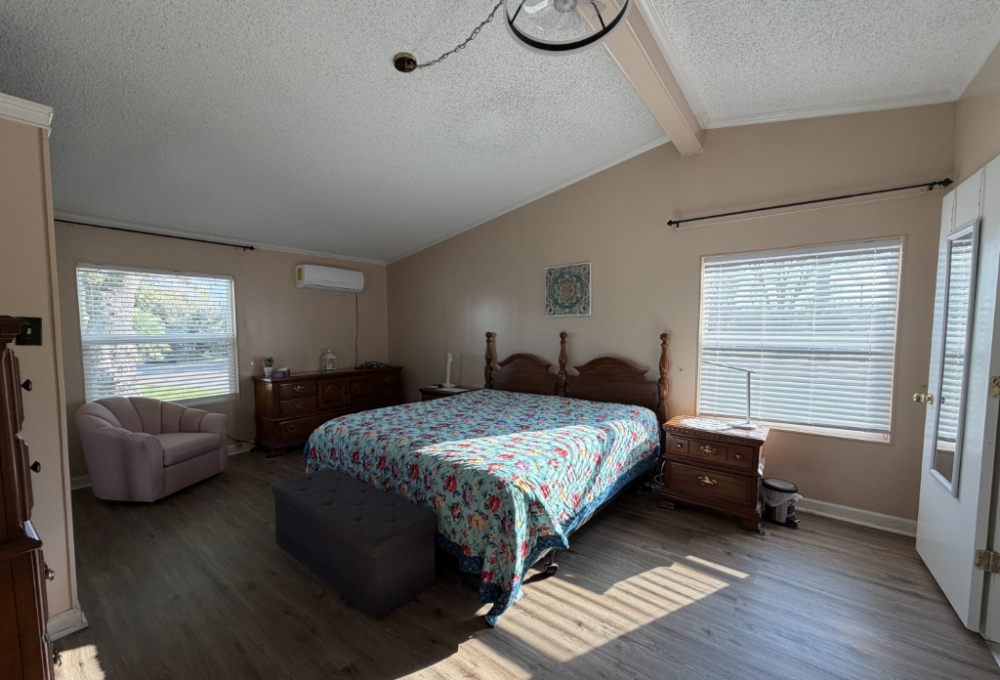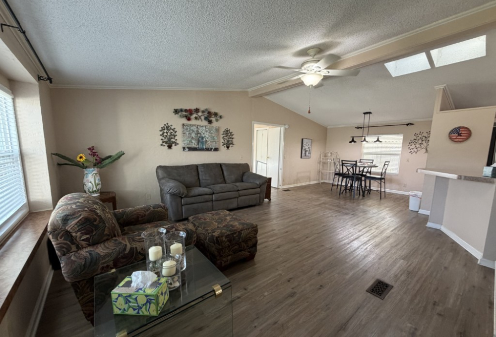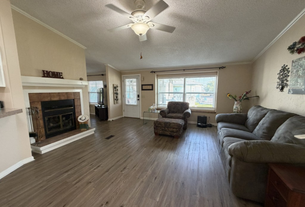 Presenting a spacious 1986 Cameo doublewide offering 1,736 sq ft of living space. This partially furnished home features 3 bedrooms and 2 bathrooms, situated on the largest lot within the park. The interior includes a living room with a double-sided gas fireplace, a great room, an updated kitchen equipped with 3-year-old appliances, a dedicated dining area, and a generously sized master suite complete with a king bed, two closets, mini spilt and an ensuite bathroom featuring a double vanity and walk-in shower. Additional amenities include two guest bedrooms, a Jack & Jill guest bath adjacent to the laundry area, a stackable washer and dryer, and ample storage throughout.