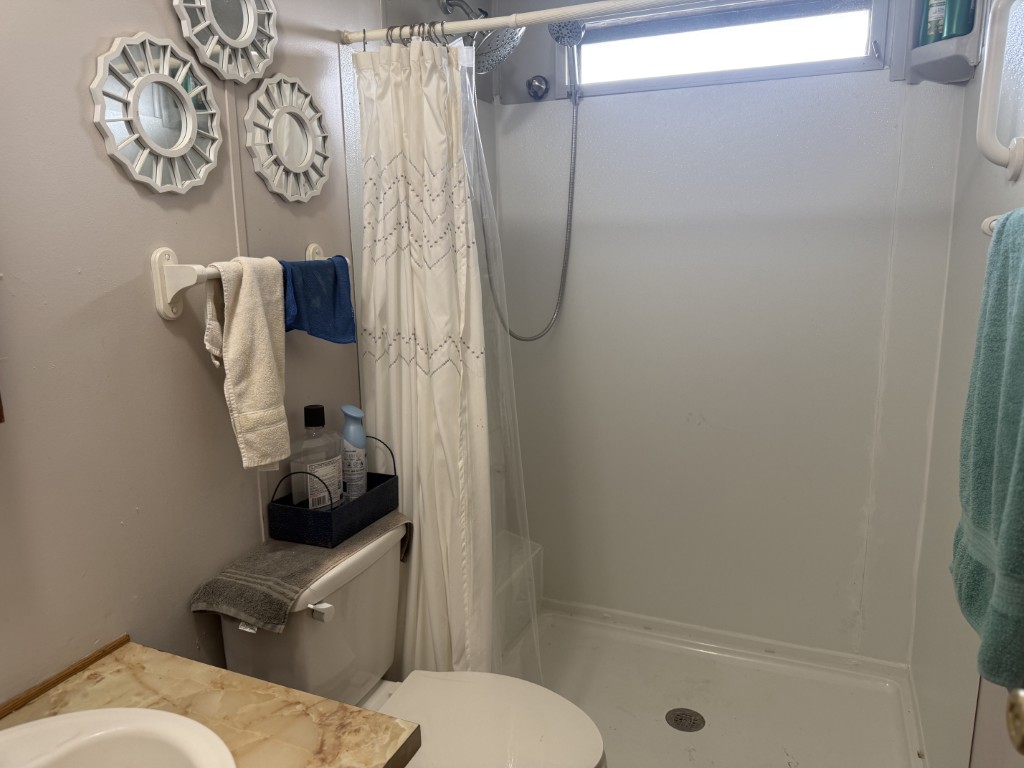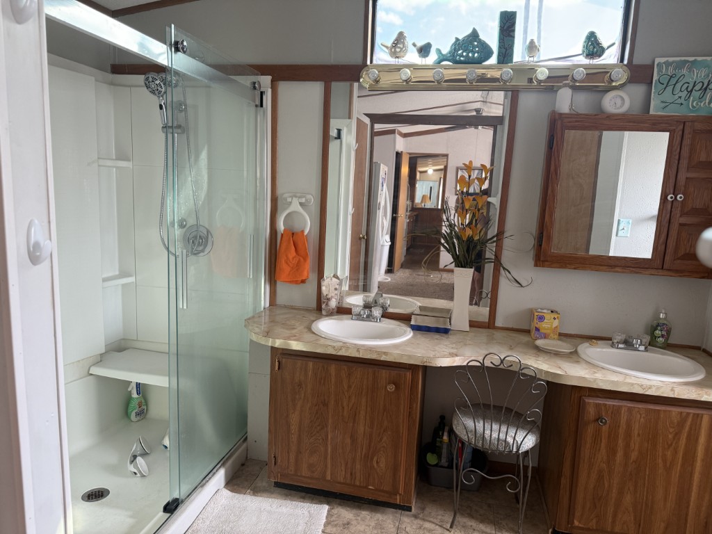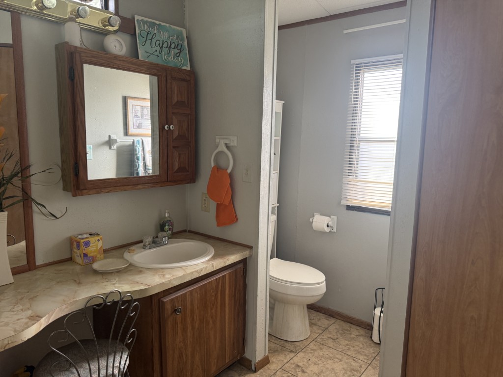 The primary bedroom, located at one end of the home, features an ensuite bathroom complete with a walk‑in shower, vanity, toilet, and an additional closet for extra storage. The guest bedroom is situated at the opposite end of the home, providing privacy, and is conveniently located next to the guest bathroom, which also includes a walk‑in shower, vanity, and toilet.