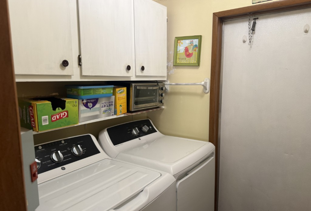 The laundry room is located between the kitchen and the primary bathroom and includes a door leading directly outside for added convenience.