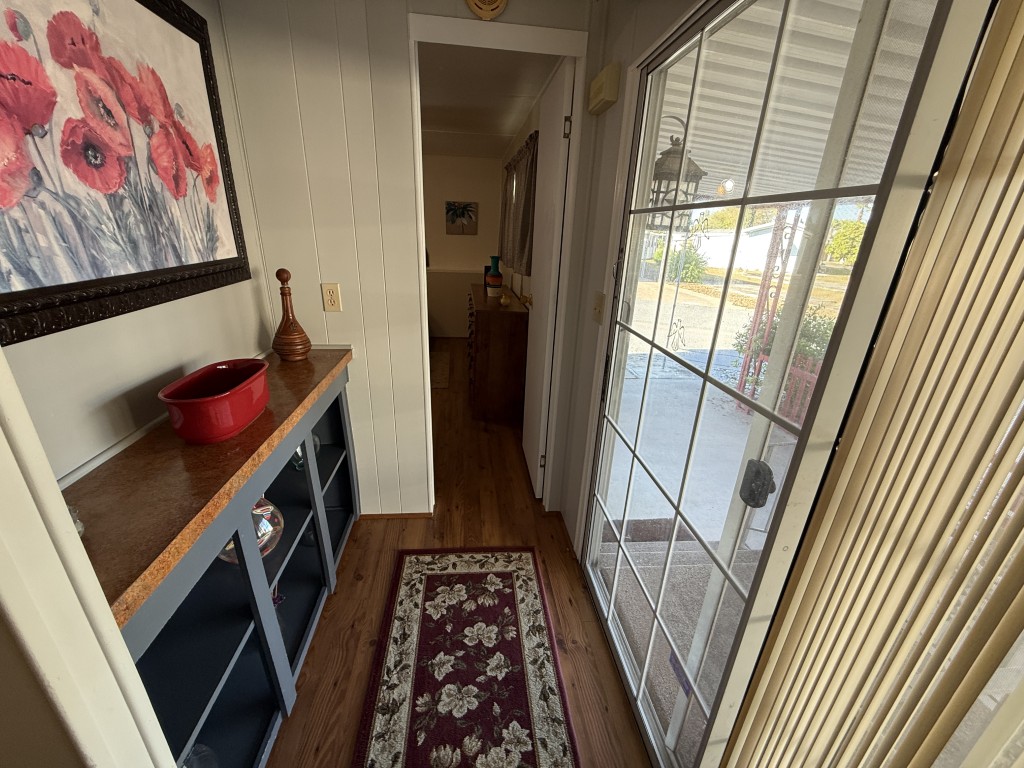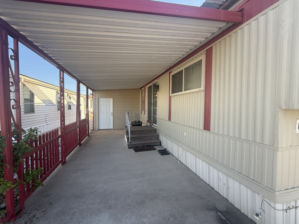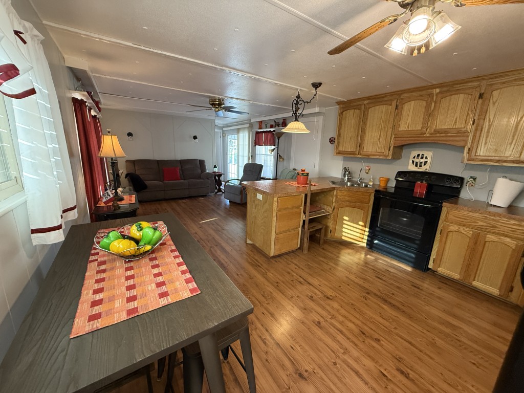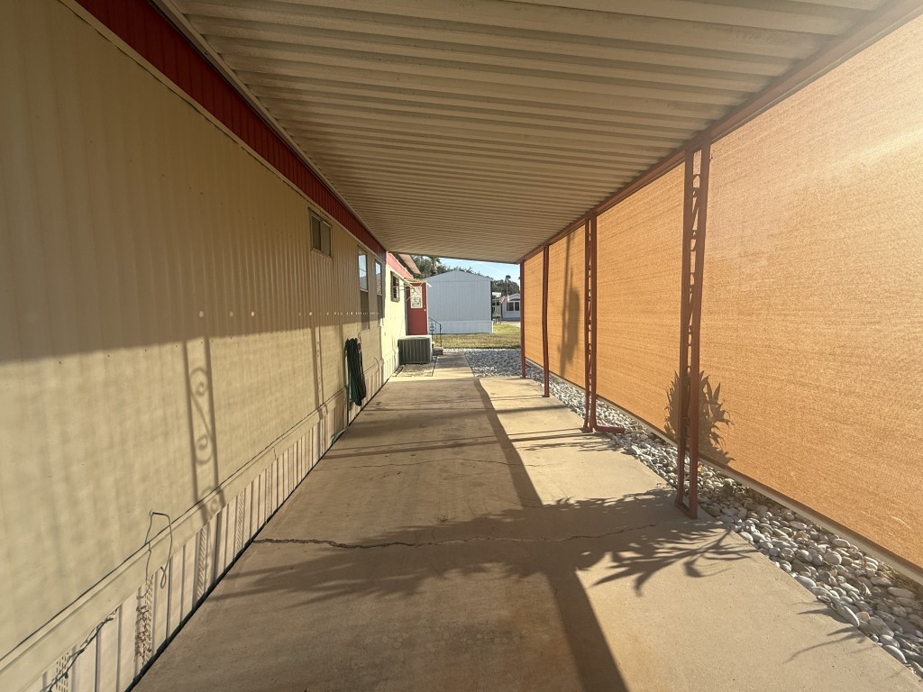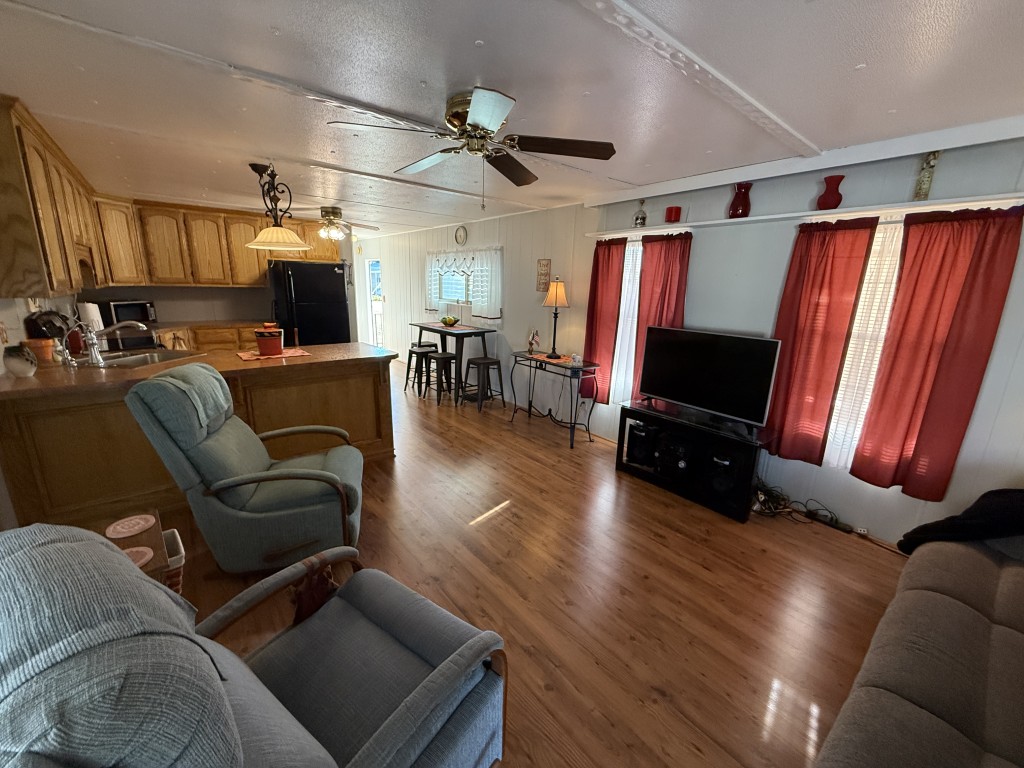 The home is adorned with wood laminate flooring throughout and is built on a sturdy 3/4 inch wood base. Outside, you'll find an A/C unit, a 9 x 40 carport, and a 9 x 14 Texas room that leads to a 12 x 14 shed with double doors, perfect for storing a golf cart. The home also has a metal roof and is beautifully landscaped.