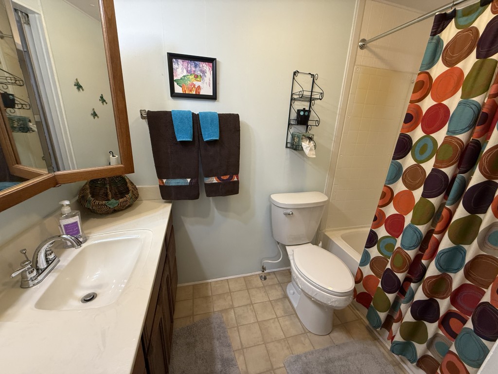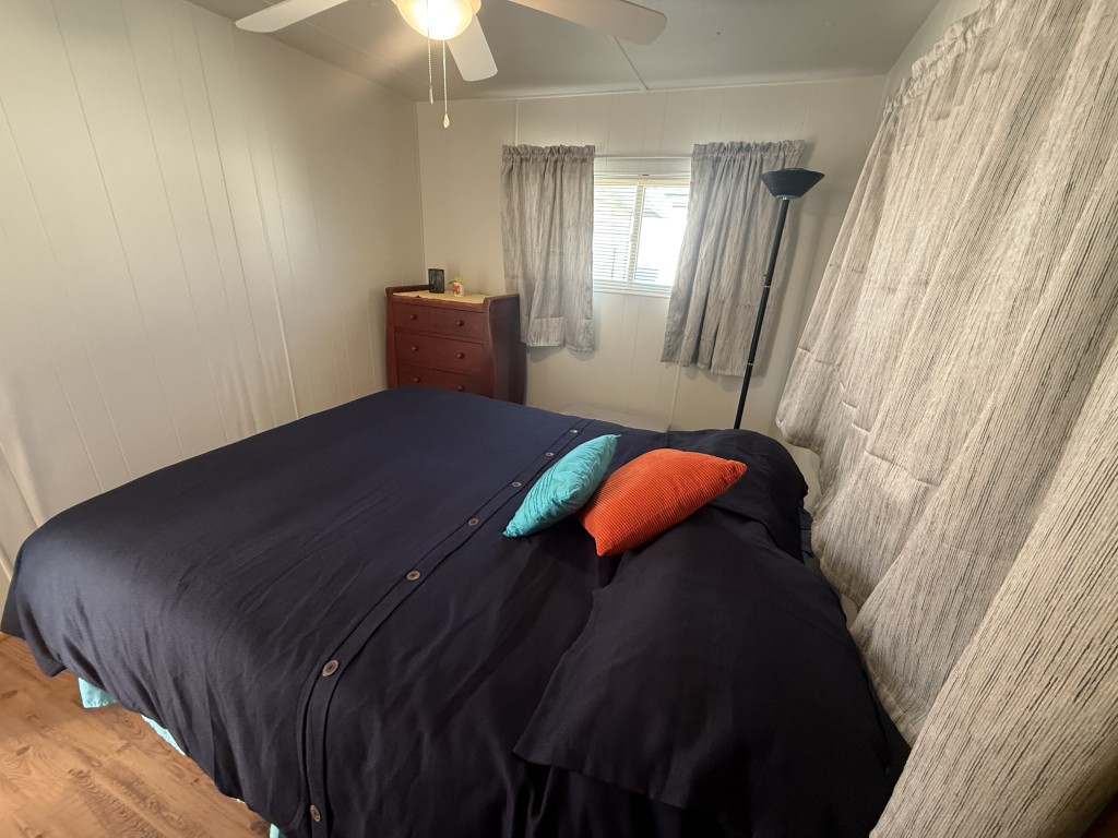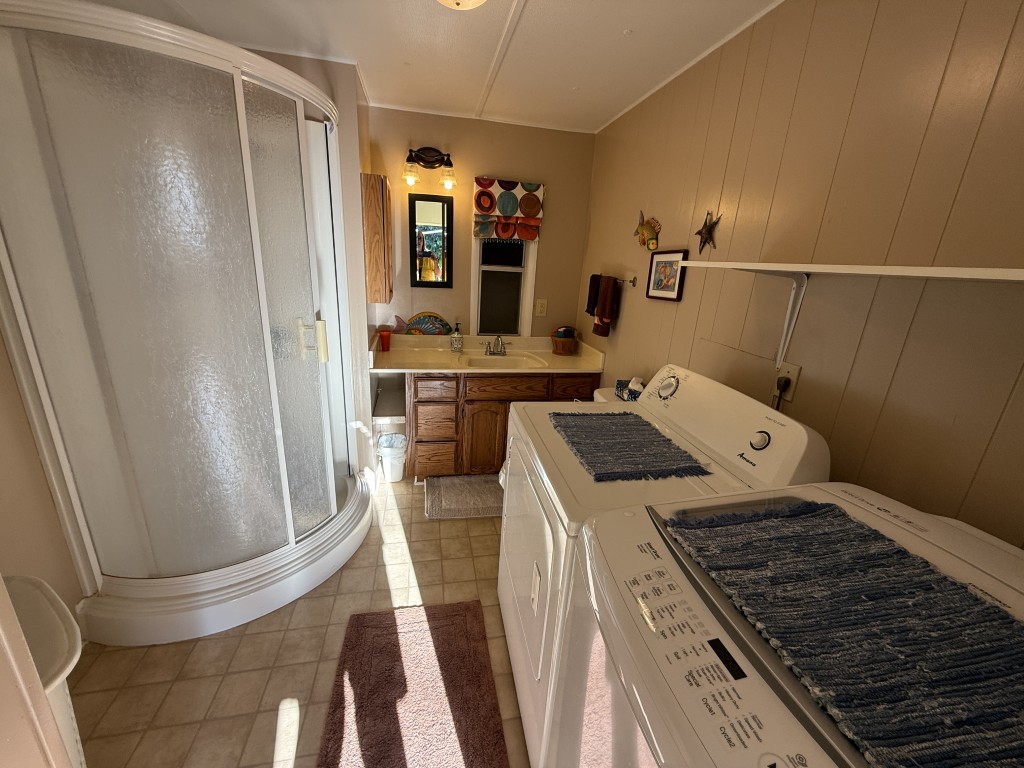 The master suite is situated at the front of the home and includes an en suite bathroom with a tub/shower combo, a toilet, and a single sink vanity. The second bedroom, located at the rear of the home, is spacious and ideal for guests. The guest bathroom, positioned just outside the guest bedroom, is modern and equipped with a walk-in shower, a single sink vanity, and a toilet. This room also houses the washer and dryer for added convenience.