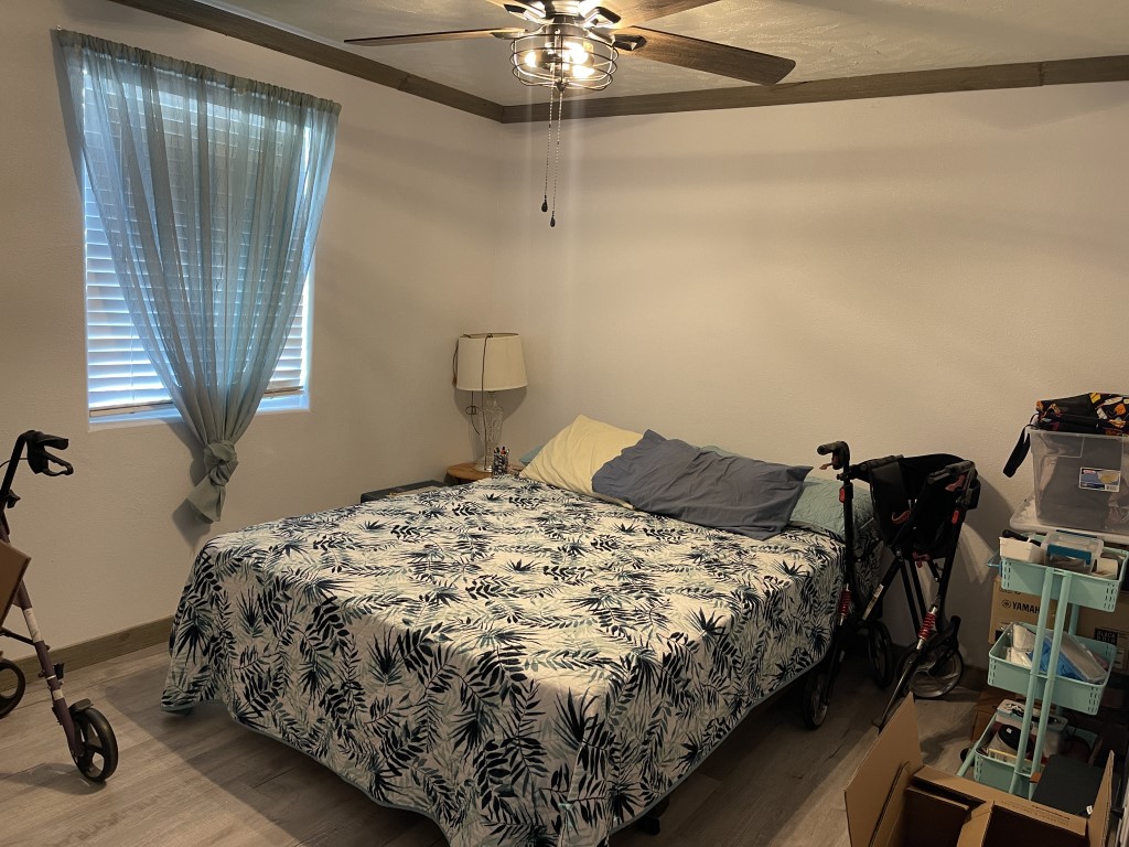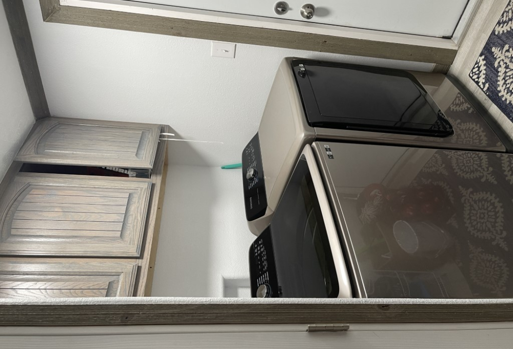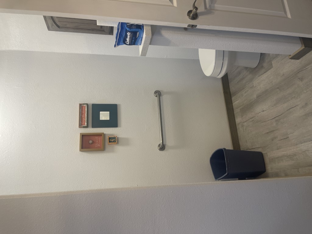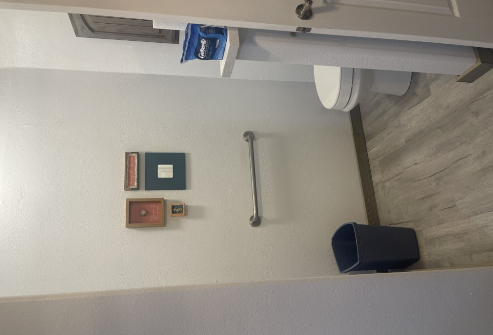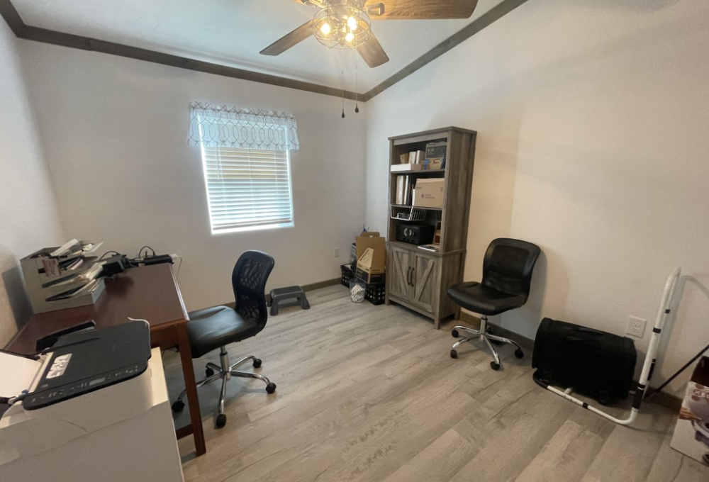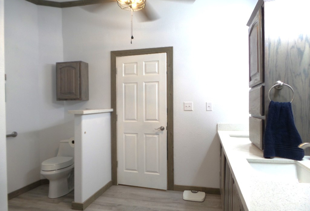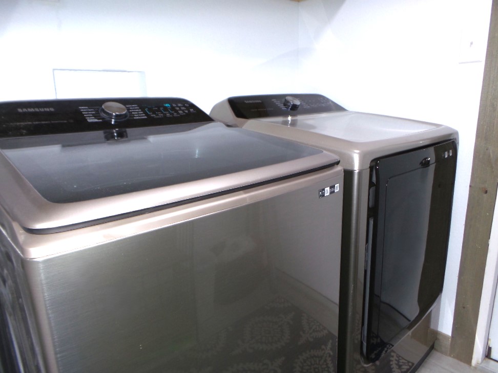 Down the hallway, there is a guest bathroom equipped with a walk-in shower and a high-rise toilet. Across from the bathroom is the first of two guest bedrooms—it's generously sized and fully furnished. Next, the laundry room includes a newer washer and dryer along with plenty of cabinetry. The second bedroom, further down the hall, also offers ample space.