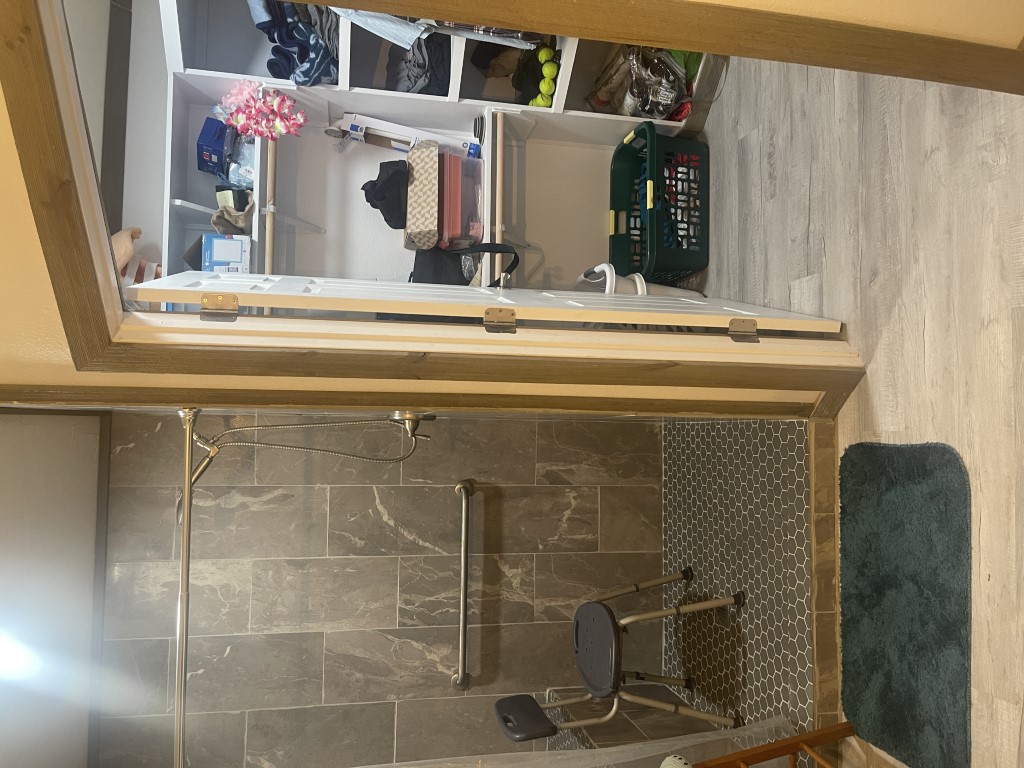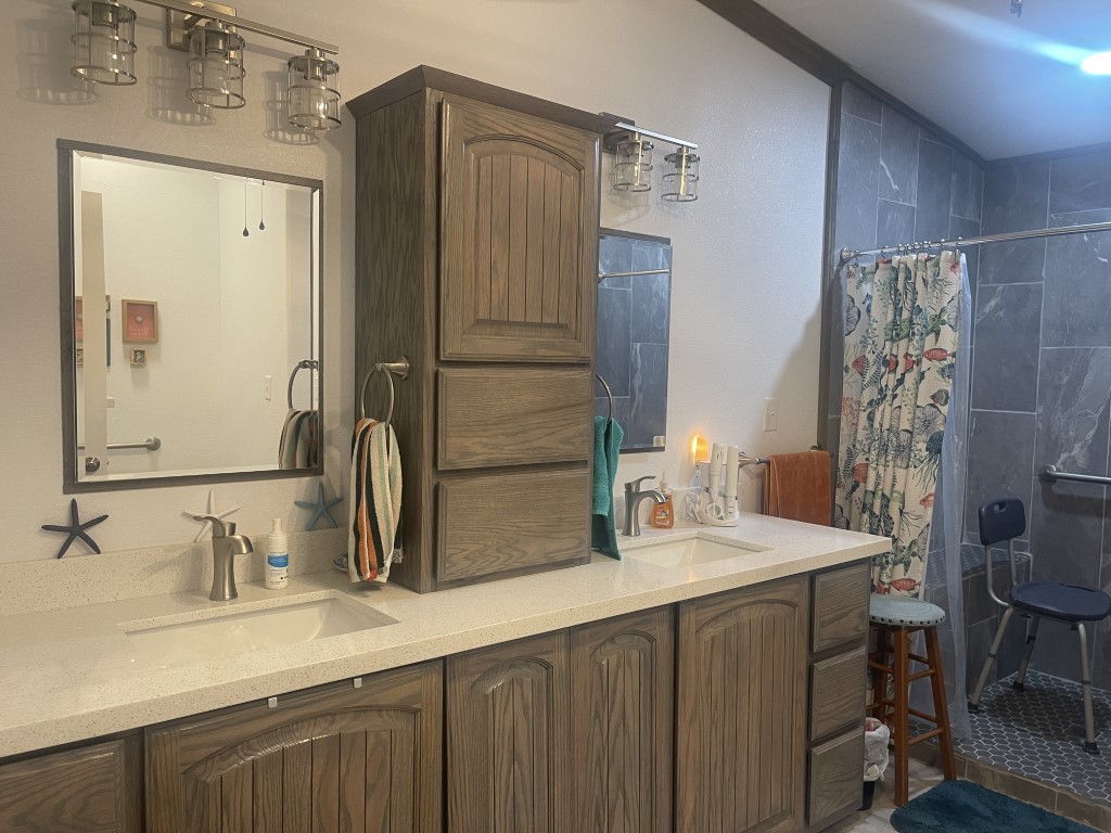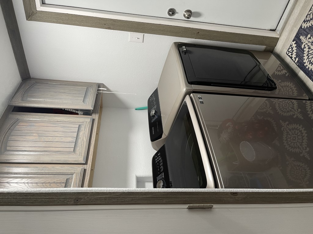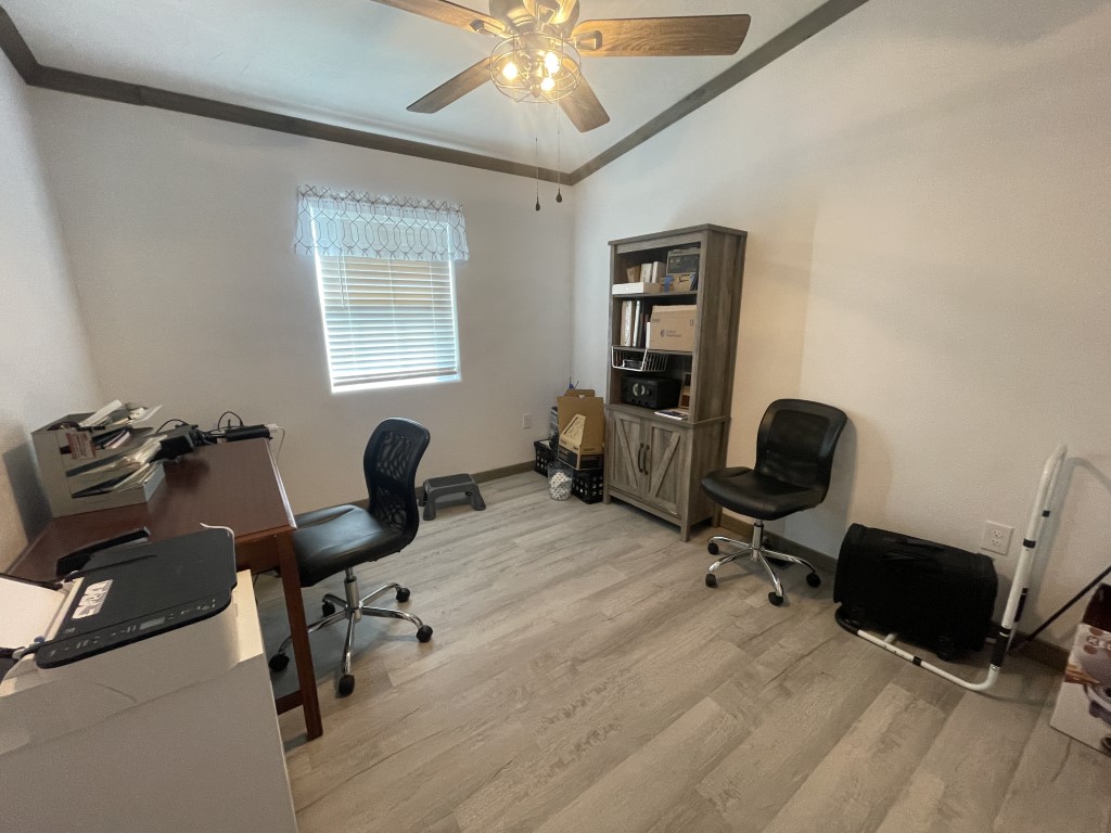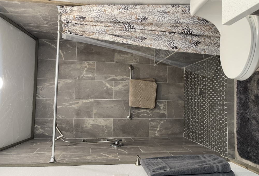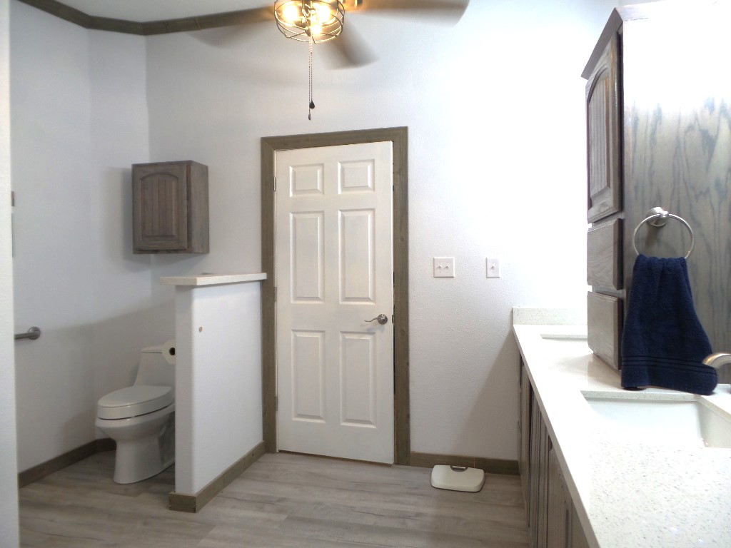Down the hallway, there is a guest bathroom equipped with a walk-in shower and a high-rise toilet. Across from the bathroom is the first of two guest bedrooms—it's generously sized and fully furnished. Next, the laundry room includes a newer washer and dryer along with plenty of cabinetry. The second bedroom, further down the hall, also offers ample space.