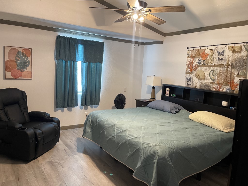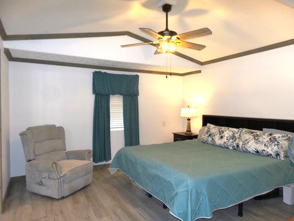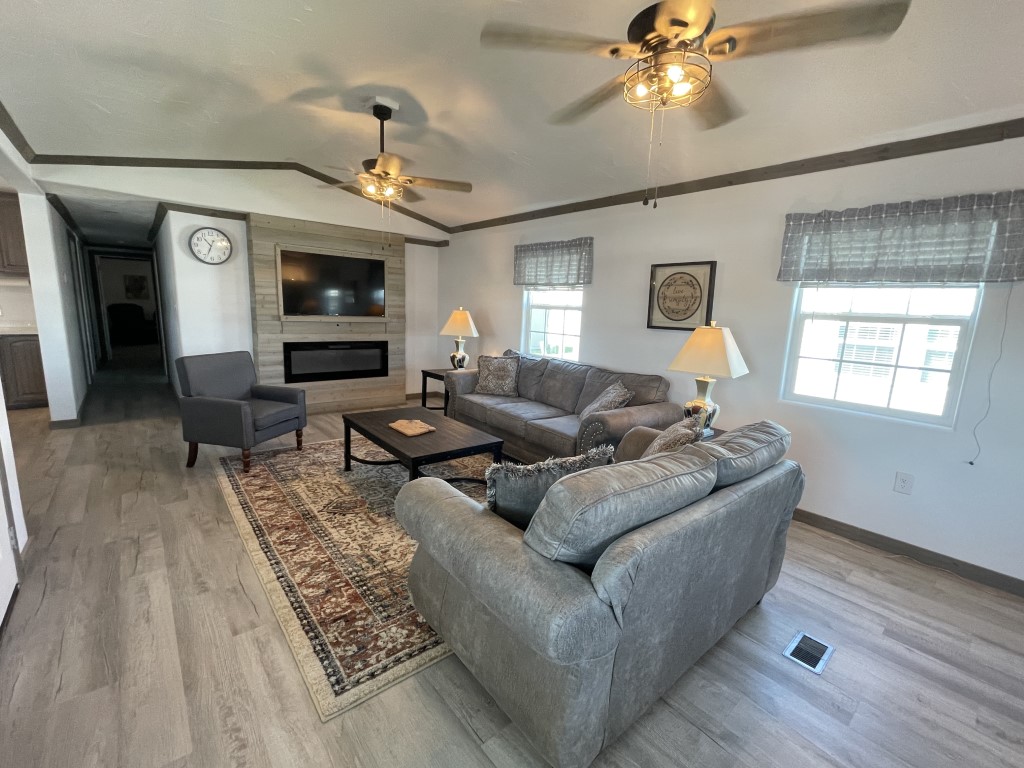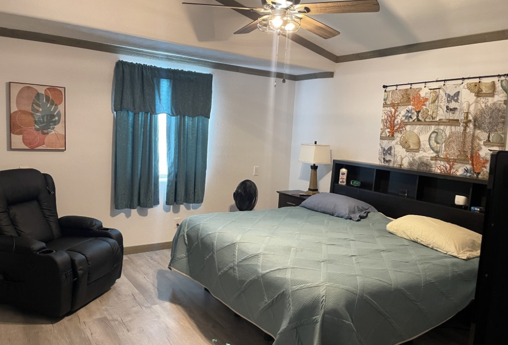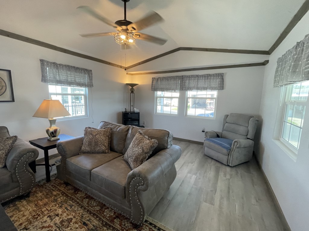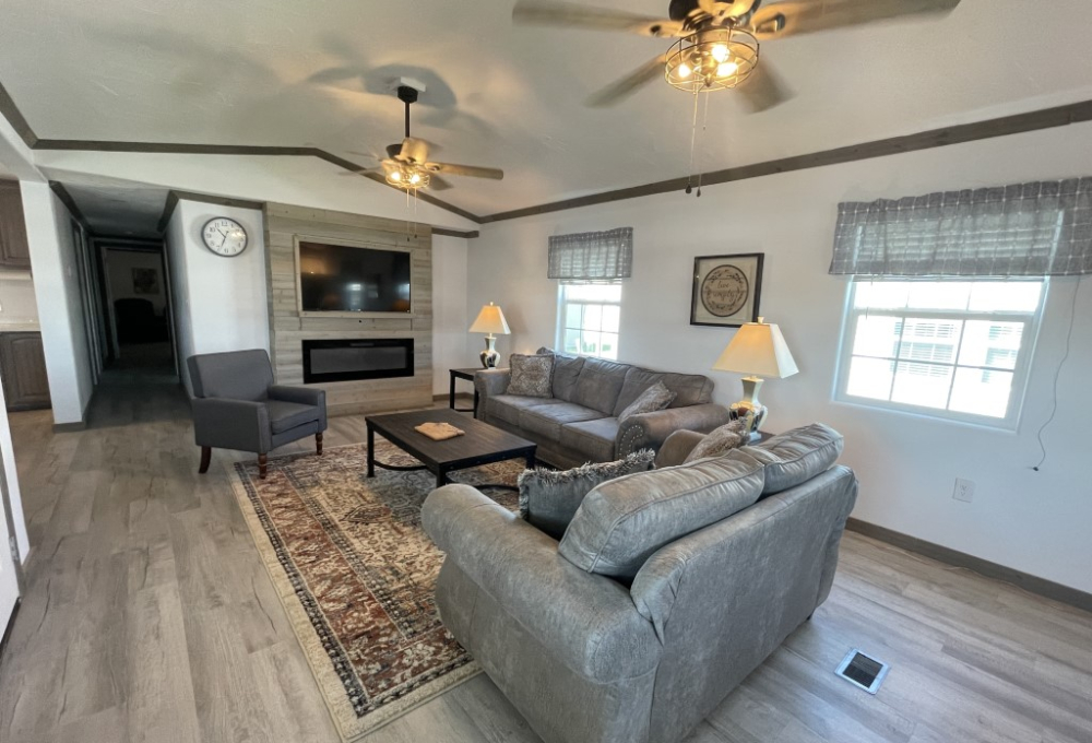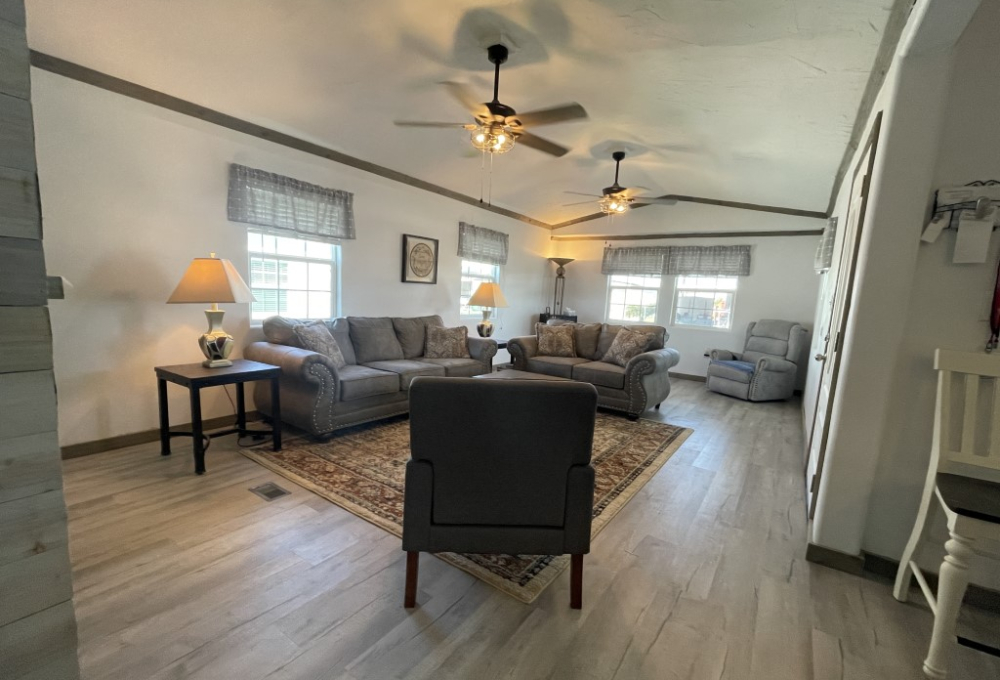 This beautifully remodeled Skyline manufactured home features three bedrooms, is handicap accessible, and is located in a fantastic 55+ community. The main home measures 14 x 64 feet, with an additional 14 x 49 foot extension, providing a total of 1,582 square feet of living space. Inside, you'll find updated contemporary furnishings, modern appliances, and wood laminate flooring throughout.