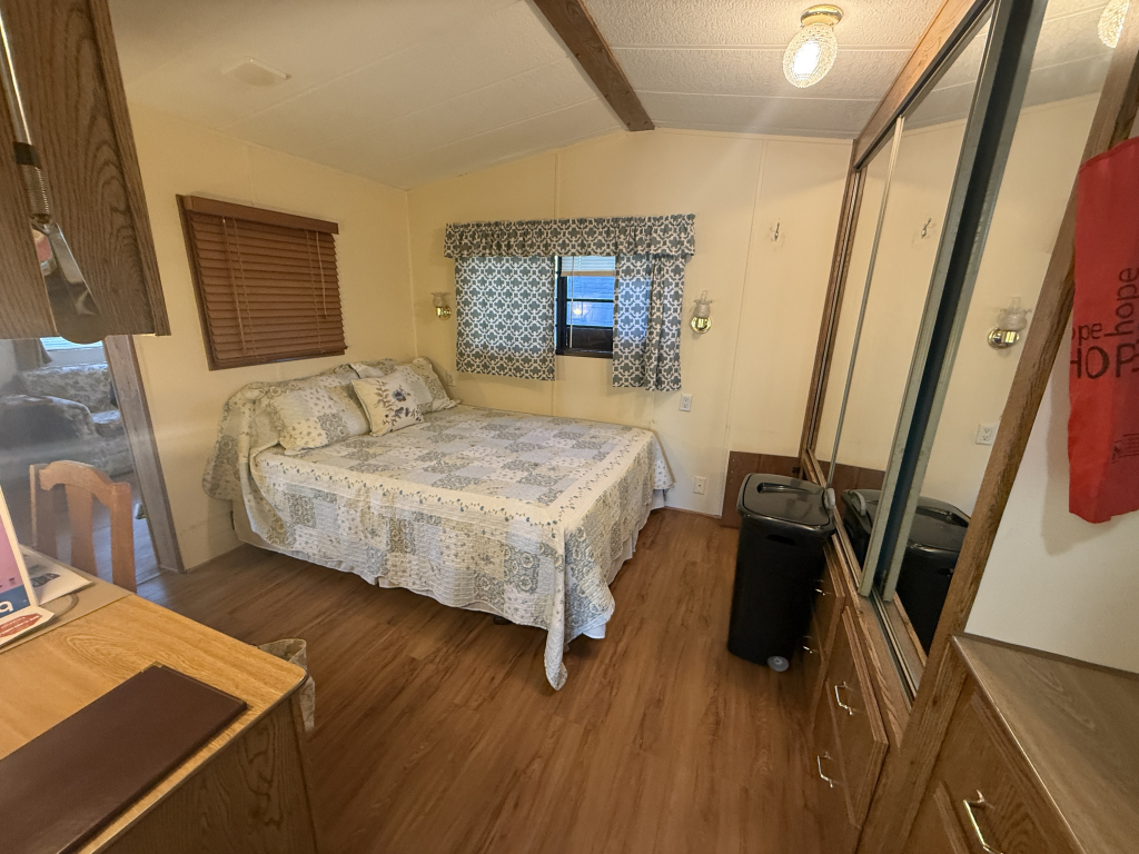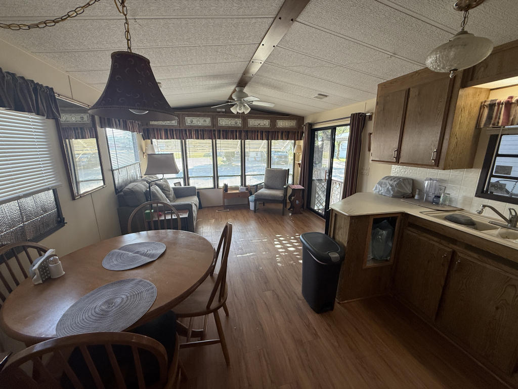 This charming 1995 Franklin home features one bedroom and one bath. The living room is located at the front of the home, followed by the dining area and kitchen. The bathroom is situated next, and the bedroom is at the back of the home, providing access to the 8 x 12 Texas room.