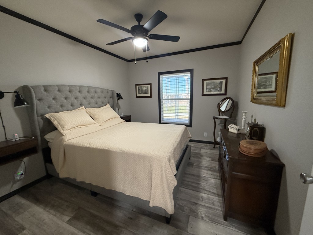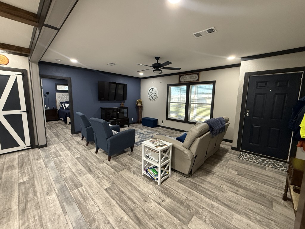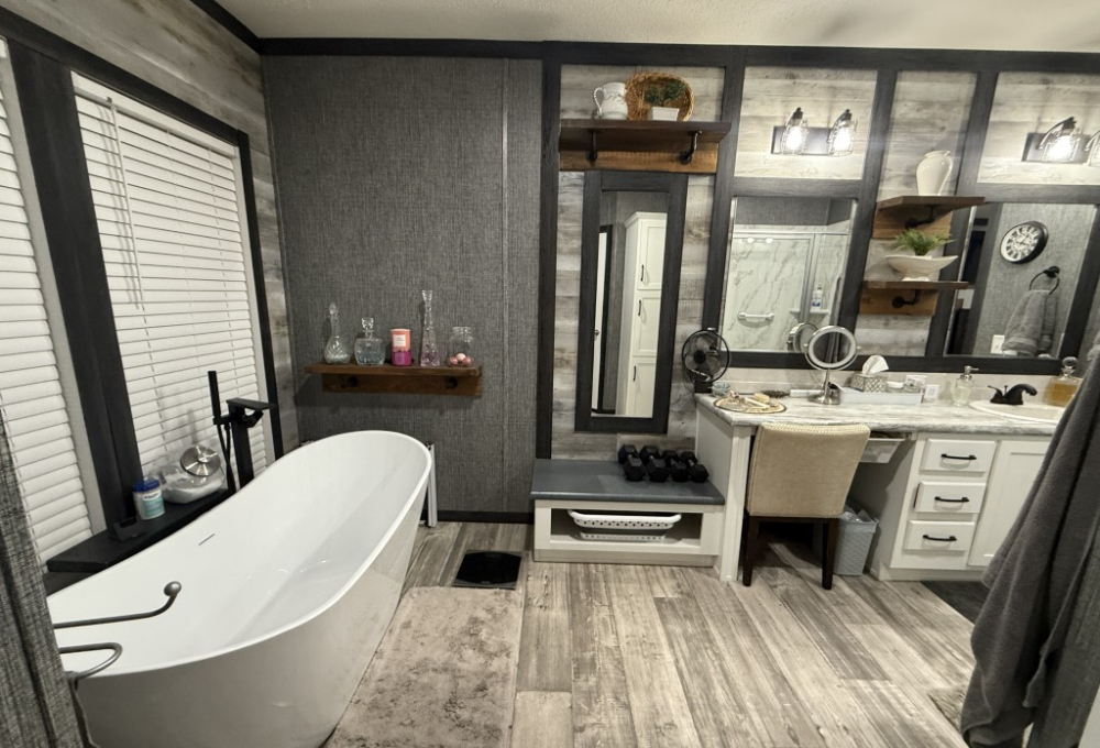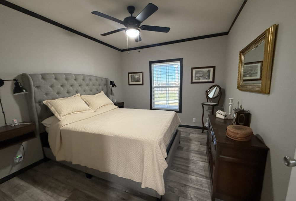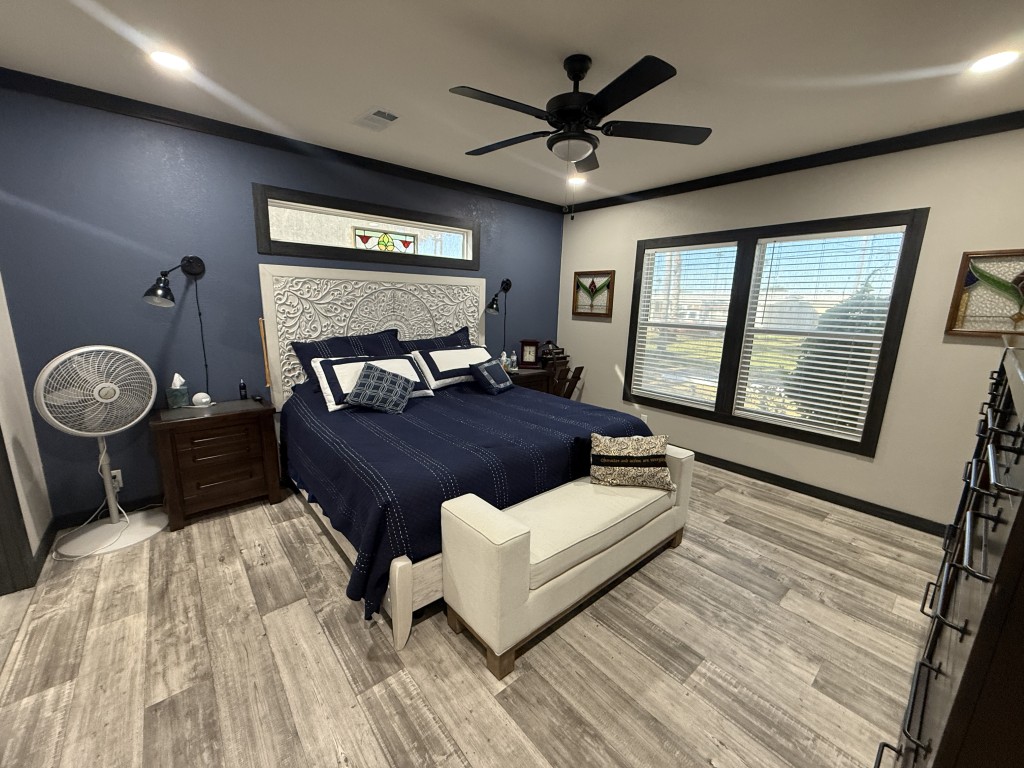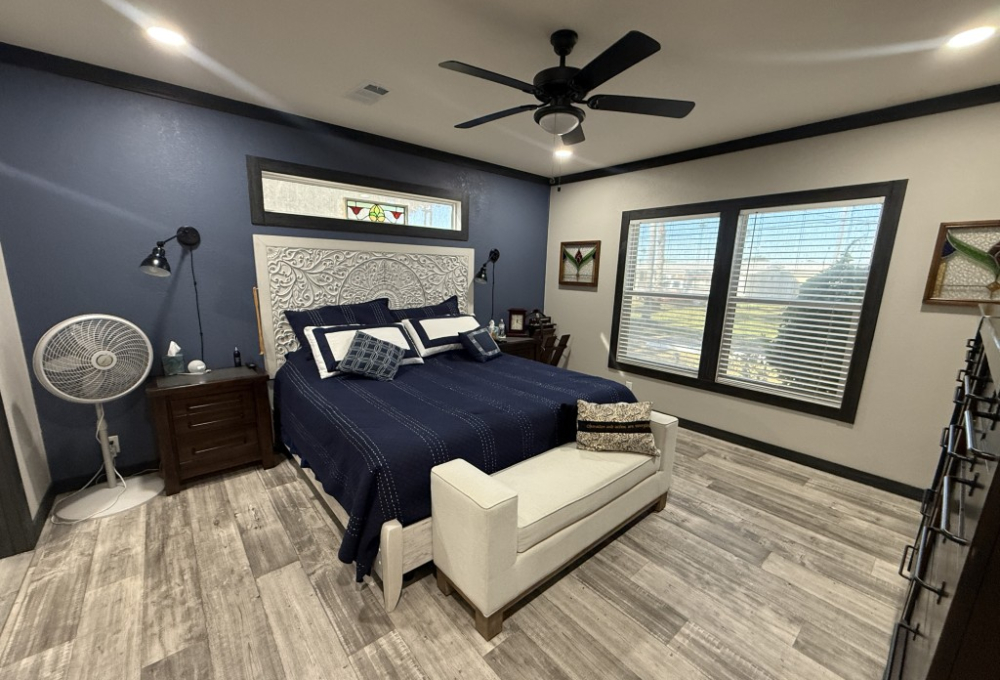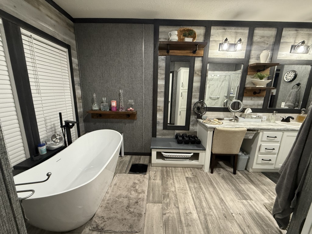 Spanning 30 x 56 feet, this residence boasts 1,680 sq ft of beautifully designed indoor living space. It features three spacious bedrooms, including a master suite with an en suite bathroom. The master bathroom is equipped with a separate toilet, a walk-in closet, a free-standing soaking tub, a custom vanity and sink, and a walk-in shower. The guest bathroom also includes a walk-in shower, ensuring comfort and convenience for all.