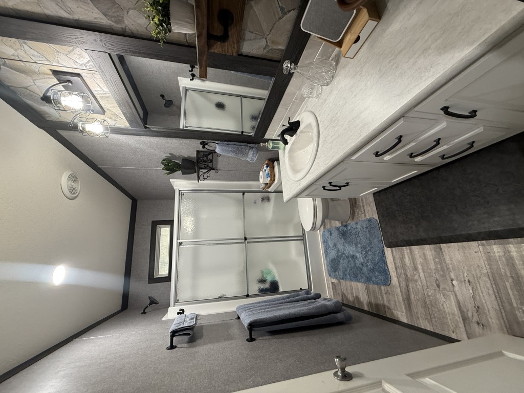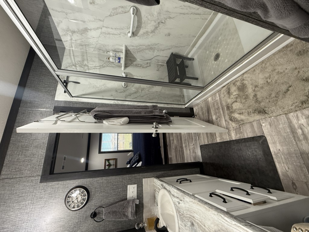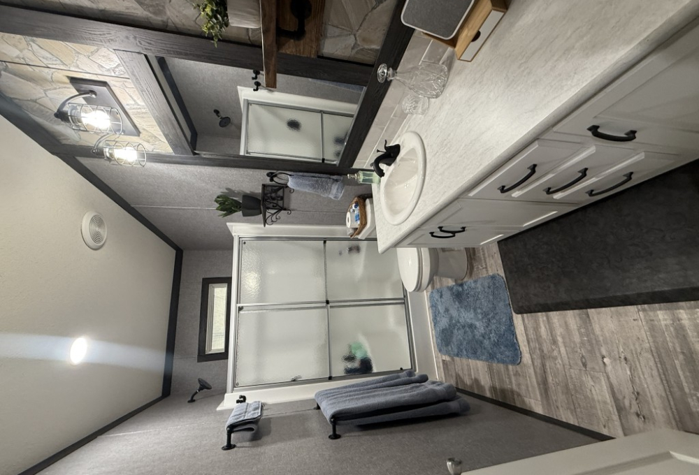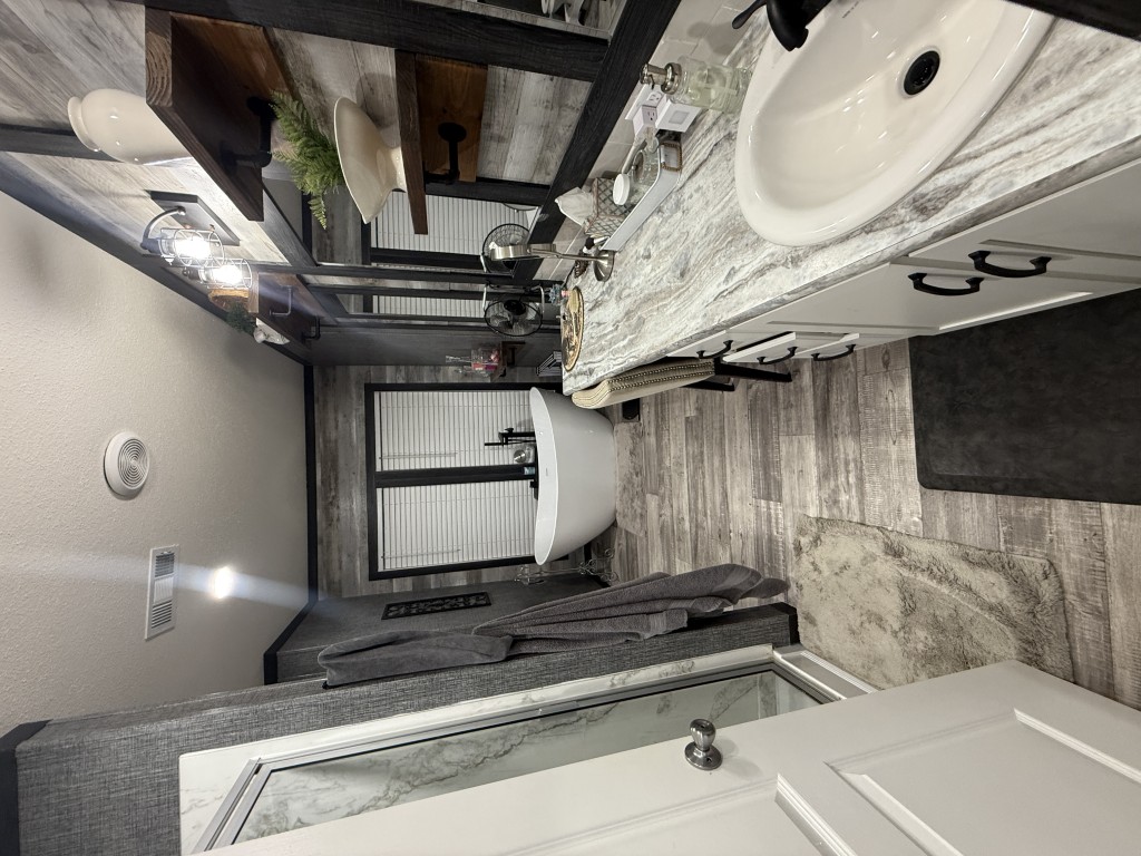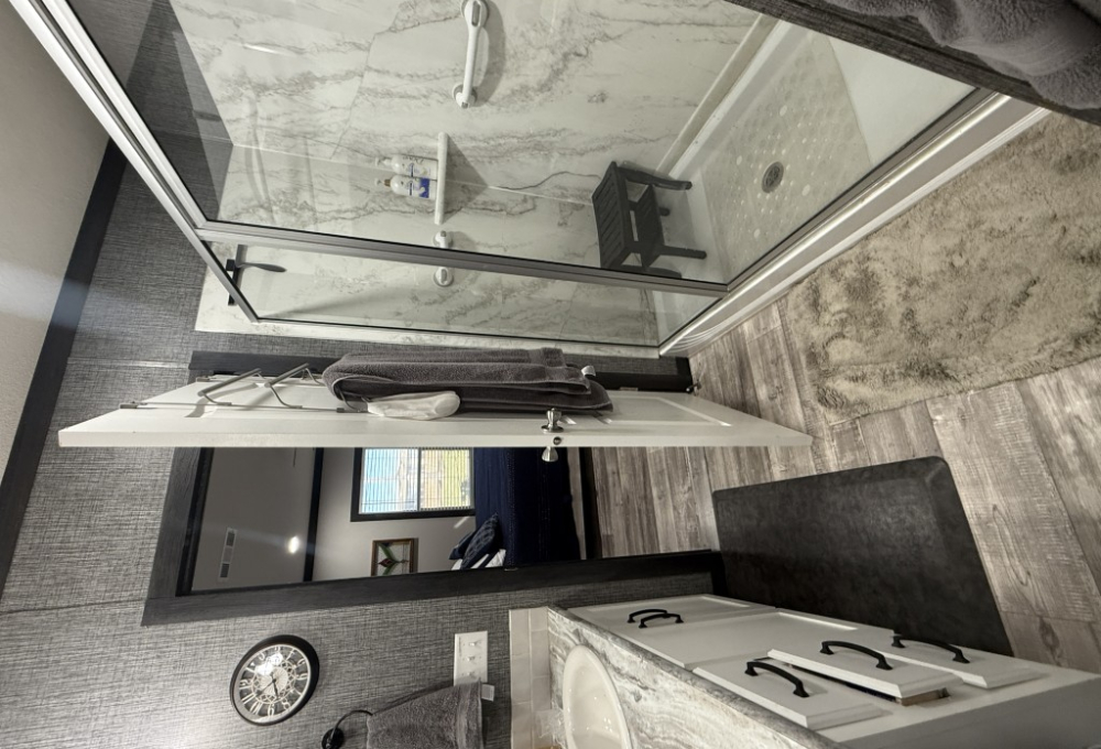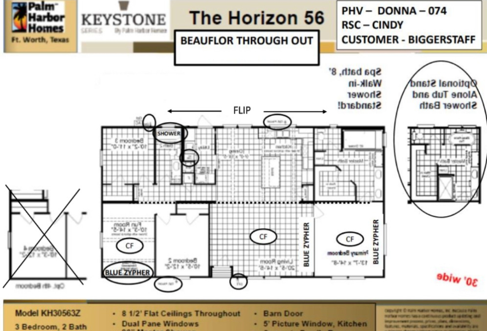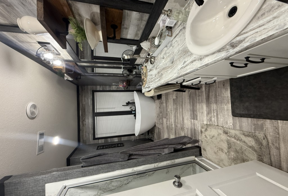 Spanning 30 x 56 feet, this residence boasts 1,680 sq ft of beautifully designed indoor living space. It features three spacious bedrooms, including a master suite with an en suite bathroom. The master bathroom is equipped with a separate toilet, a walk-in closet, a free-standing soaking tub, a custom vanity and sink, and a walk-in shower. The guest bathroom also includes a walk-in shower, ensuring comfort and convenience for all.