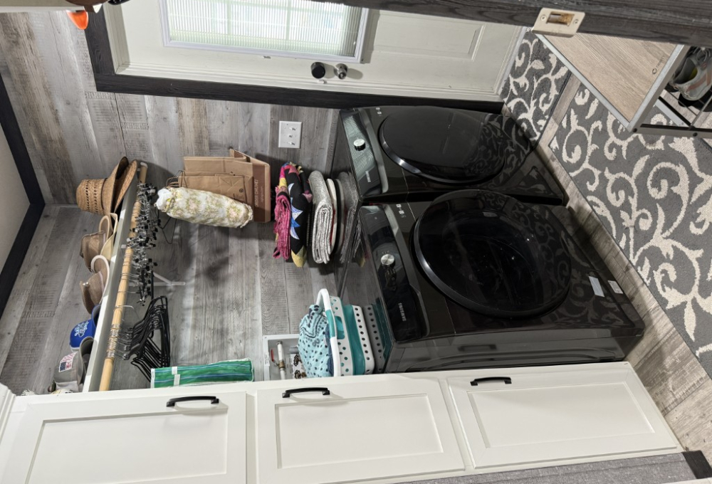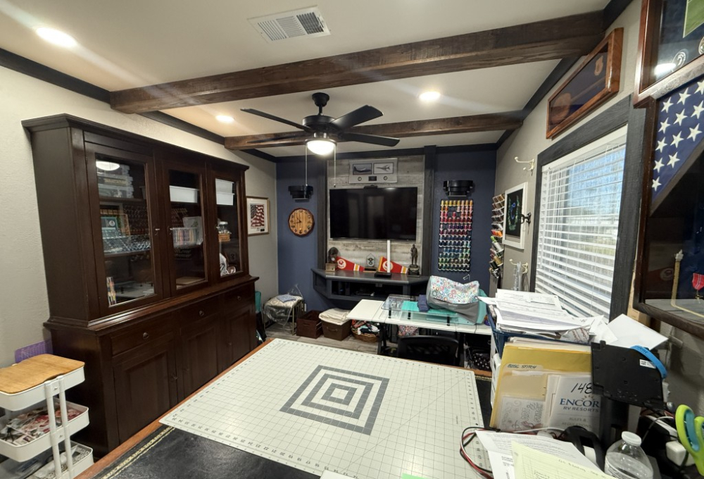 The park offers numerous activities, including mini golf, a sewing room, a library, RC racing, bocci ball, outdoor tennis and pickleball, a woodshop, shuffleboard, an onsite storage lot for RVs or trailers, laundry facilities with full bathrooms including showers, an indoor mail room, a fitness room, billiards with new LED lighting and new felt tops, a card room, a craft room, a dog park with a dog wash, and a swimming pool.