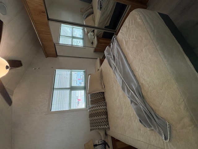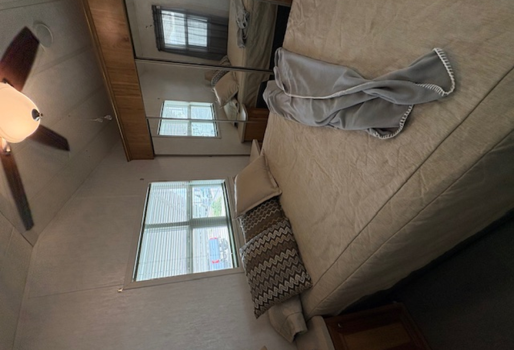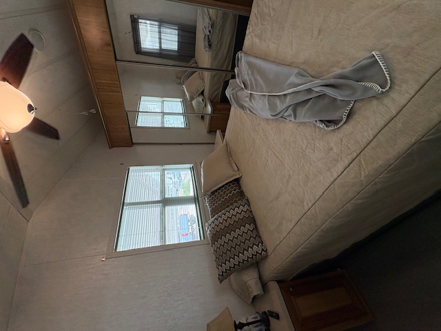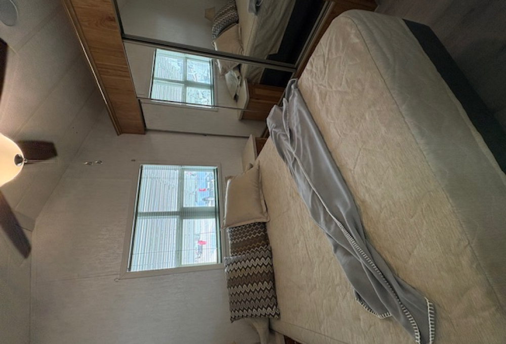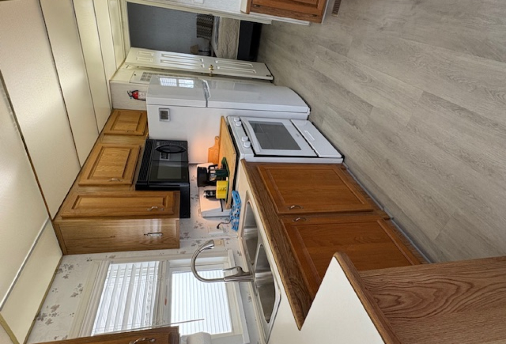 The living area is spacious with two sofas and a recliner. The dining space has a buffet with cabinets above and table with 4 chairs. There is an abundance of kitchen cabinets and counter space and newer full-size appliances. The bath has a large ceramic tile step-in shower and white vanity and cabinets. In the bedroom is a queen bed with new mattress and super closet and storage space.