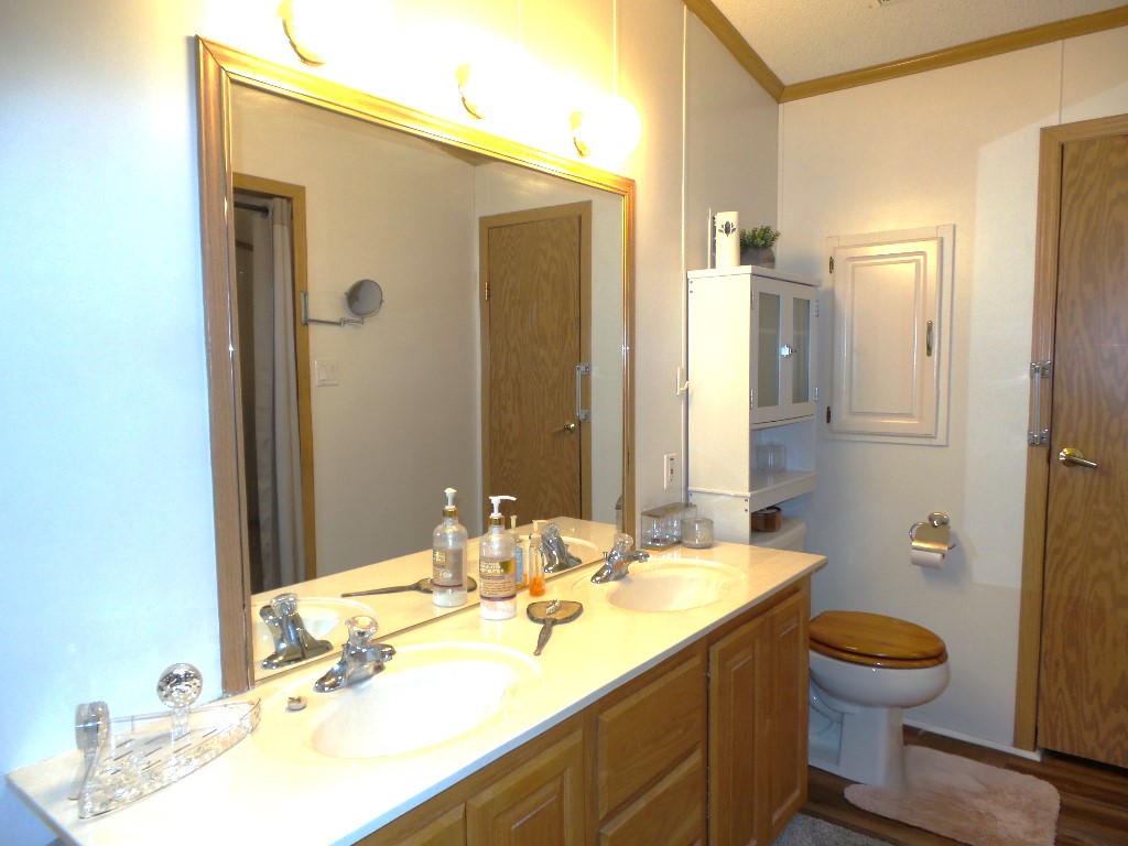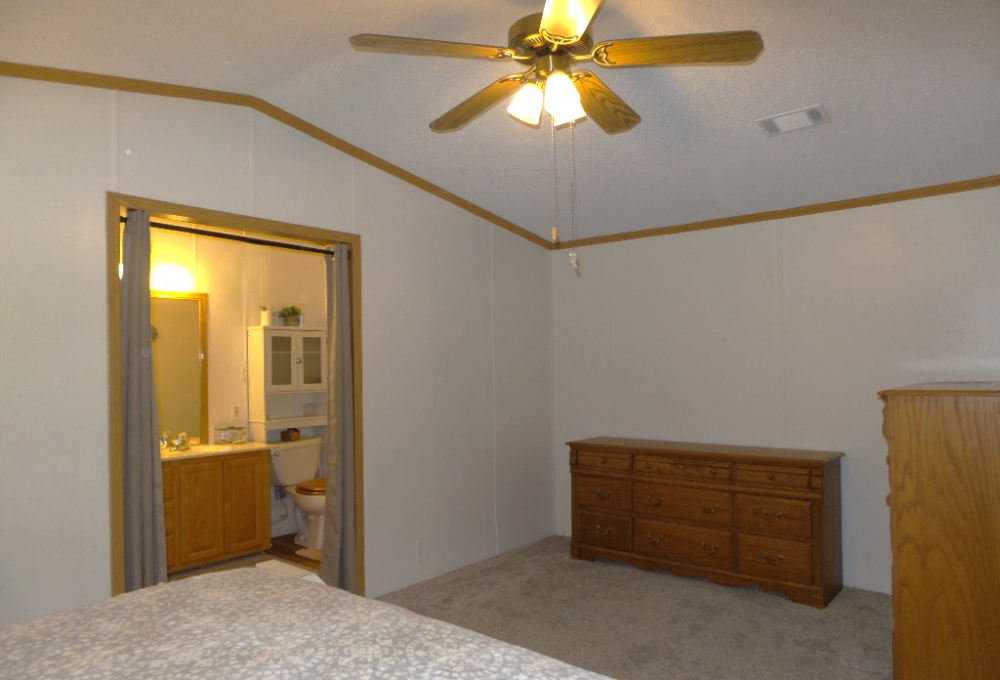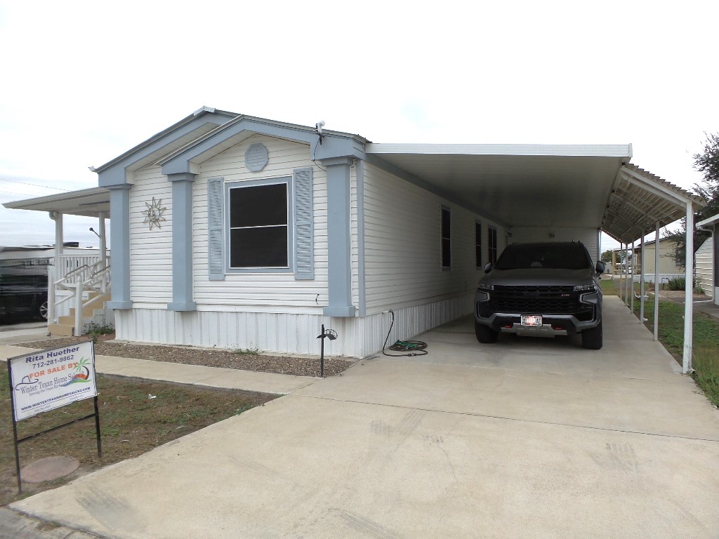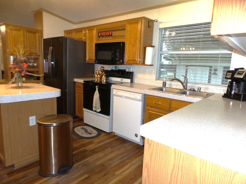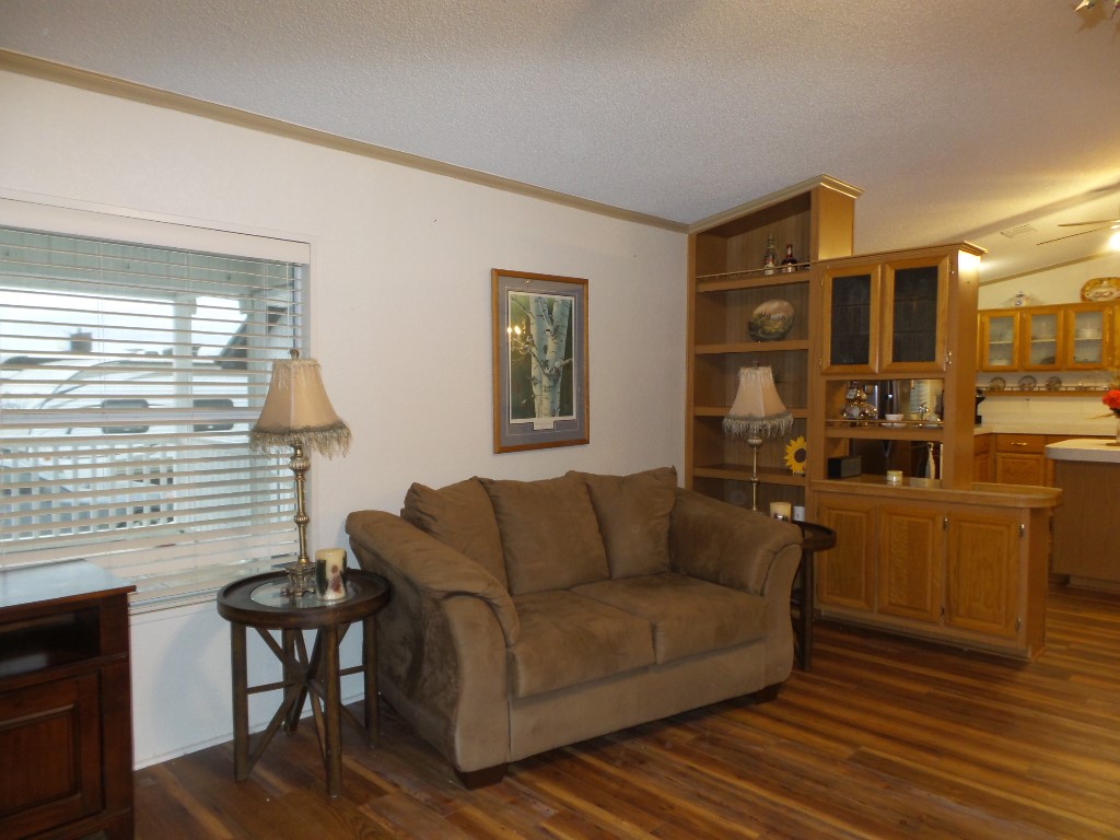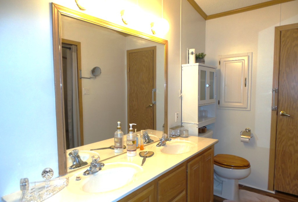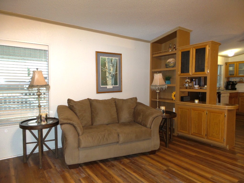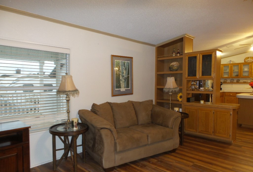 Oak Creek 18x68’ (1224 sq ft) Manufactured home with 2 bedrooms, 2 bathrooms, 2 decks & 2 sheds with extensive parking! Driving up to this home you take note of the parking by the huge storage shed & the spacious deck with a privately fenced patio behind it. Entering the front door is a spacious Livingroom with a wine-colored sofa & matched side chair, plus a love seat with lamps & side tables, facing a table which can accommodate an over-sized tv, all upon lovely wood flooring stretching thru the main rooms. A dividing counter & display area separates the kitchen, featuring a center island & L shaped cabinets & countertops with updated appliances surrounding 2 sides. The drop leaf table is adjacent to the window & a built in hutch. Around the corner is a pantry, then near the back door is a laundry room including a stackable W/D, with a sorting table & overhead cabinets leading to the back door exiting to a large deck and the attached shed/workshop. Beyond the laundry room is the carpeted M bedroom with K bedroom set/dressers, walk in closet & en-suite bathroom. The bathroom features a walk-in shower, linen closet & dual, sinks. At the front of the home is an office/guest/sewing room, with the main corner bathroom including a T/S. With updated appliances, A/C & W/H, steel roof, vinyl siding & sunscreens are energy efficient! The extensive outdoor spaces provide lovely options & great storage within all the sheds! This truly is a spacious home with an extra 18’ width & very nice with textured walls & hard wood flooring. Call Rita at 712-281-9862 for a tour of this home & resort community with numerous activities & friendly people waiting to welcome you to the mid valley & some of the most economical rent.