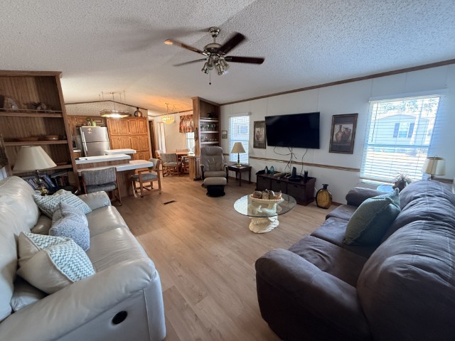 Chic new laminate flooring runs throughout, and the whole place runs on electric power for simple living. Outside, enjoy the low-maintenance landscaping, solid cement walkways, a roomy 13 x 18 carport, and a 12 x 11 garage with an electric opener. As a bonus, you can even snag a golf cart with your new place—cruising the Resort has never been easier.