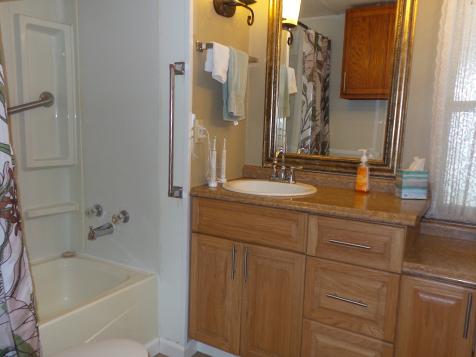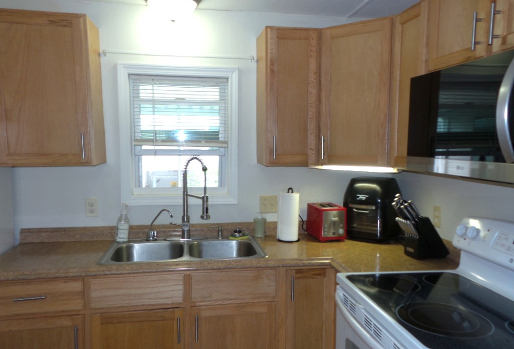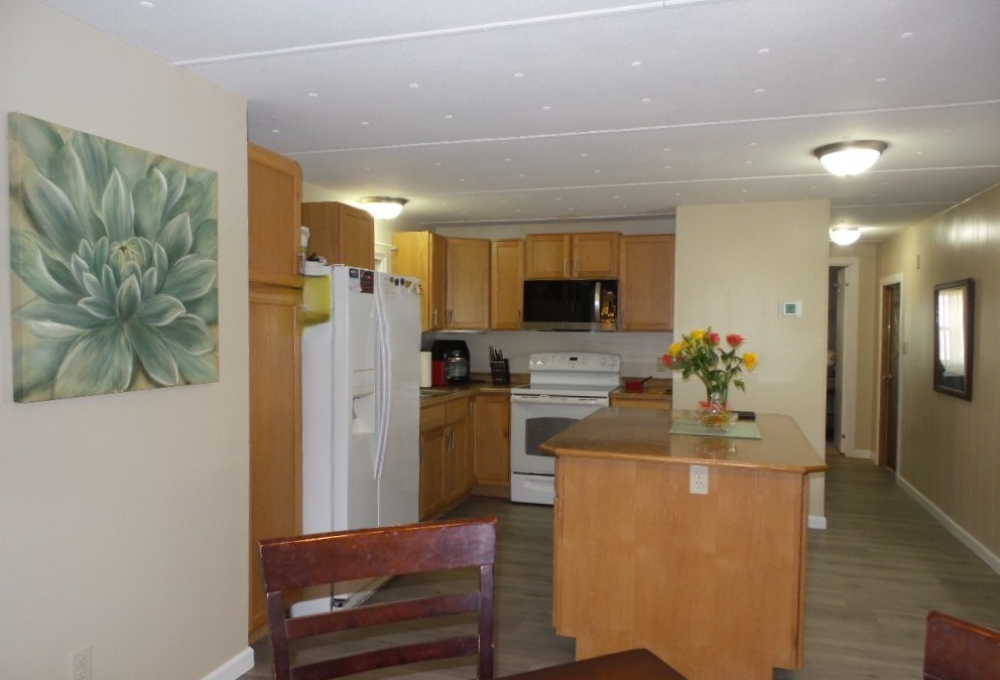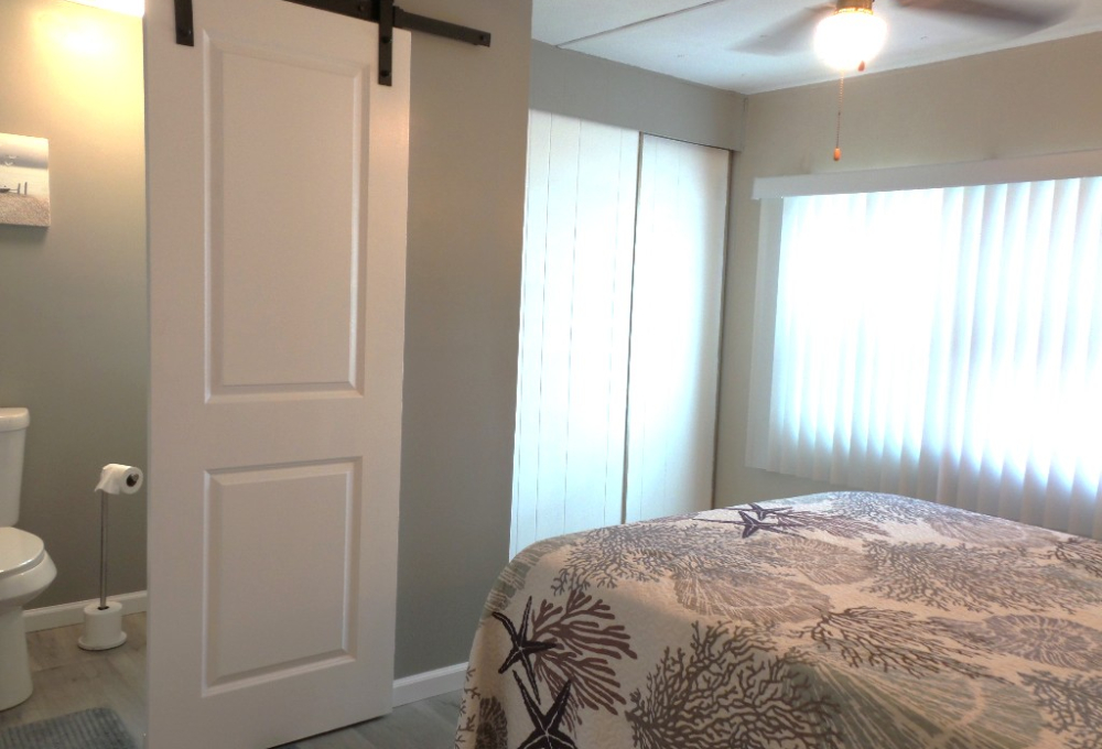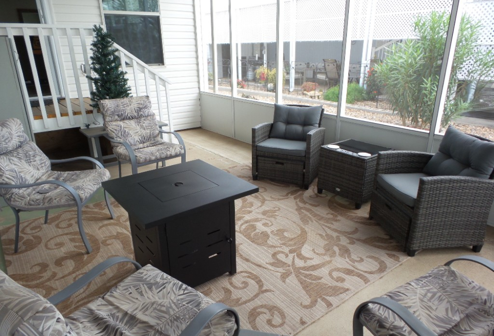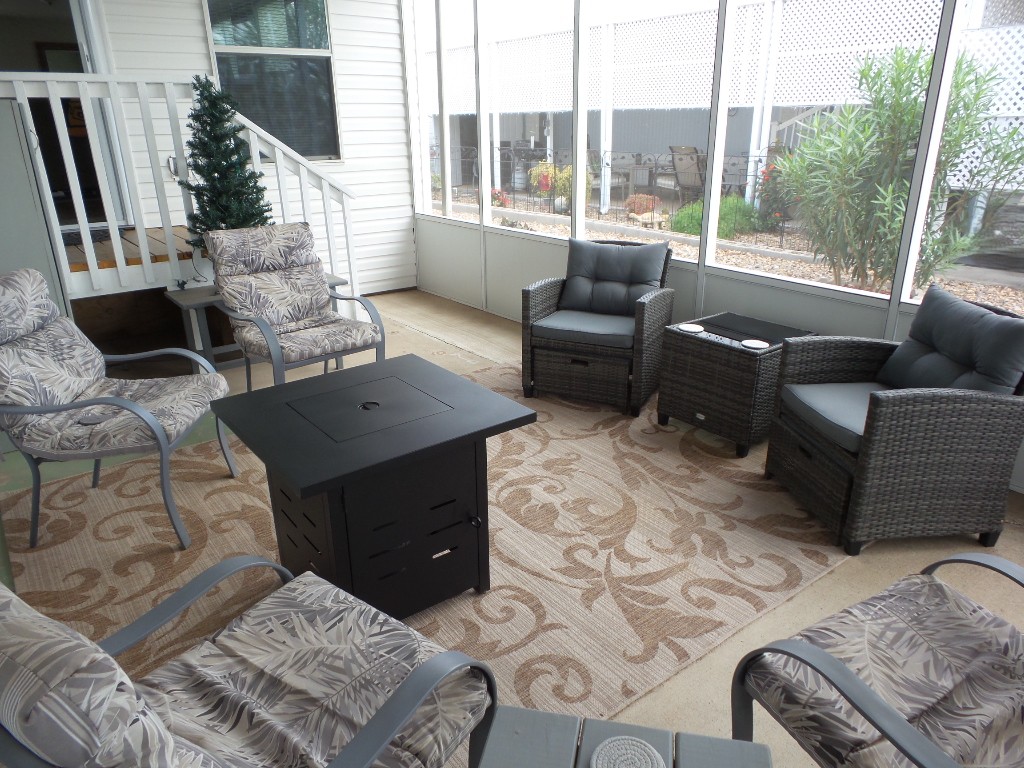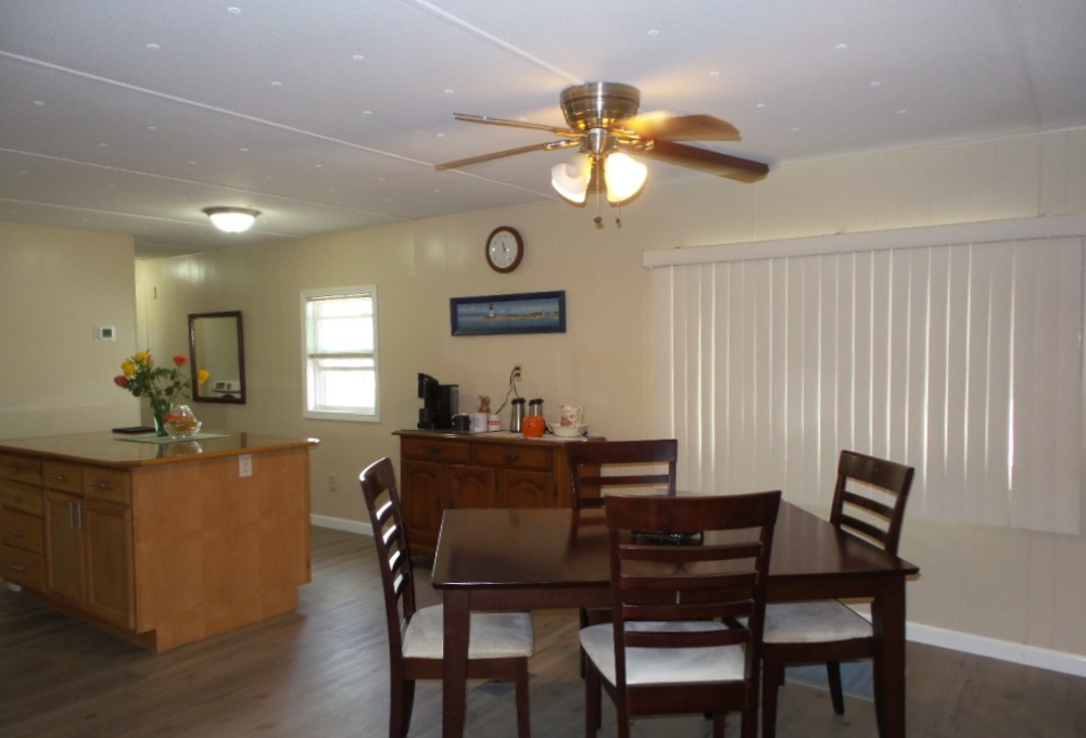 Skyline 2 Bedroom, 2-bathroom, Manufactured home 14x60’ plus 12x25 TX room adds to total of 1140 sq ft of living space. Driving into the carport you note a space for the golf cart too. A screen porch provides relaxation & entertainment options, with inviting patio furniture, perfect for our coastal breezes & views of the rock & tropical plant landscaping. Step up to enter the Tx room, with a desk & electric reclining furniture facing the TV. At the back of the room is an exit to the backyard patio & a huge shed/workshop! The master bedroom is at the back of the home with a barndoor entrance to the ensuite bathroom, featuring a new vanity, stool & walk-in shower. An extra walk-in closet adds more clothing storage as well. The dining room is an open concept from the TX room with a kitchen island & updated oak cabinets & countertops within this large kitchen. Along the hallway is the Samsung W/D set in a nook, near the main guest bathroom & bedroom, towards the front of the home. Great outdoor spaces add ambiance to this pristine home, with painted walls, updated fixtures, appliances, A/C, lighting + laminate flooring in all the main areas & an inviting master suite! A must-see move-in ready home with nice landscaping with low maintenance including a newer shingled roof. Gas golf cart sold separately. CALL Rita for a tour appointment at 712-281-9862