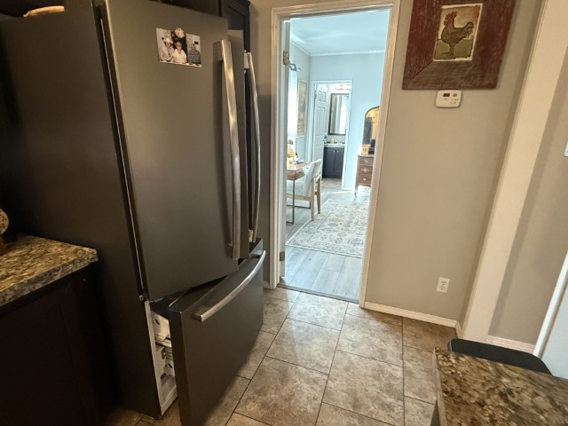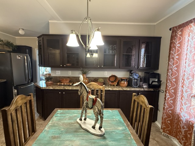 The dining area features dark wood cabinets over a buffet counter, a matching dining table, and more large windows for added warmth and charm. The kitchen offers newer appliances, including an attractive armoire style refrigerator with a bottom freezer. Adjacent to the kitchen is a laundry room with a convenient exterior door.