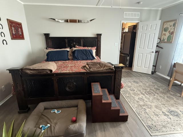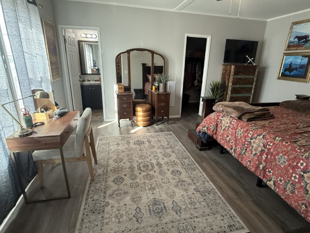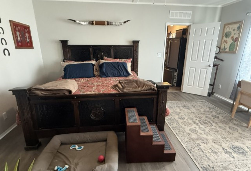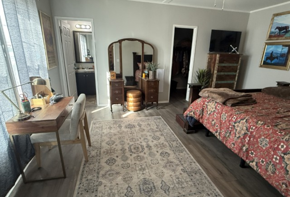 At the rear of the home, you’ll find the large master bedroom, decorated in Texan style with coordinating furnishings and wall décor. The master boasts a walk in closet and an ensuite bathroom with a tub/shower combo, toilet, and single‑sink vanity.