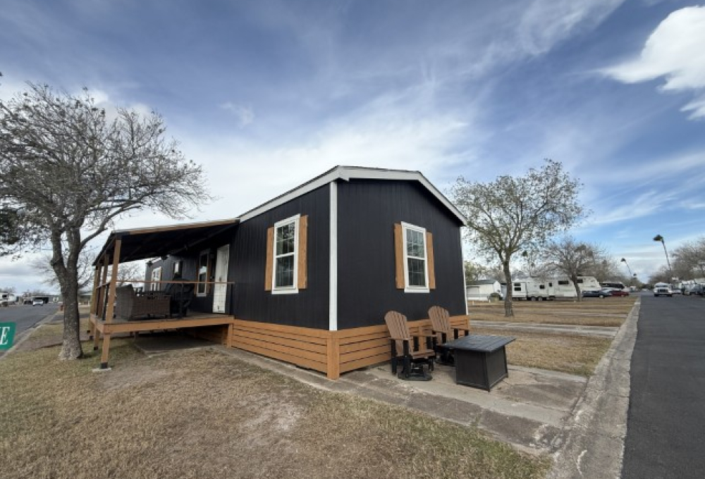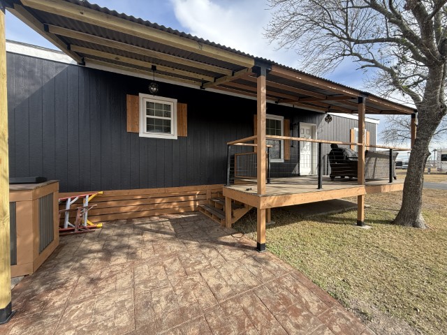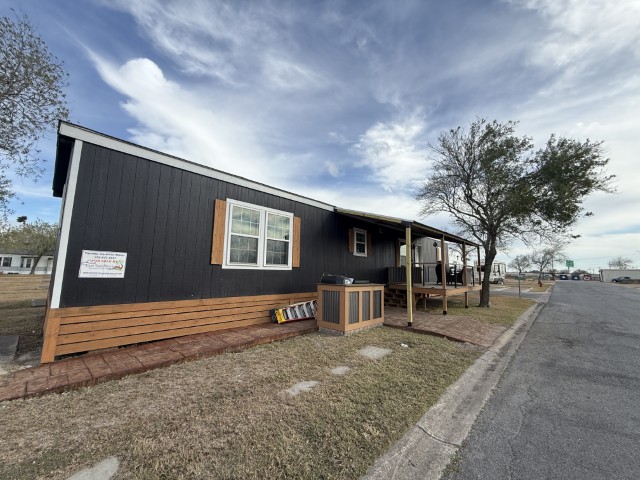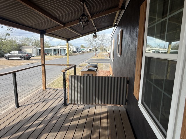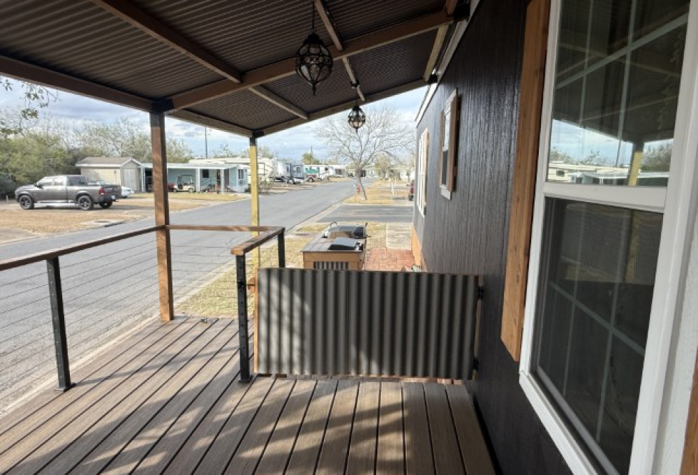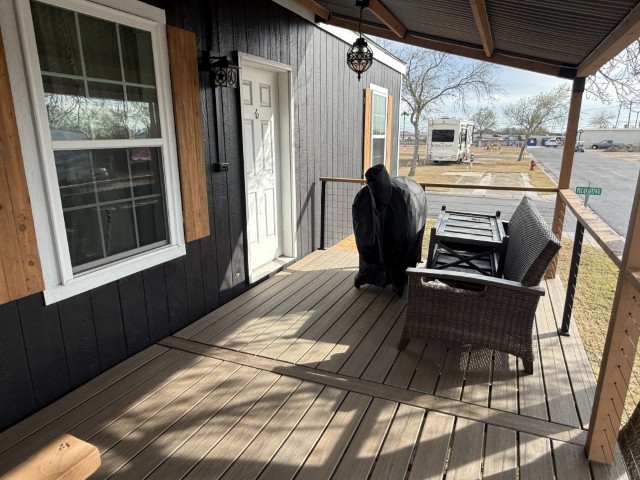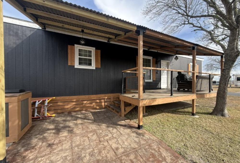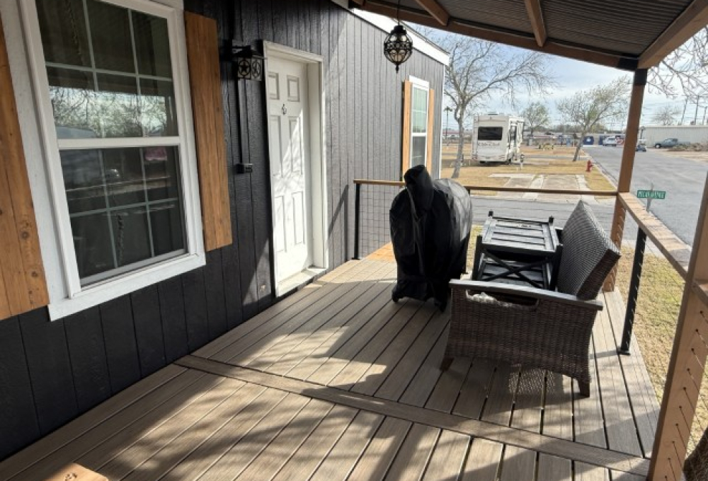 Located on a quiet street at the back of the park, the property features two large shade trees and wonderful outdoor living spaces. As you arrive, you’ll find a designated parking spot and a stamped and stained concrete walkway leading to the front deck. Along the way, you’ll pass the impressive outdoor kitchen, complete with a Blackstone flat top grill and a pizza oven. The spacious front deck also includes a BBQ grill and patio furniture — perfect for enjoying those warm Texas evenings.