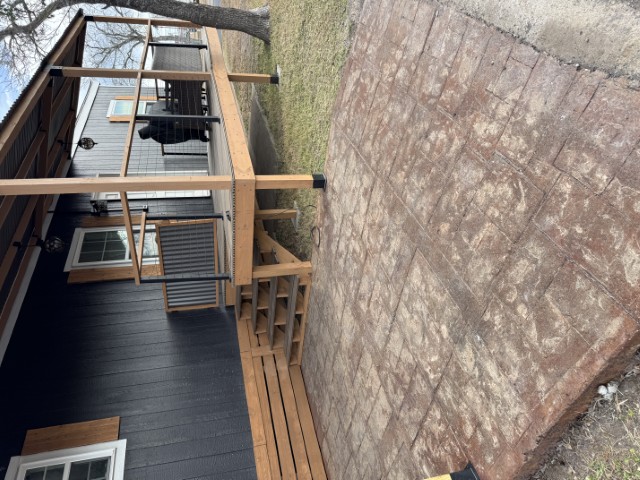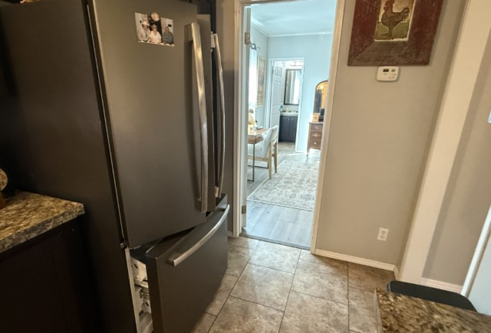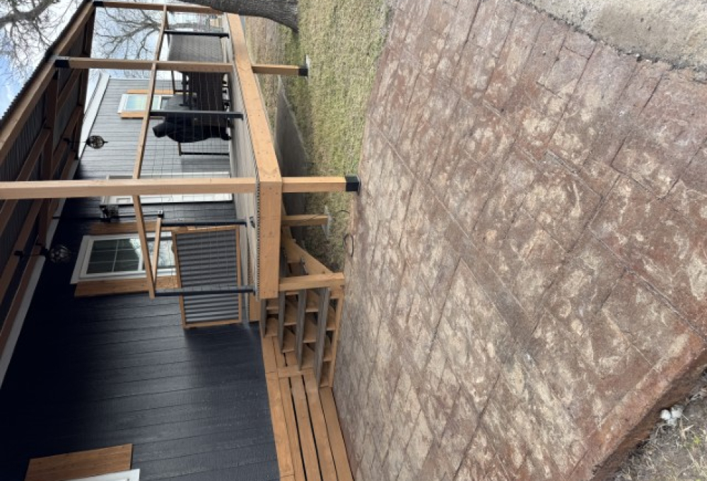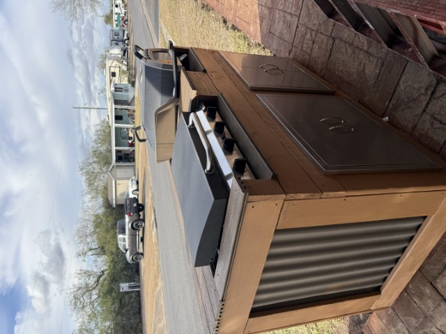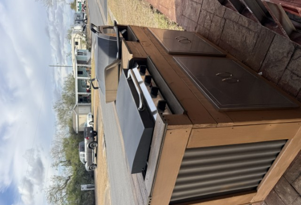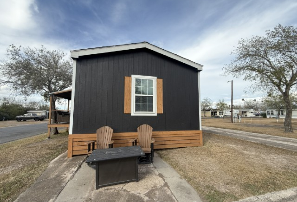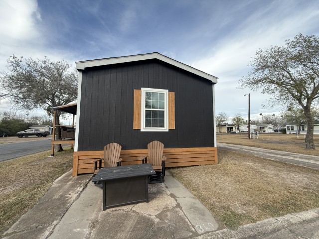 Located on a quiet street at the back of the park, the property features two large shade trees and wonderful outdoor living spaces. As you arrive, you’ll find a designated parking spot and a stamped and stained concrete walkway leading to the front deck. Along the way, you’ll pass the impressive outdoor kitchen, complete with a Blackstone flat top grill and a pizza oven. The spacious front deck also includes a BBQ grill and patio furniture — perfect for enjoying those warm Texas evenings.