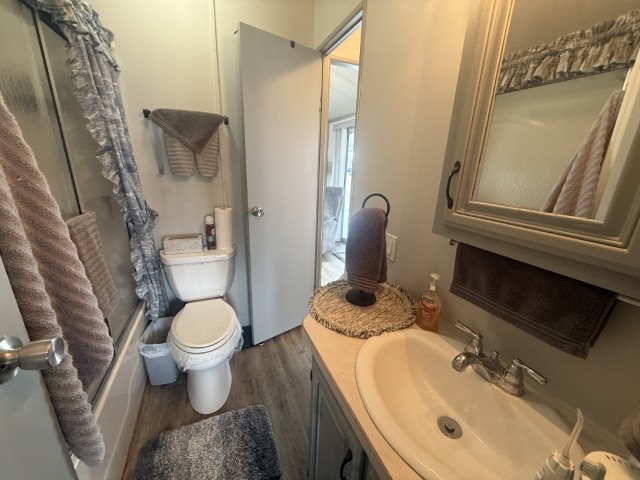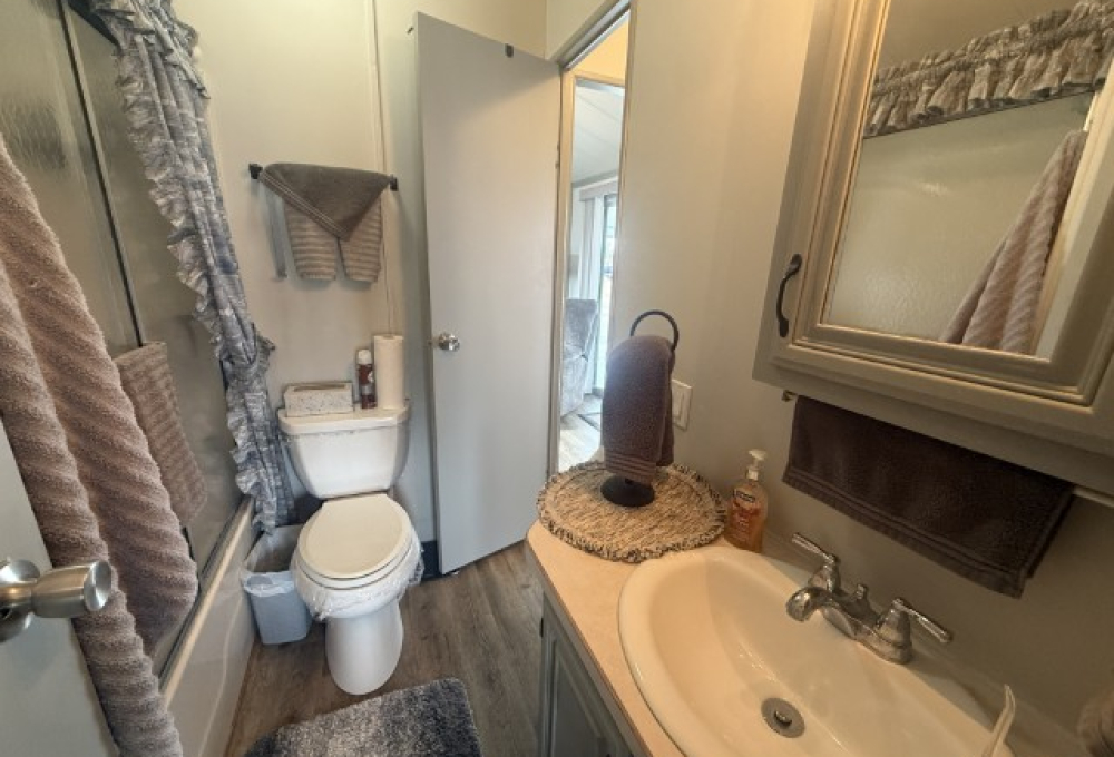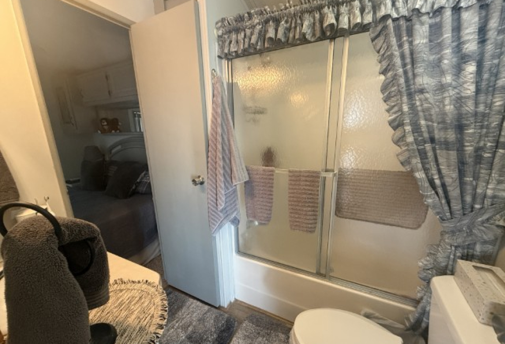 - The bathroom includes a walk-in shower, toilet, and a single-sink vanity.