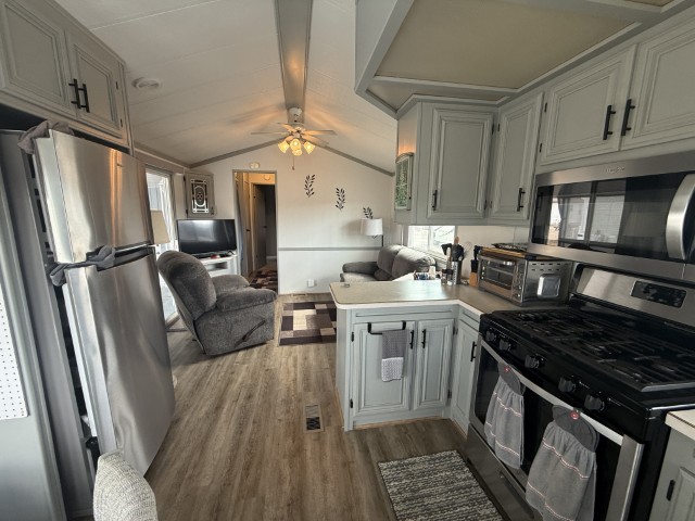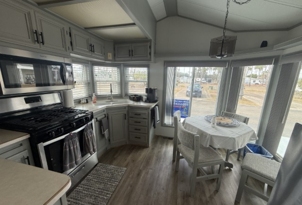 - The kitchen boasts an eat‑in dining area surrounded by double‑pane windows with 2-inch blinds, along with generous counter space, ample cupboards, and a propane stove.