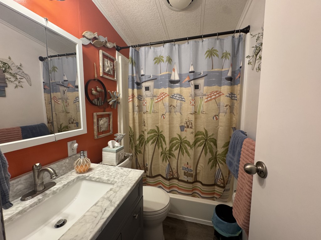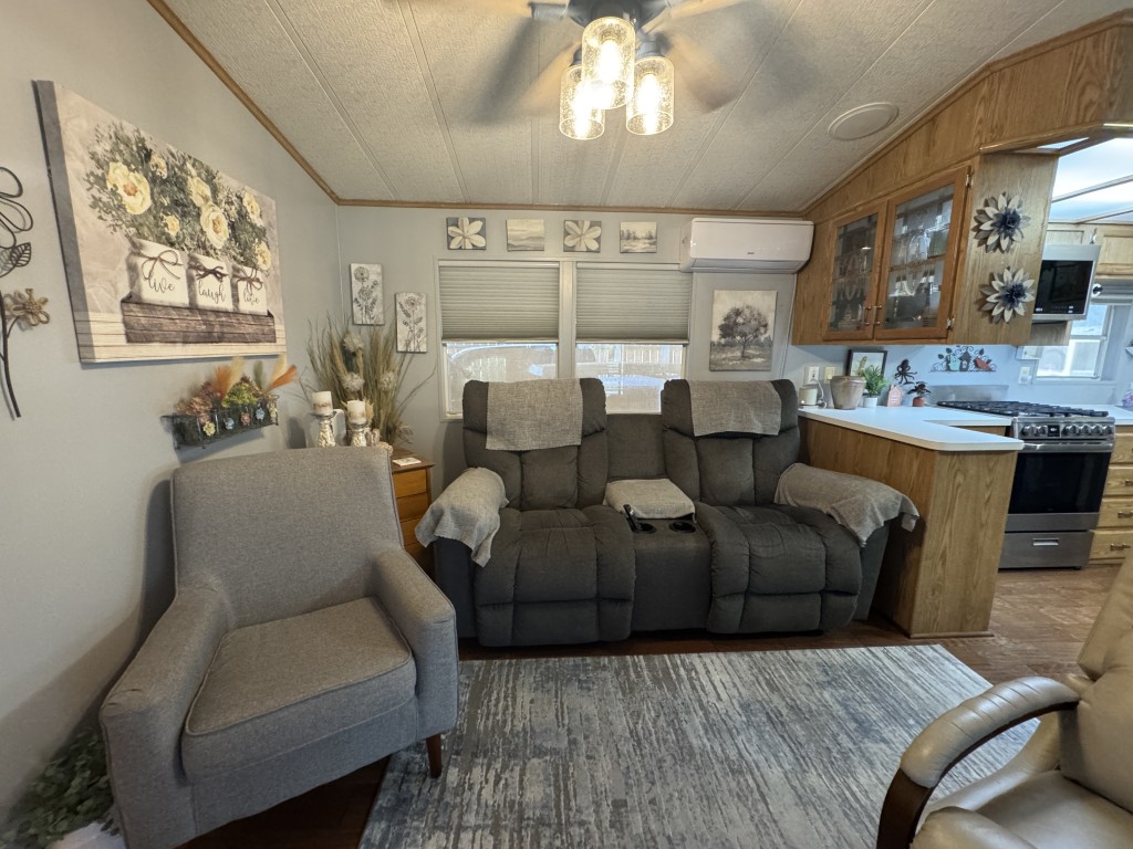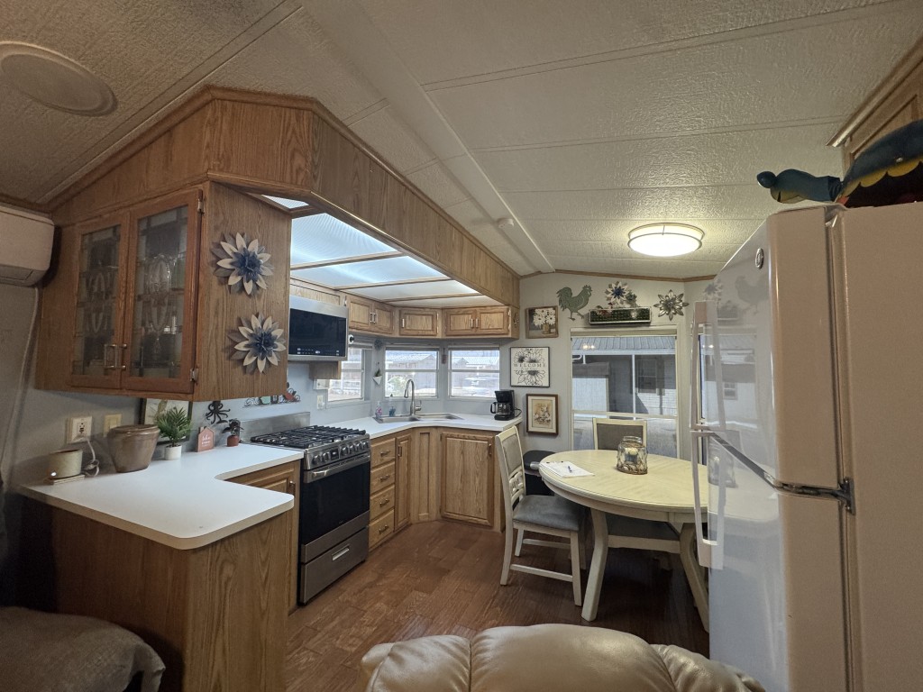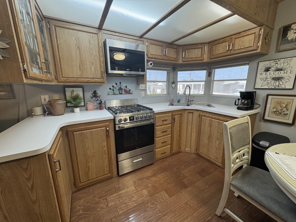 The home features a versatile Texas room, which can serve as an additional bedroom or flexible living area. The bathroom is equipped with a walk-in shower for ease and comfort. A front eat-in kitchen comes complete with a gas stove, refrigerator, and microwave, making meal preparation simple and enjoyable.